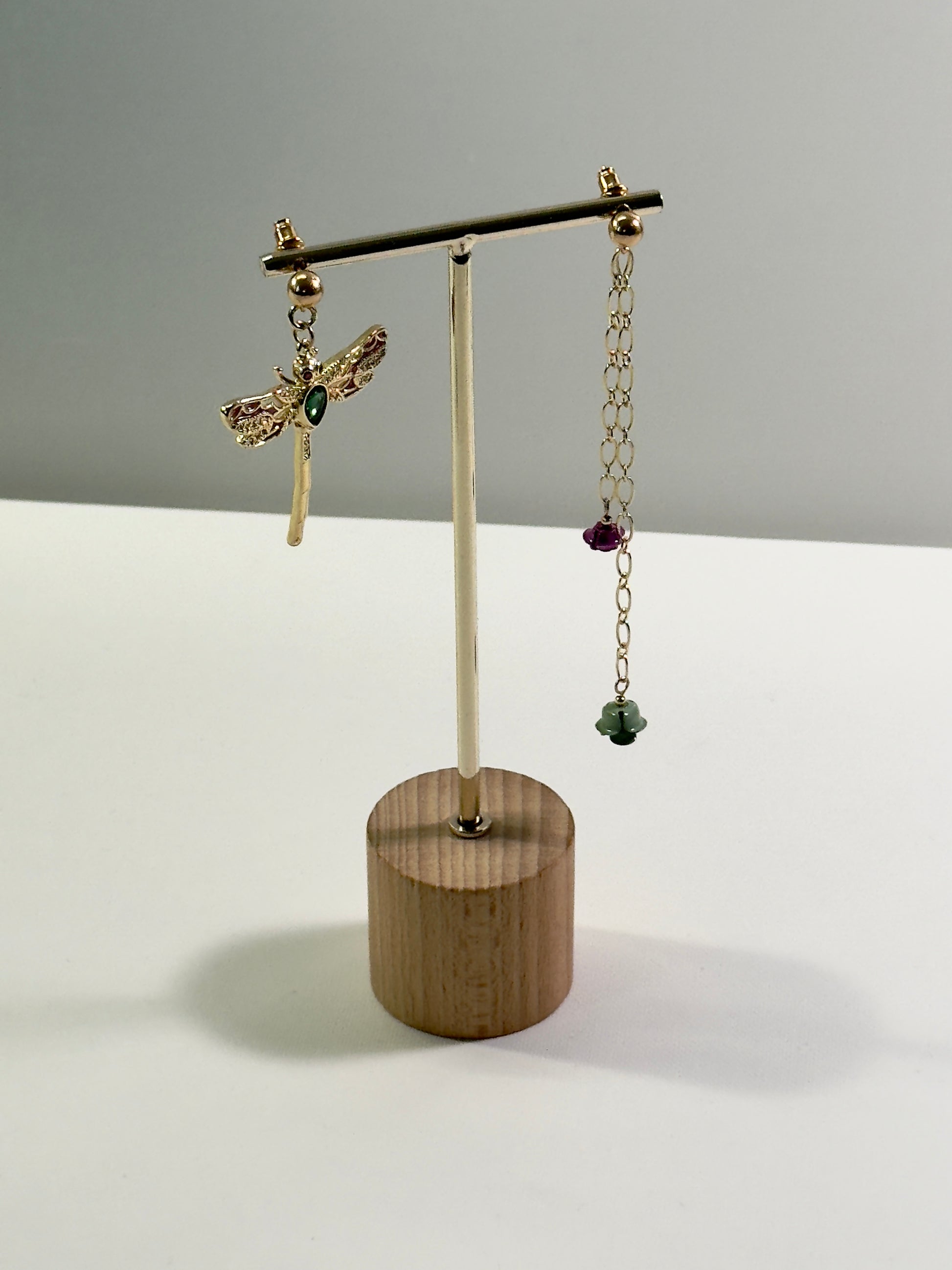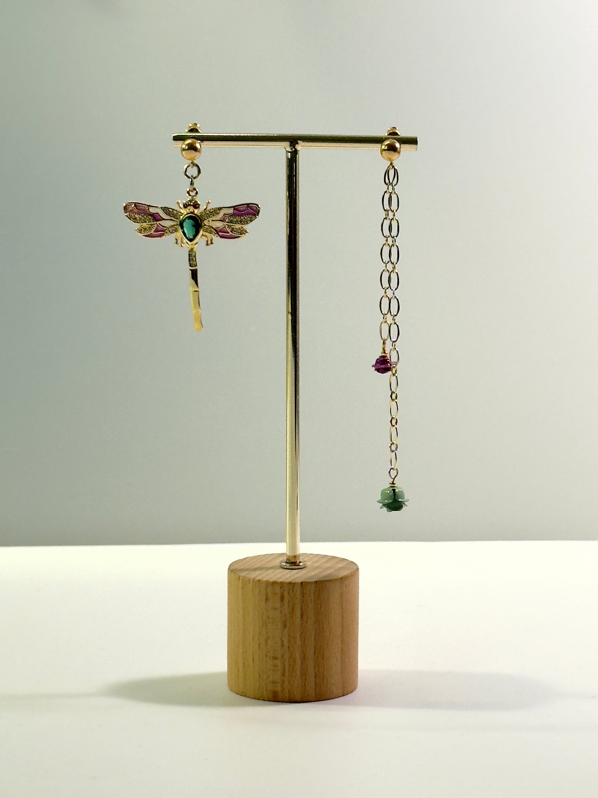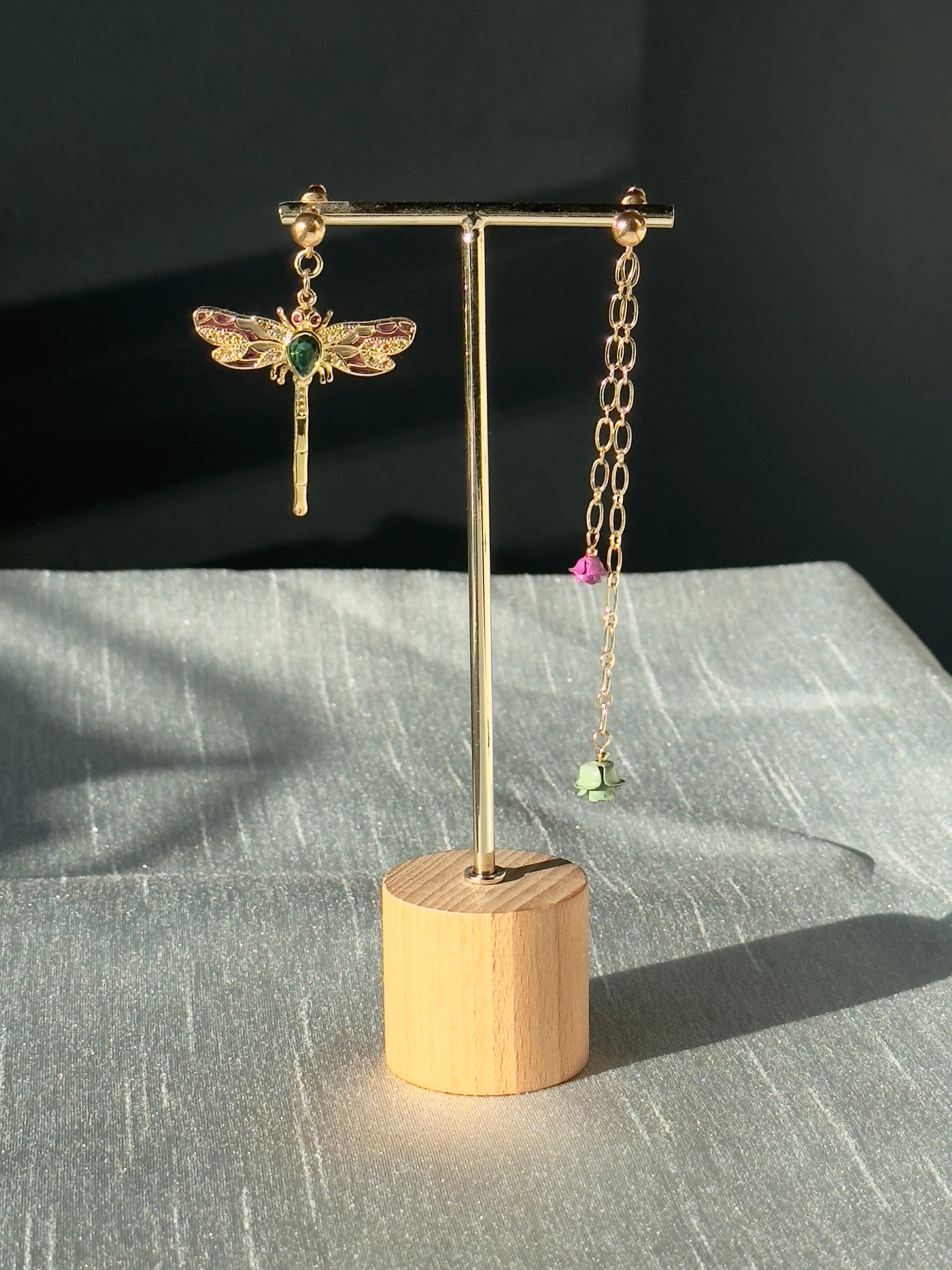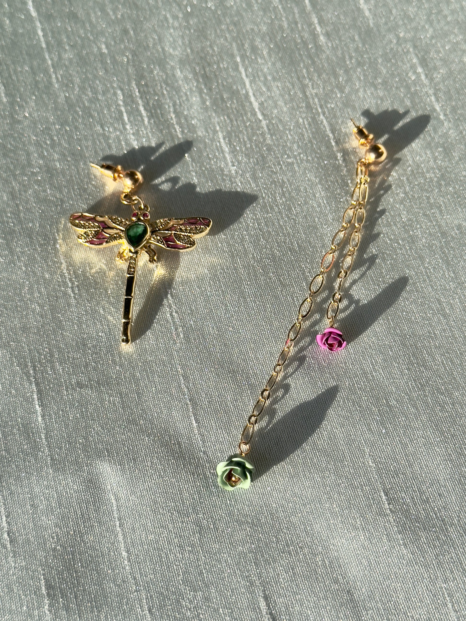Boucles d’oreilles asymétriques – Libellule & Roses