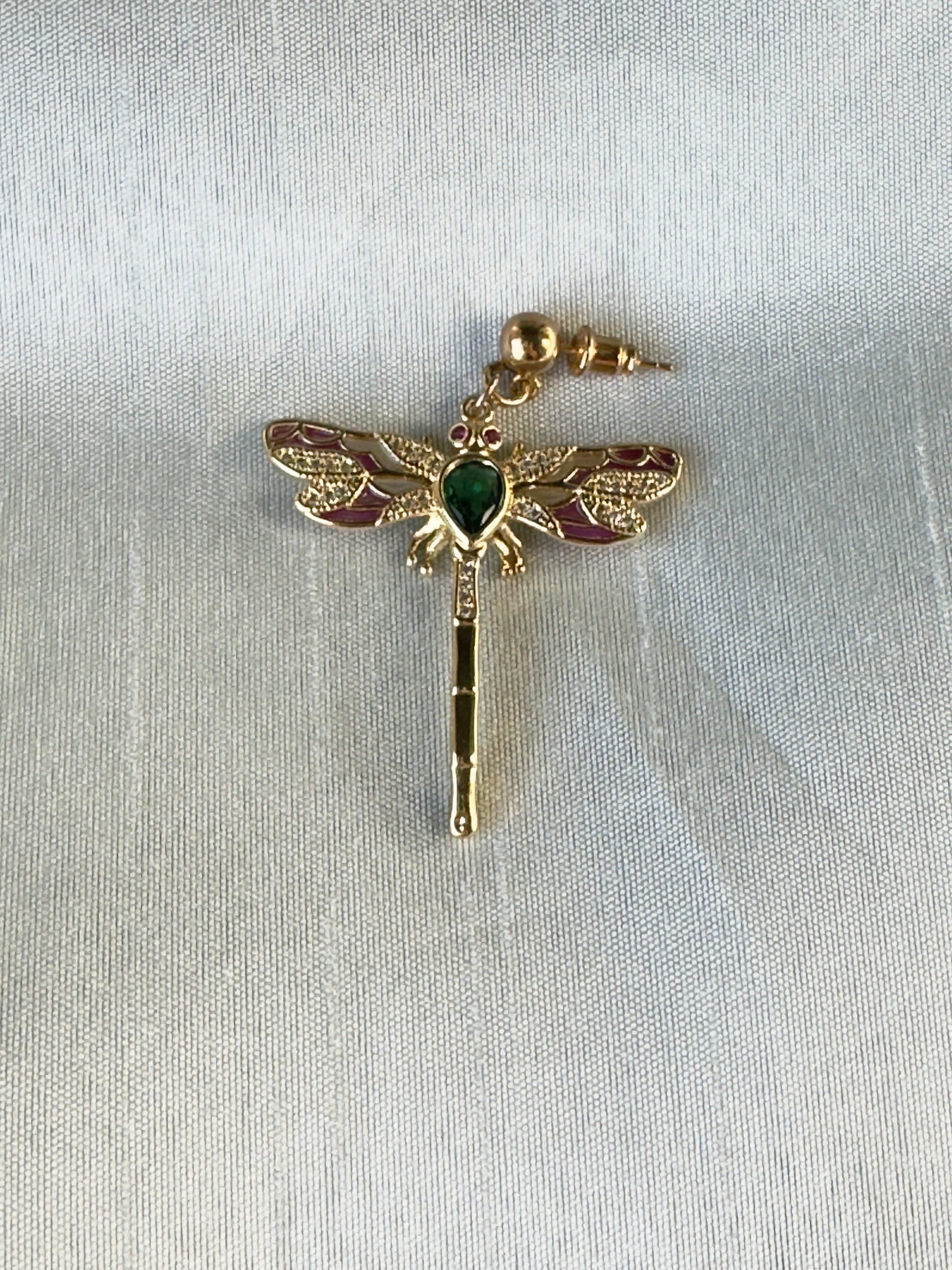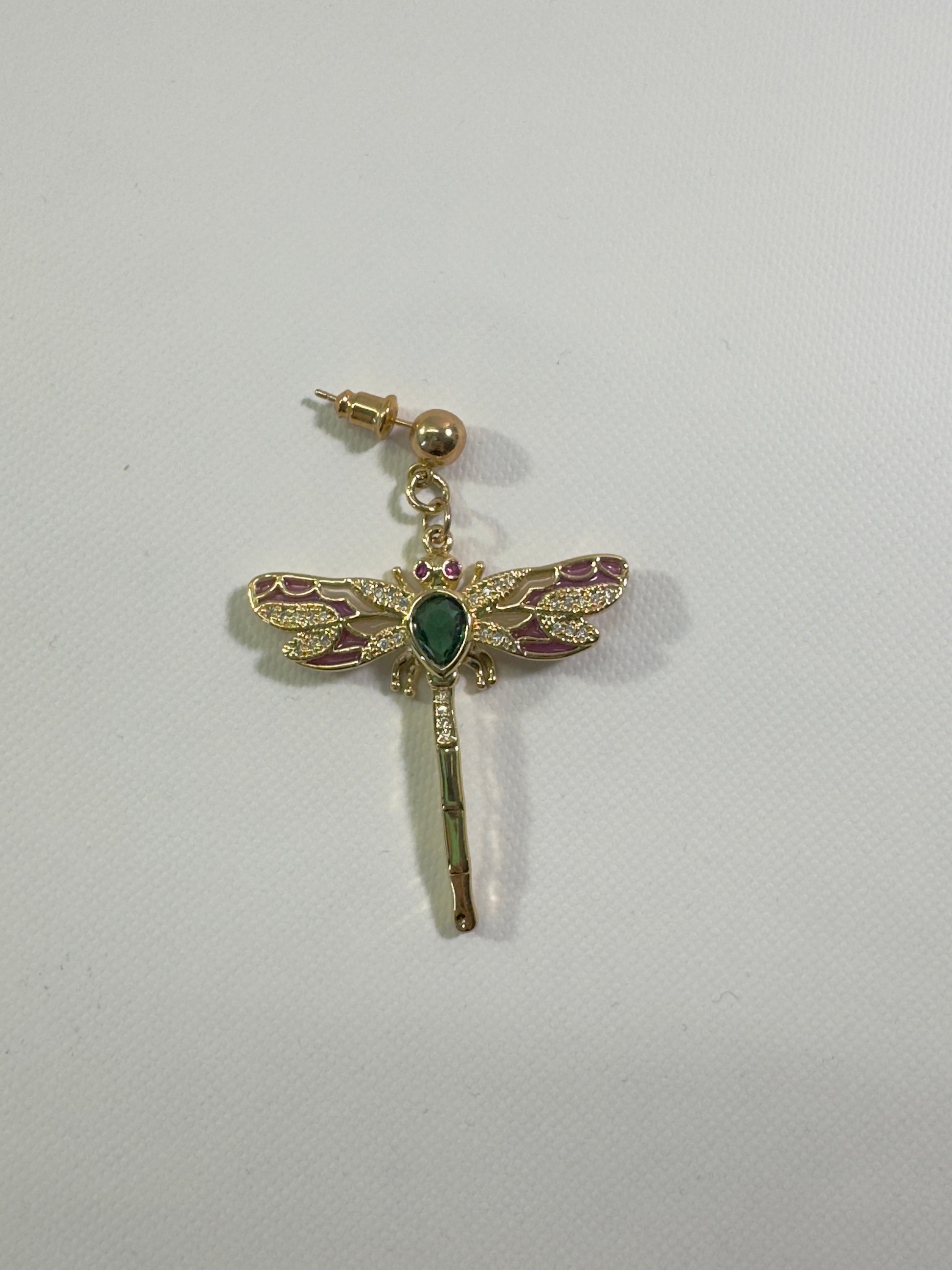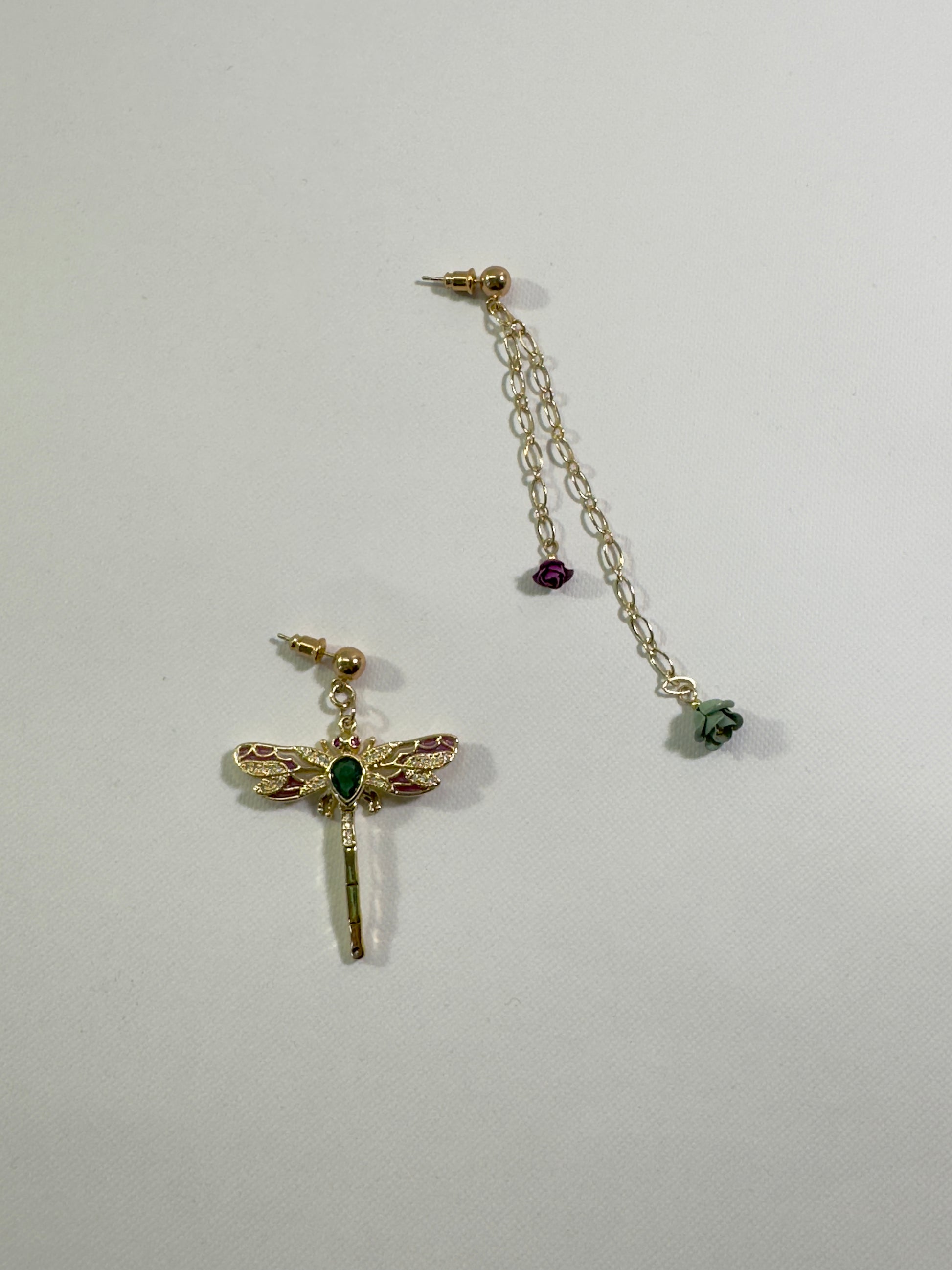 Ces boucles d’oreilles poétiques et asymétriques attirent tous les regards : l'une est ornée d'une délicate libellule, l’autre de deux petites roses finement travaillées.