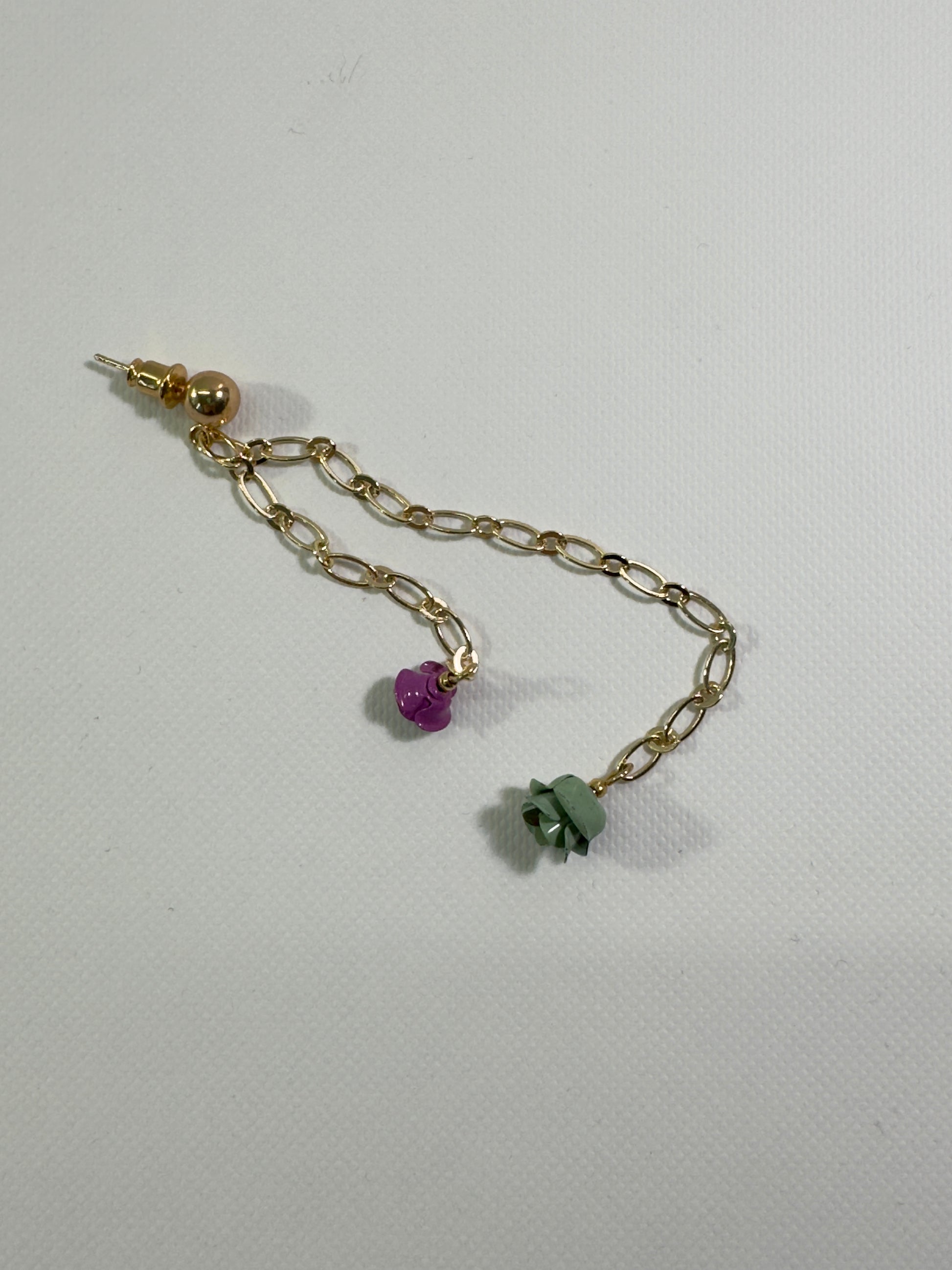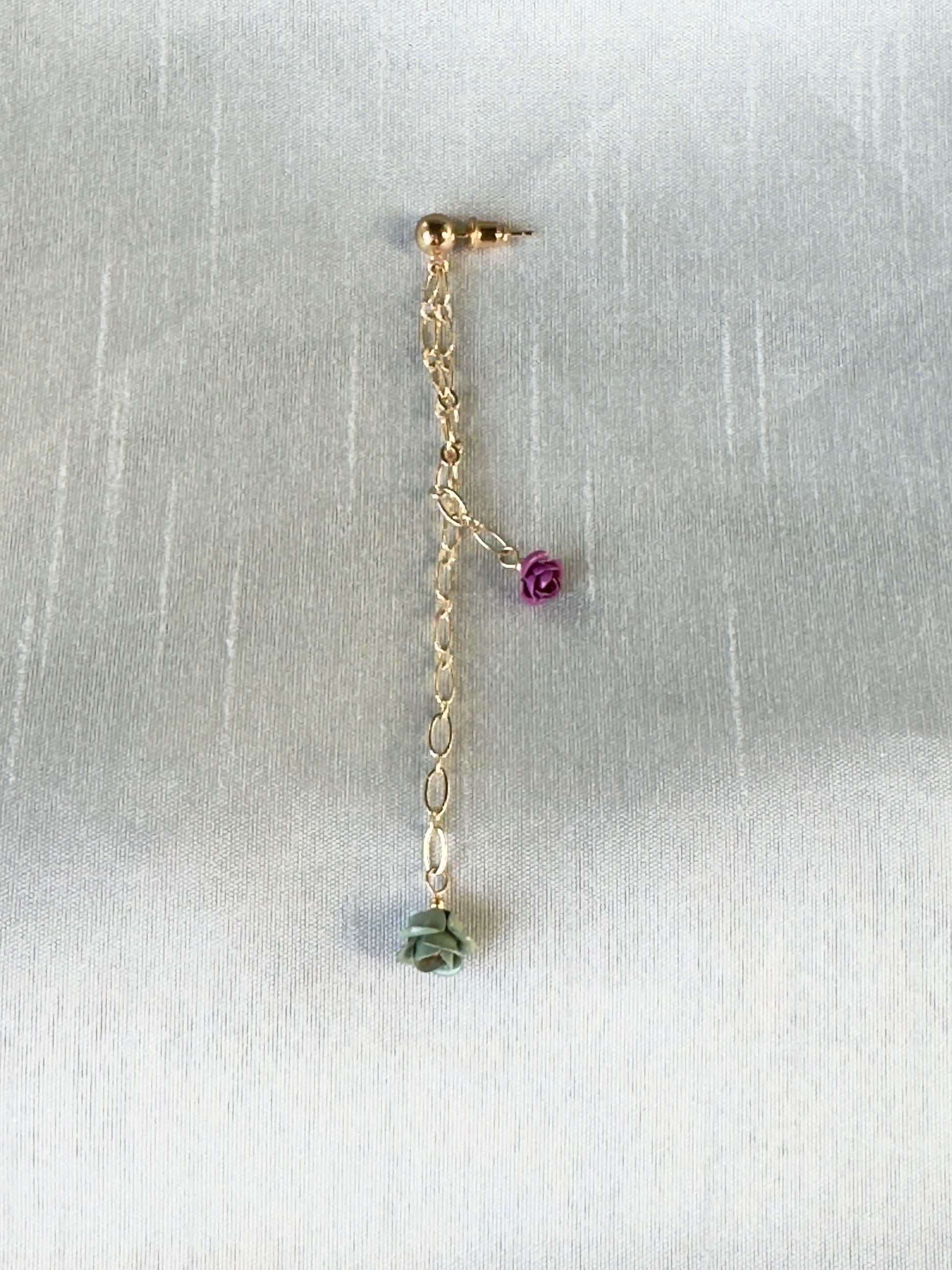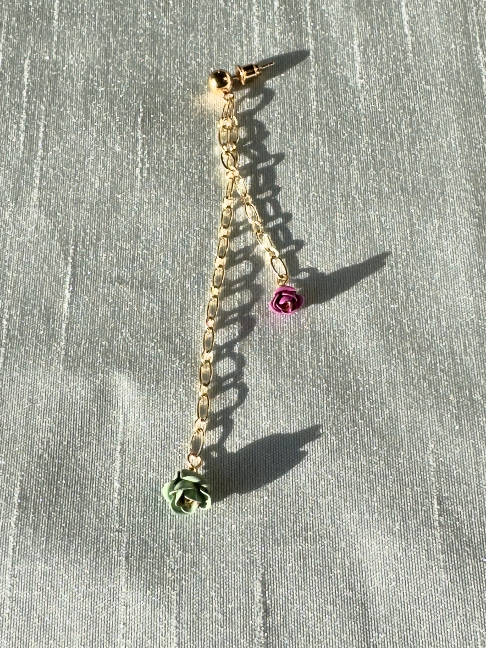 Ces boucles d’oreilles poétiques et asymétriques attirent tous les regards : l'une est ornée d'une délicate libellule, l’autre de deux petites roses finement travaillées.