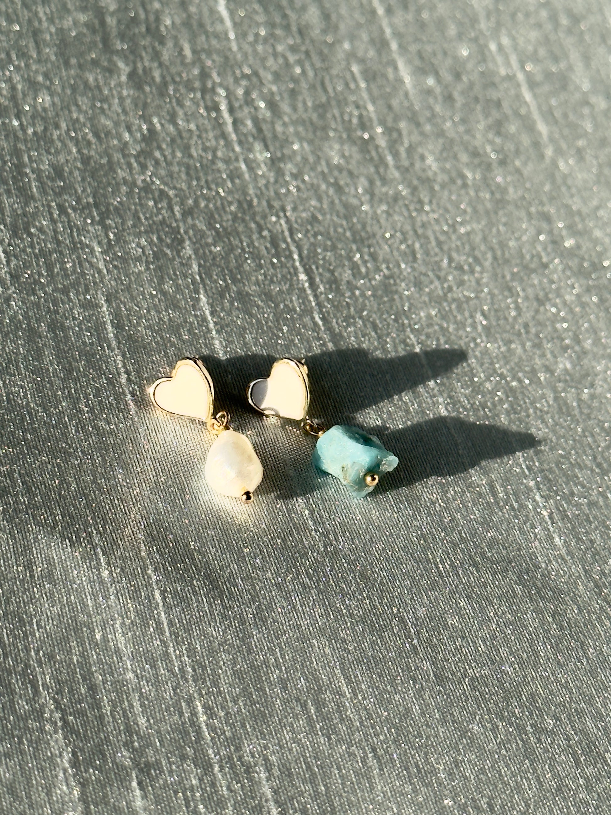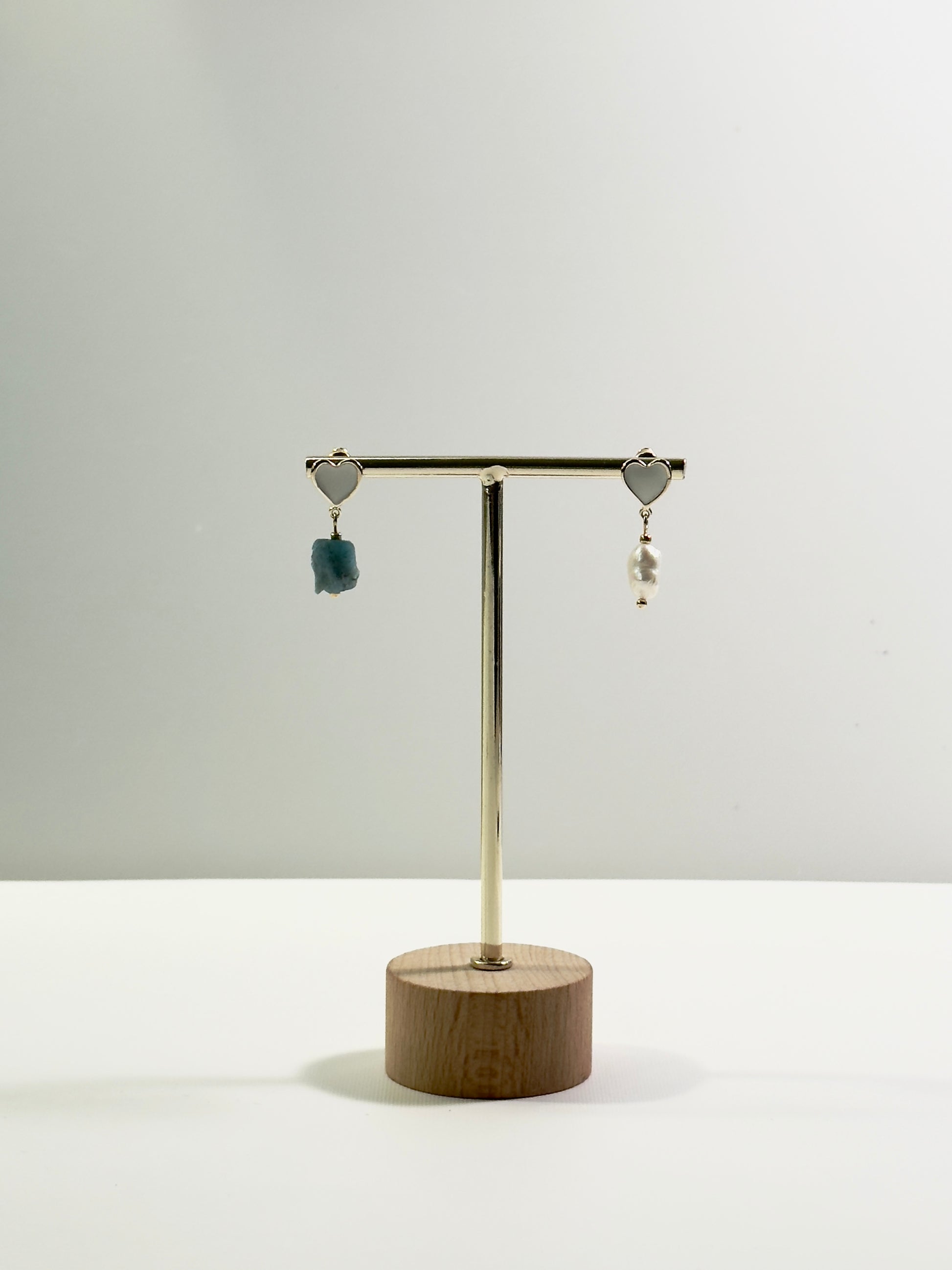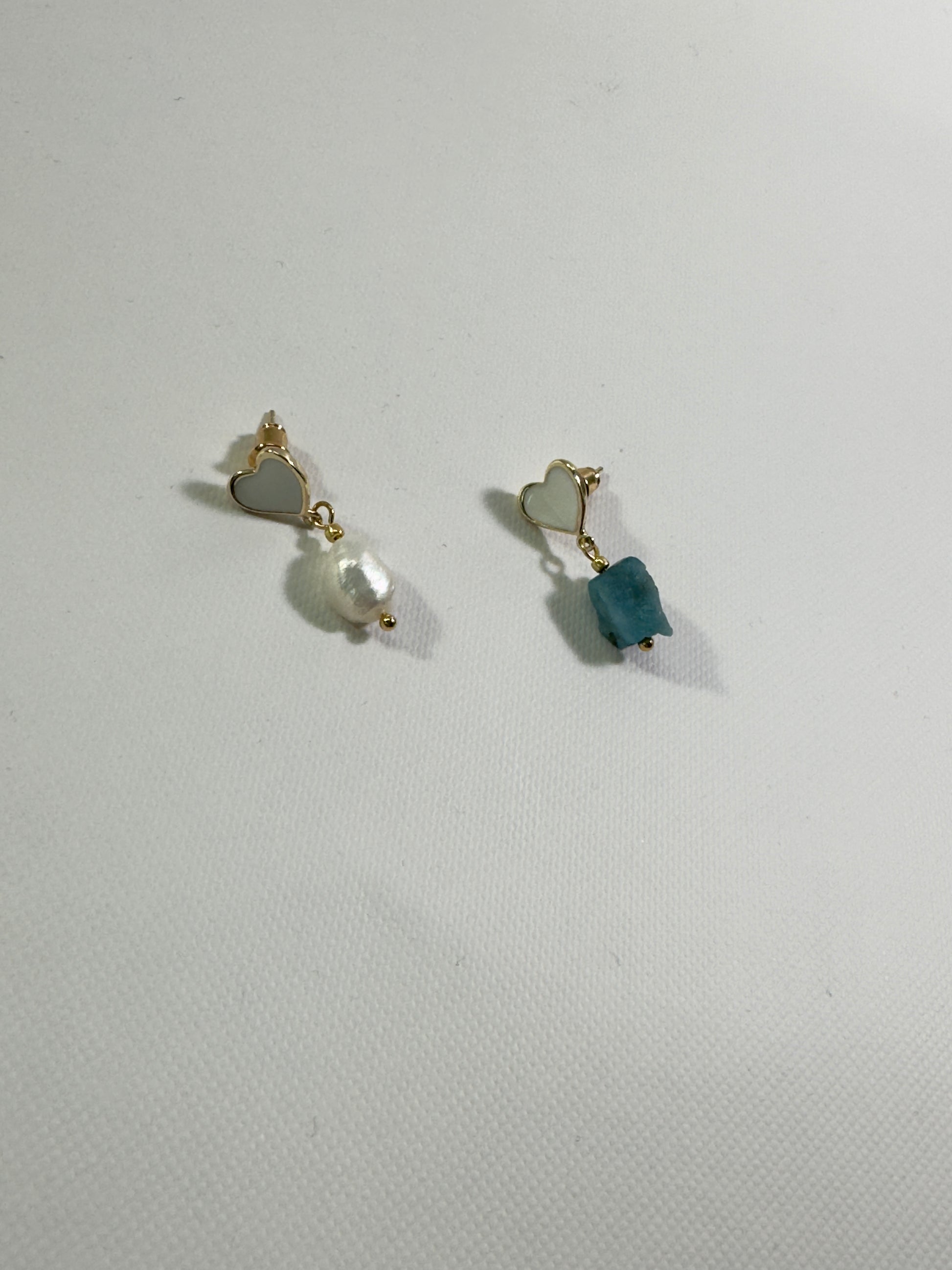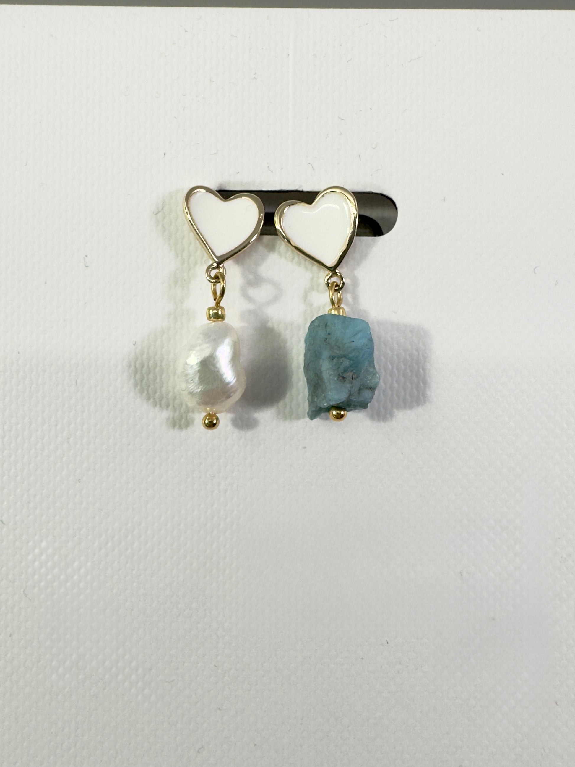 Ces boucles d’oreilles poétiques et pleines de charme sont en forme de cœur, ornées d’un émail blanc brillant en leur centre. L’une est embellie d’une perle blanche d’eau douce, l’autre d’un éclat brut d’apatite bleue, créant un contraste délicat et original.