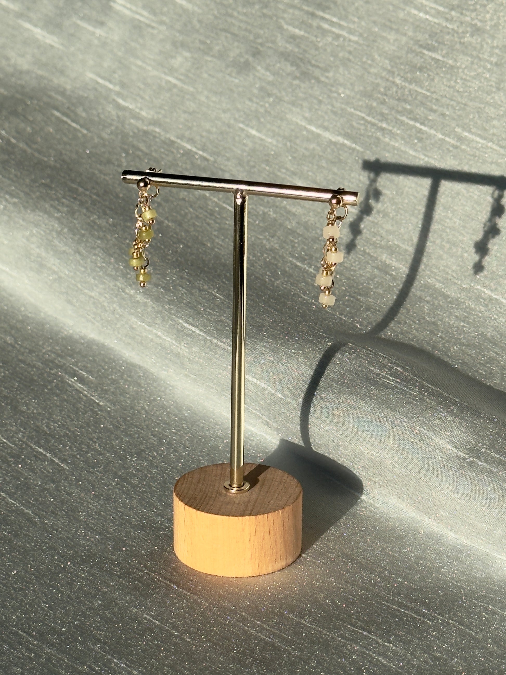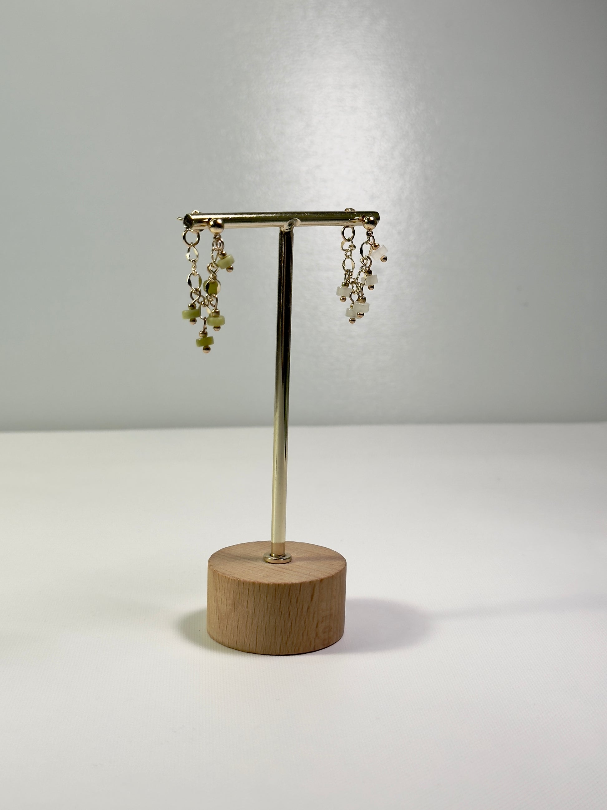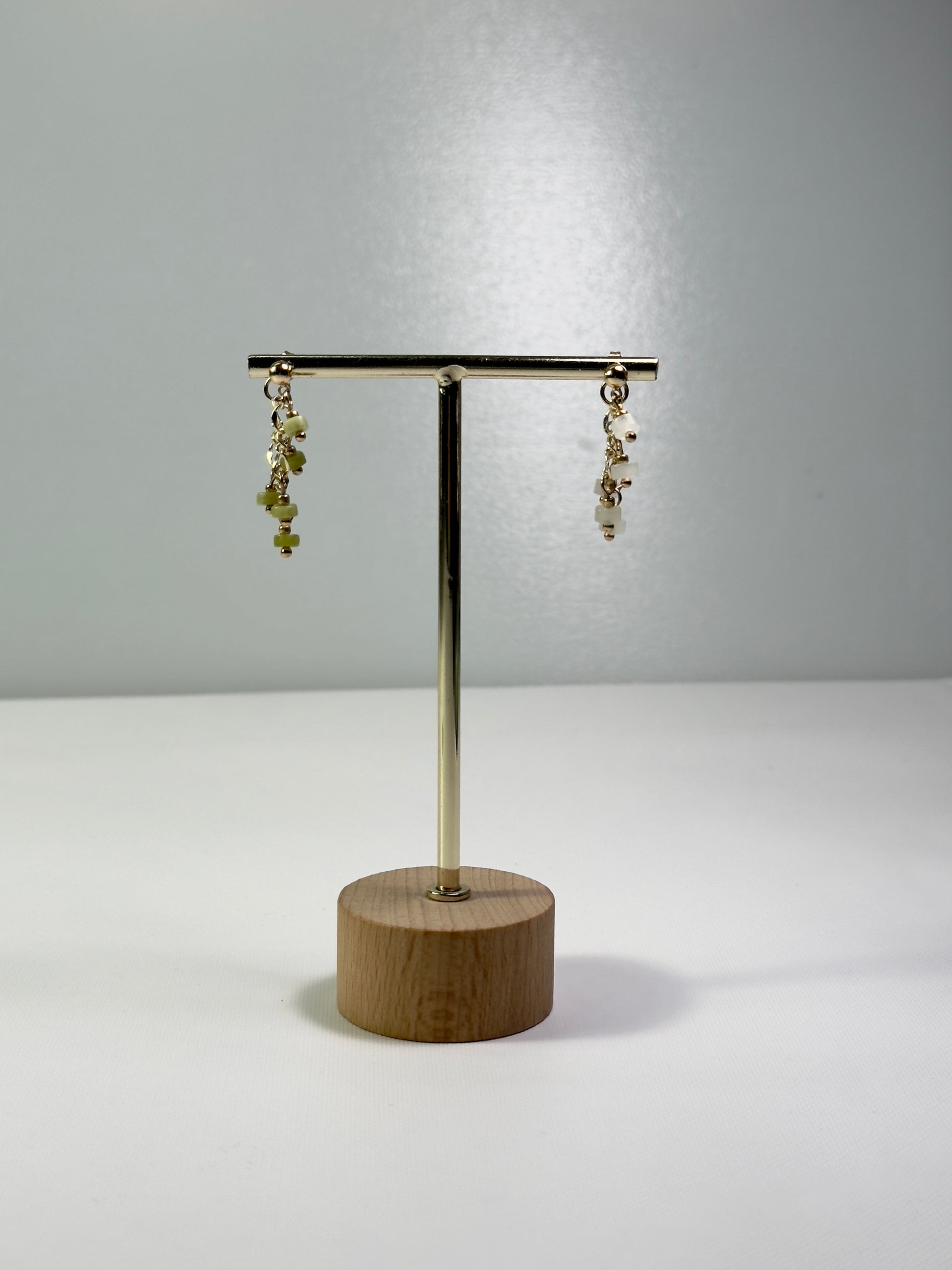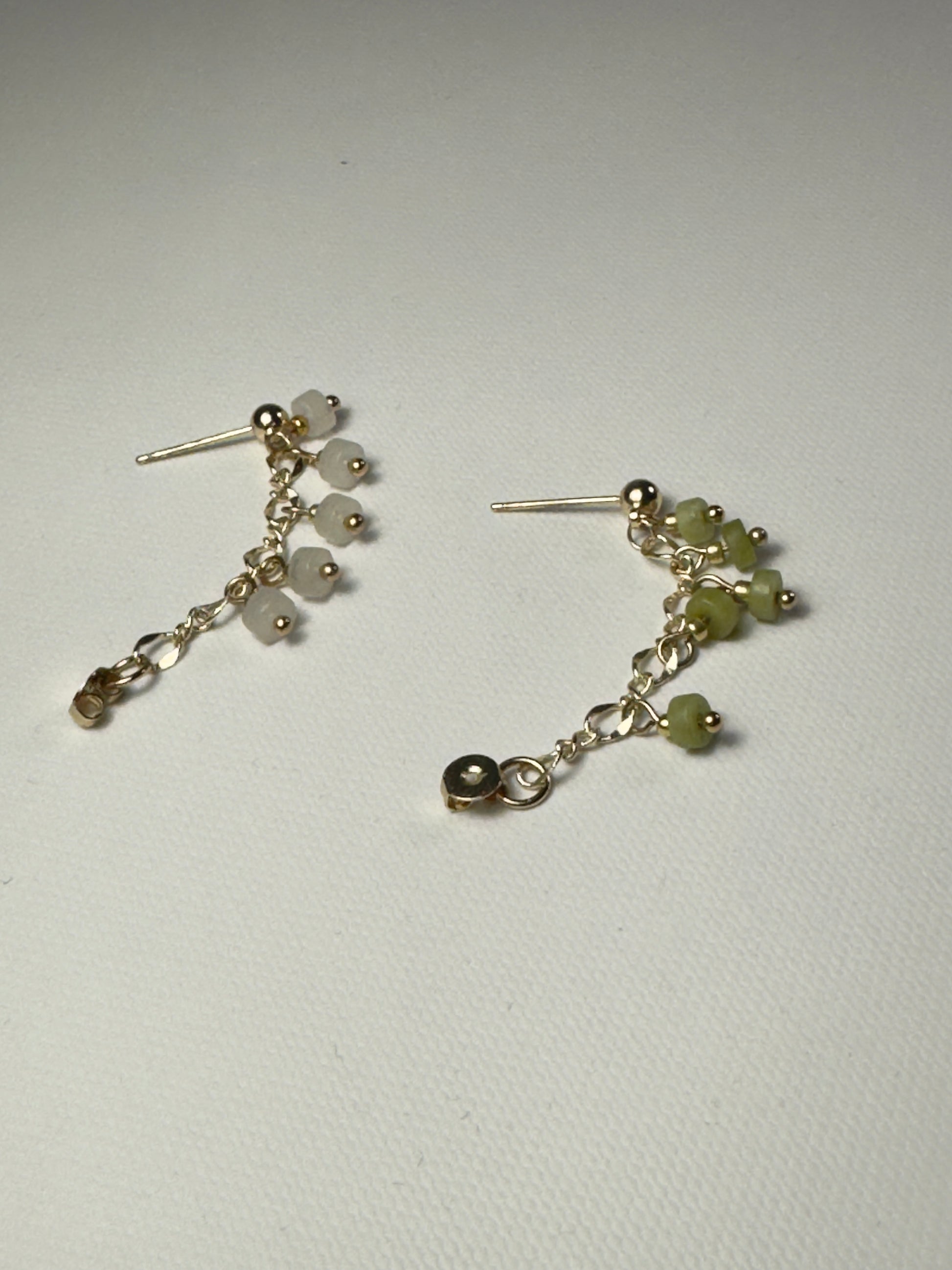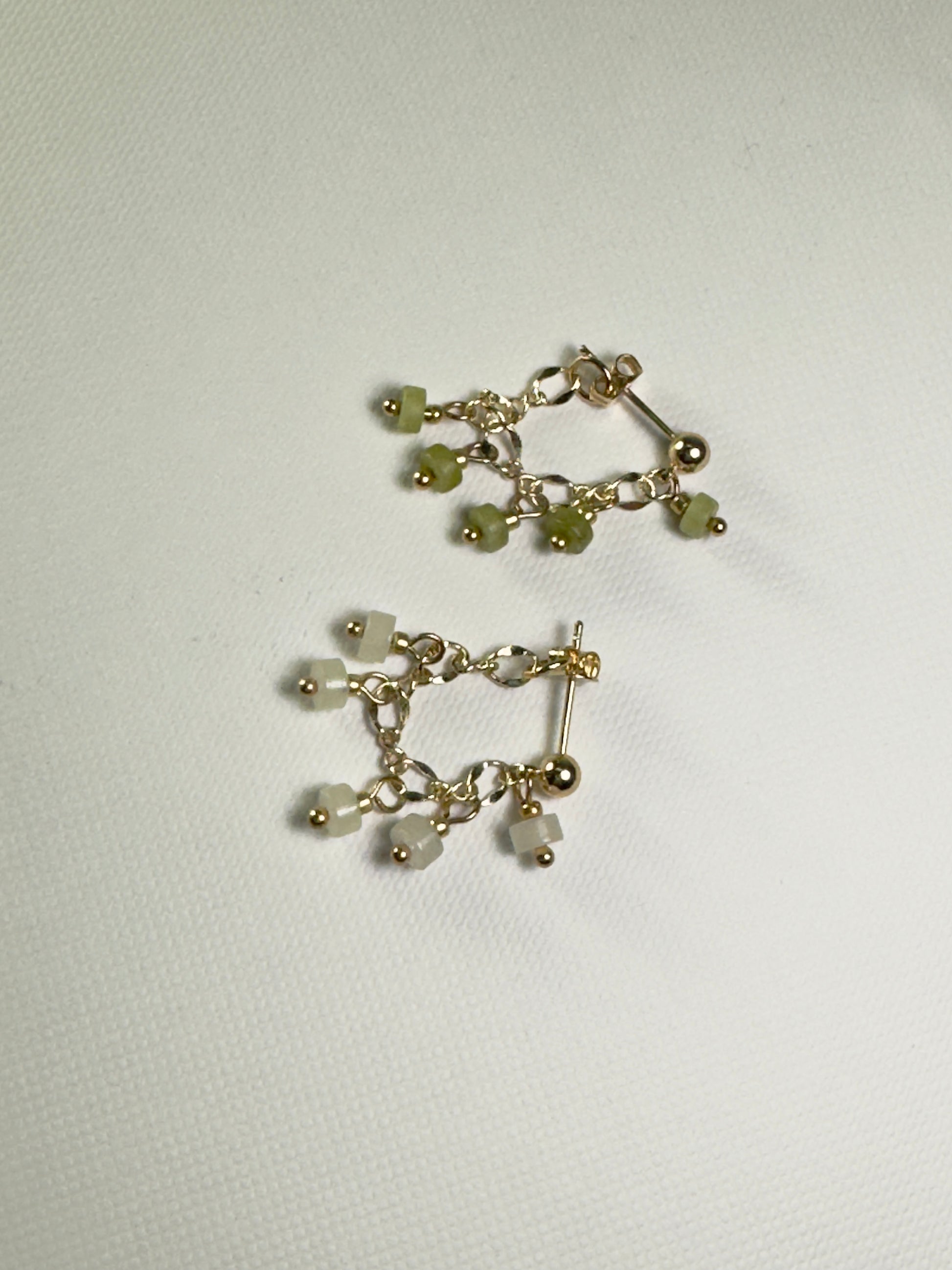 Ces boucles d’oreilles raffinées sont composées de deux pierres naturelles : du jade vert pour l’une et du quartz rose pour l’autre. Bien que de couleurs différentes, elles forment une paire harmonieuse et équilibrée. Chaque fermoir est relié à la boucle par une petite chaînette, évitant toute perte accidentelle.