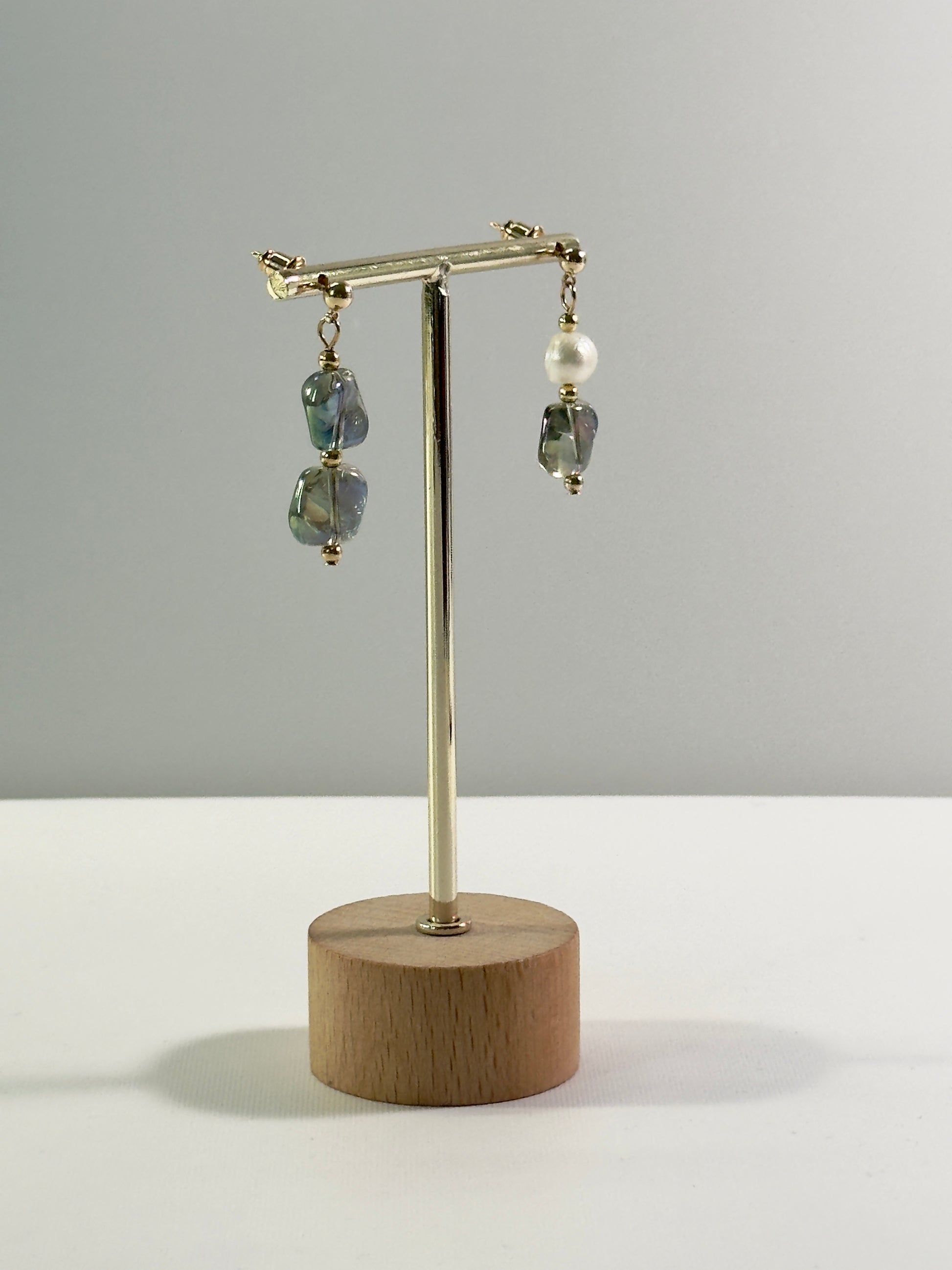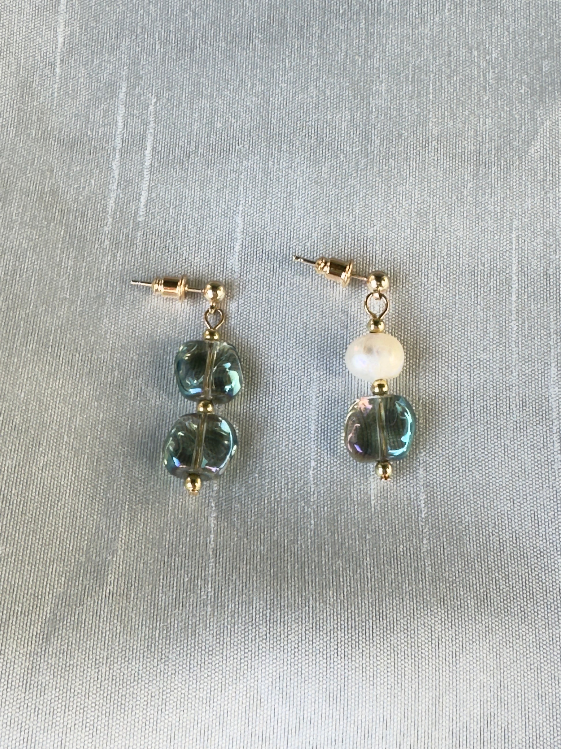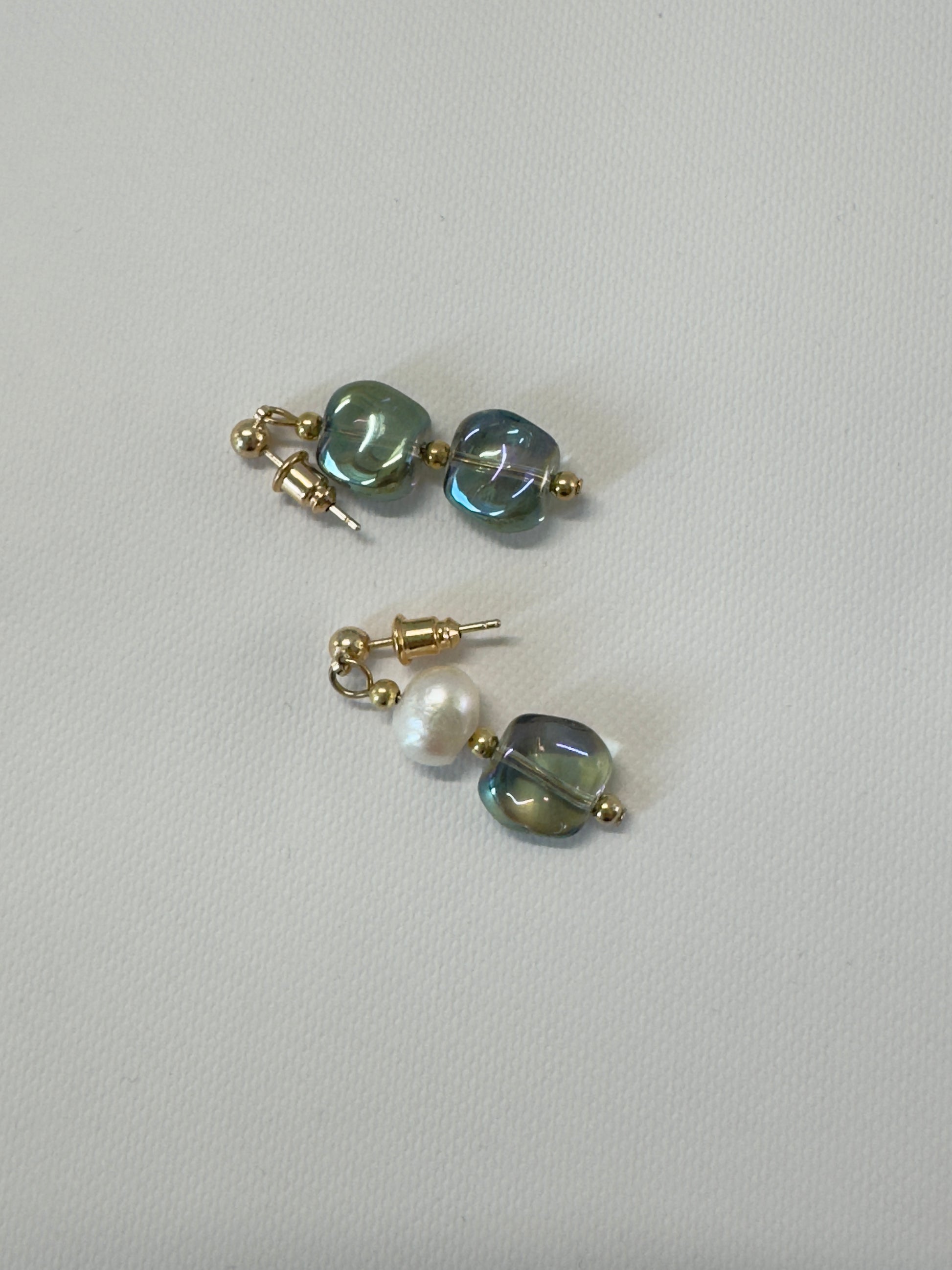 Ces boucles d’oreilles uniques sont réalisées à la main avec des perles de verre carrées aux reflets bleu-vert, accompagnées d'une perle de culture blanche. Leur design délicat allie modernité et douceur naturelle.