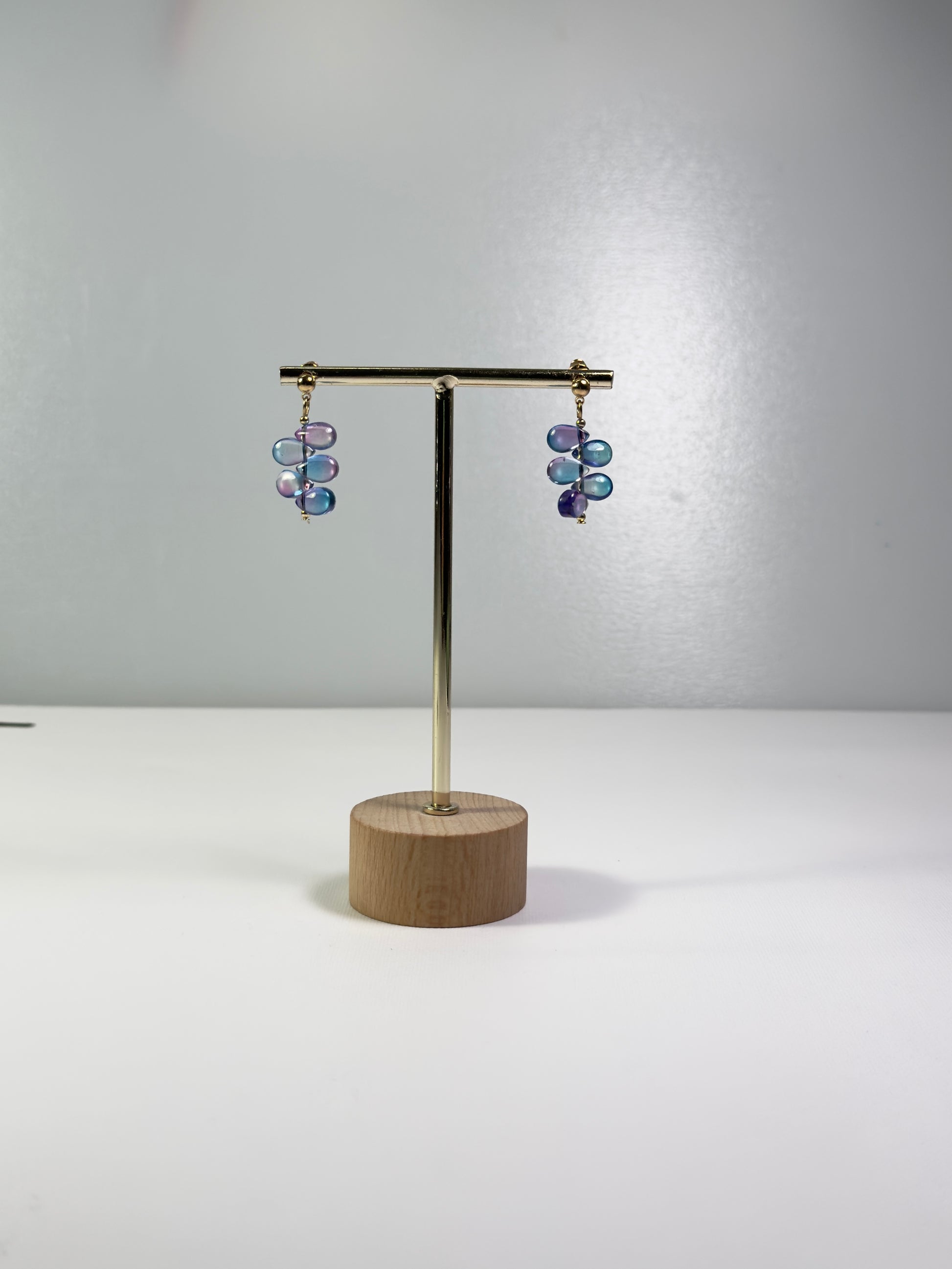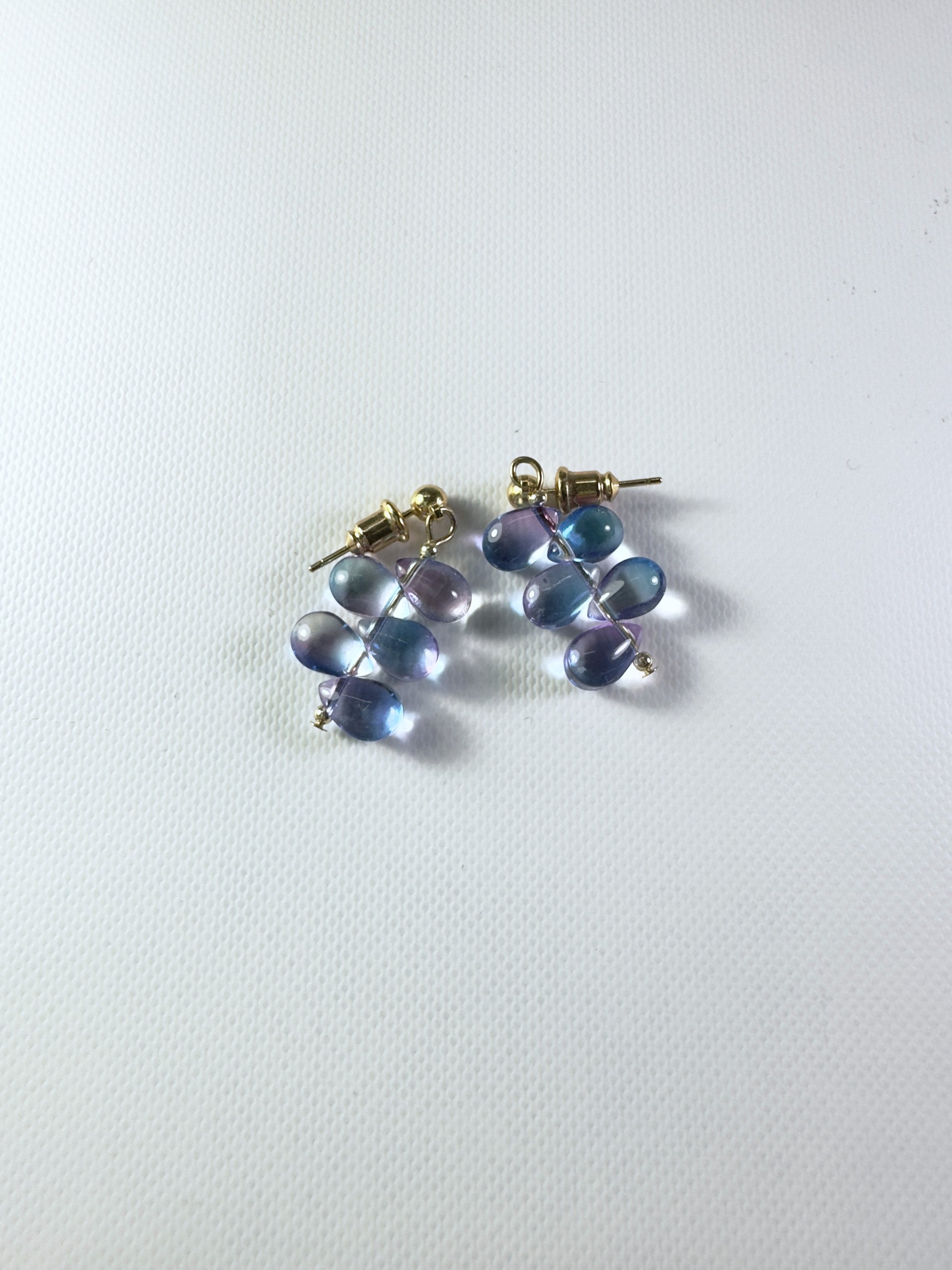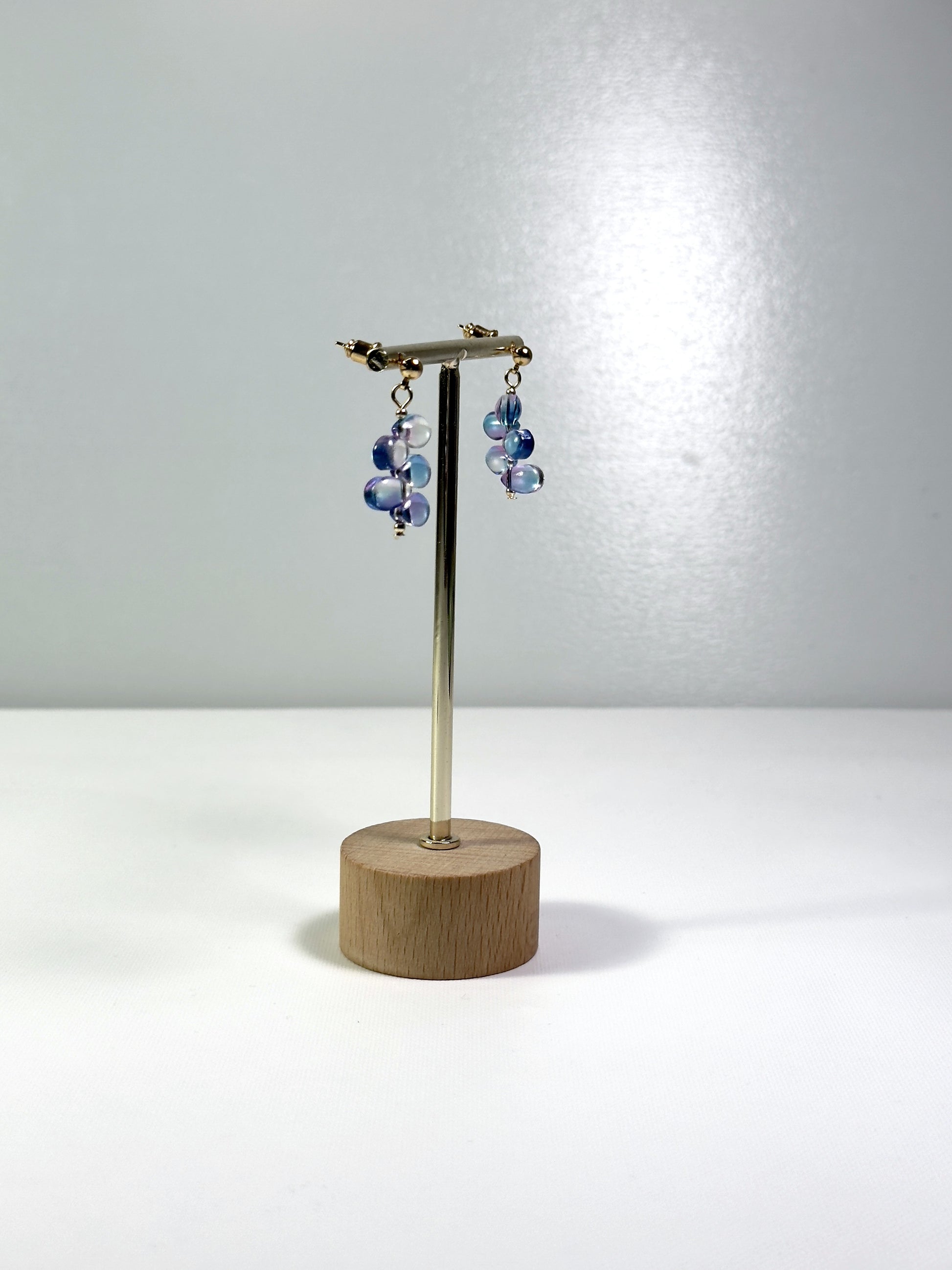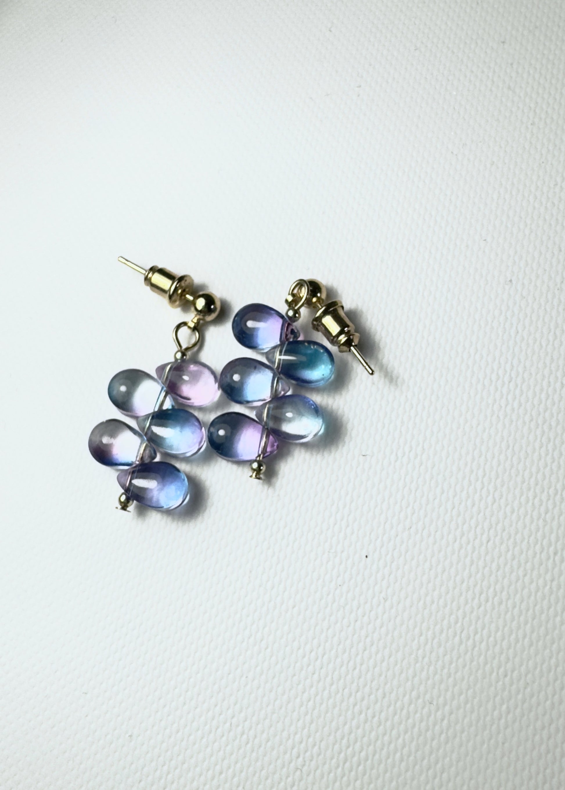 Élégantes et légères, ces boucles d’oreilles sont composées de perles en verre en forme de goutte, aux reflets bleus et violets envoûtants. Leur design délicat met en valeur la lumière et ajoute une touche de poésie à votre look.