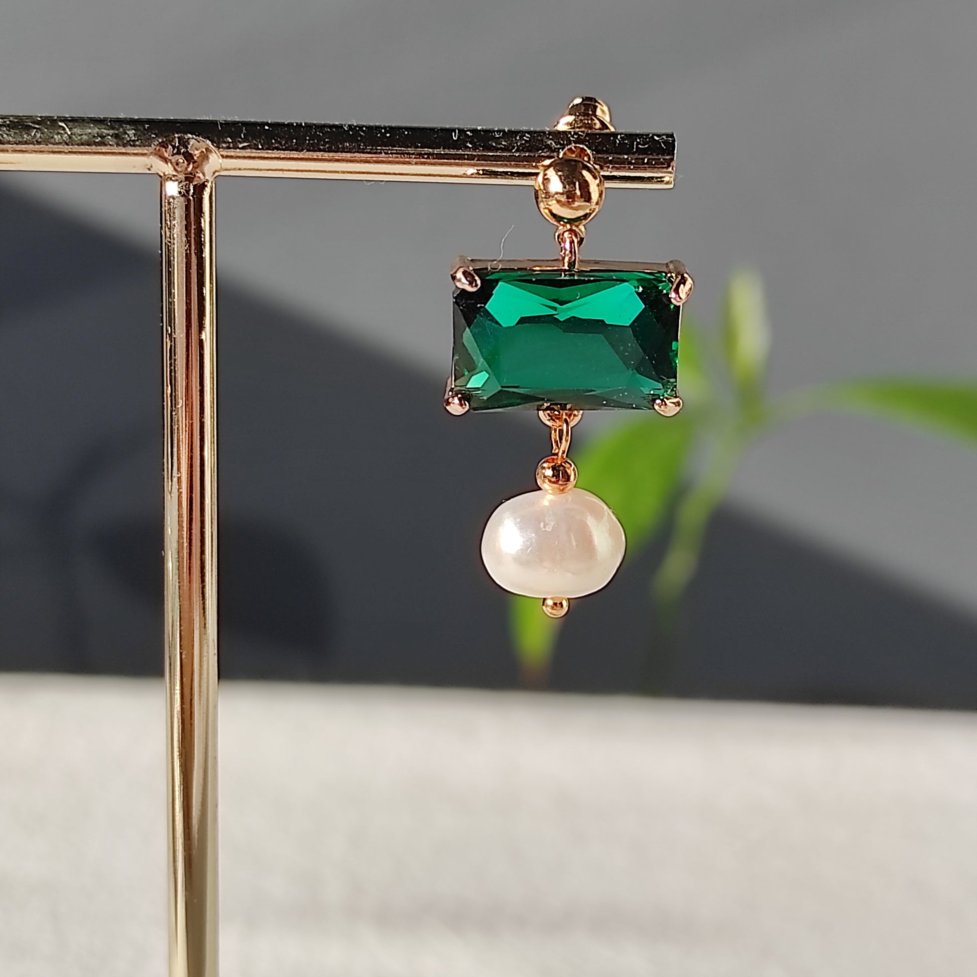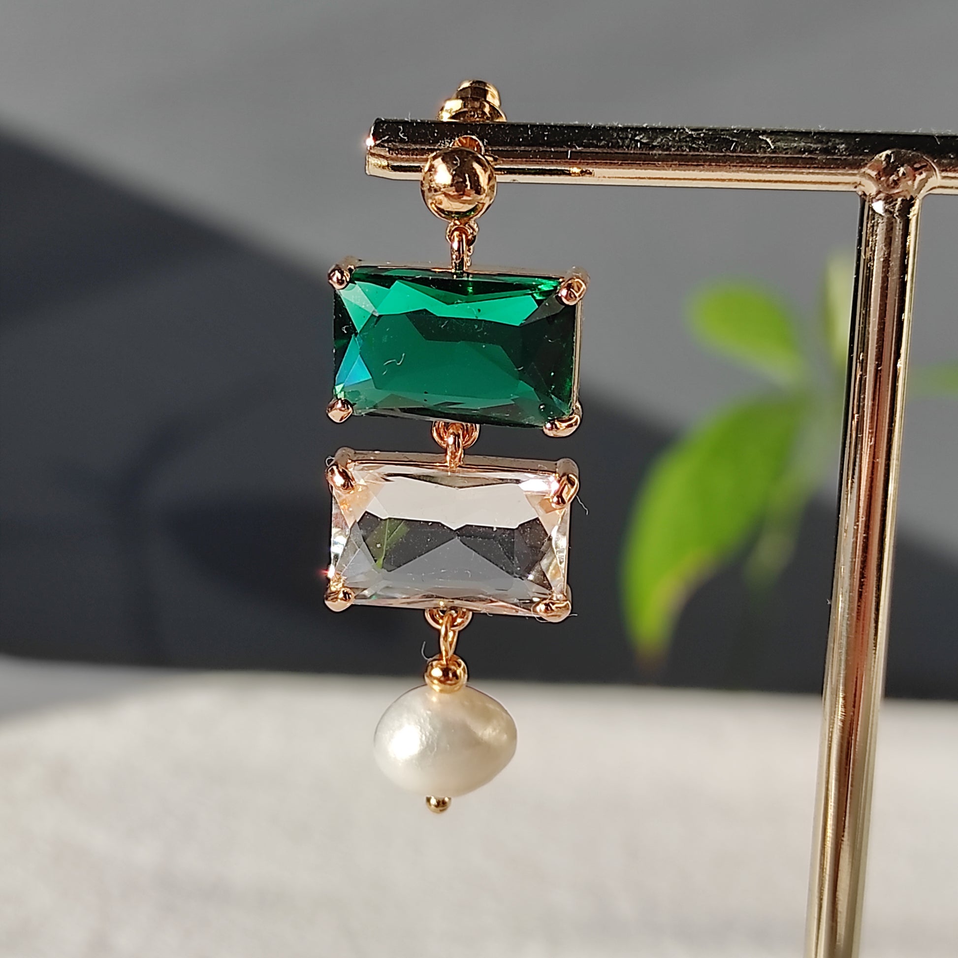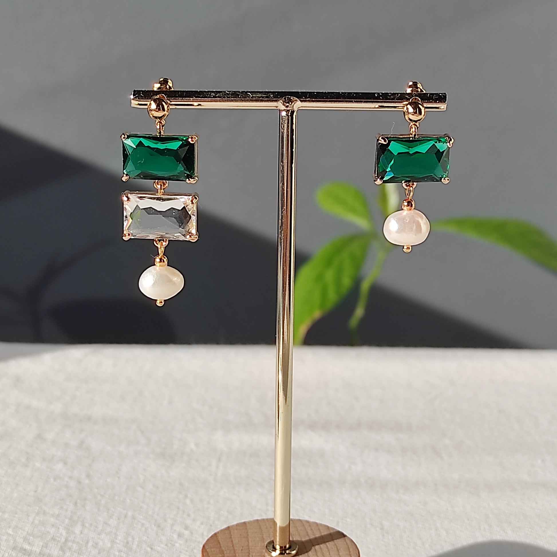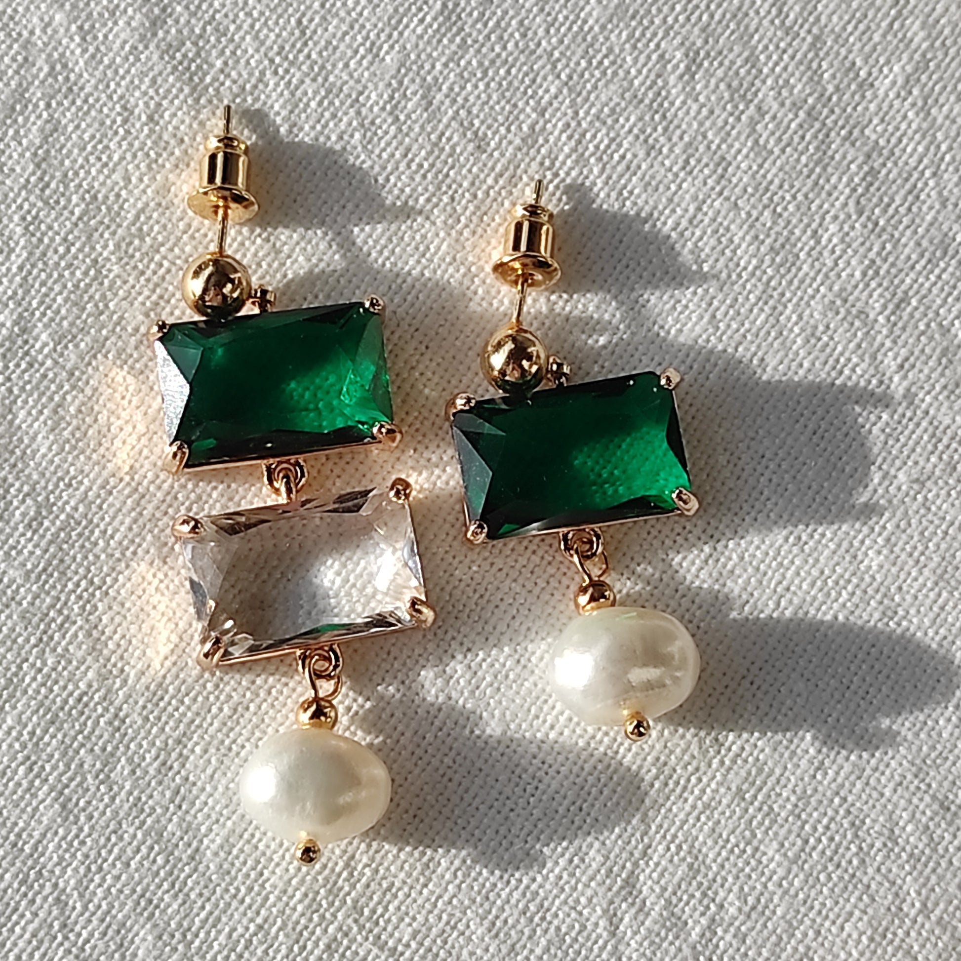 Ces boucles d’oreilles délicatement asymétriques mêlent l’éclat pur du zircon blanc à la profondeur végétale du zircon vert. De petites gouttes de perles viennent ponctuer l’ensemble d’une touche de douceur nacrée. Un bijou raffiné, fait main, qui joue avec les contrastes de forme et de lumière.