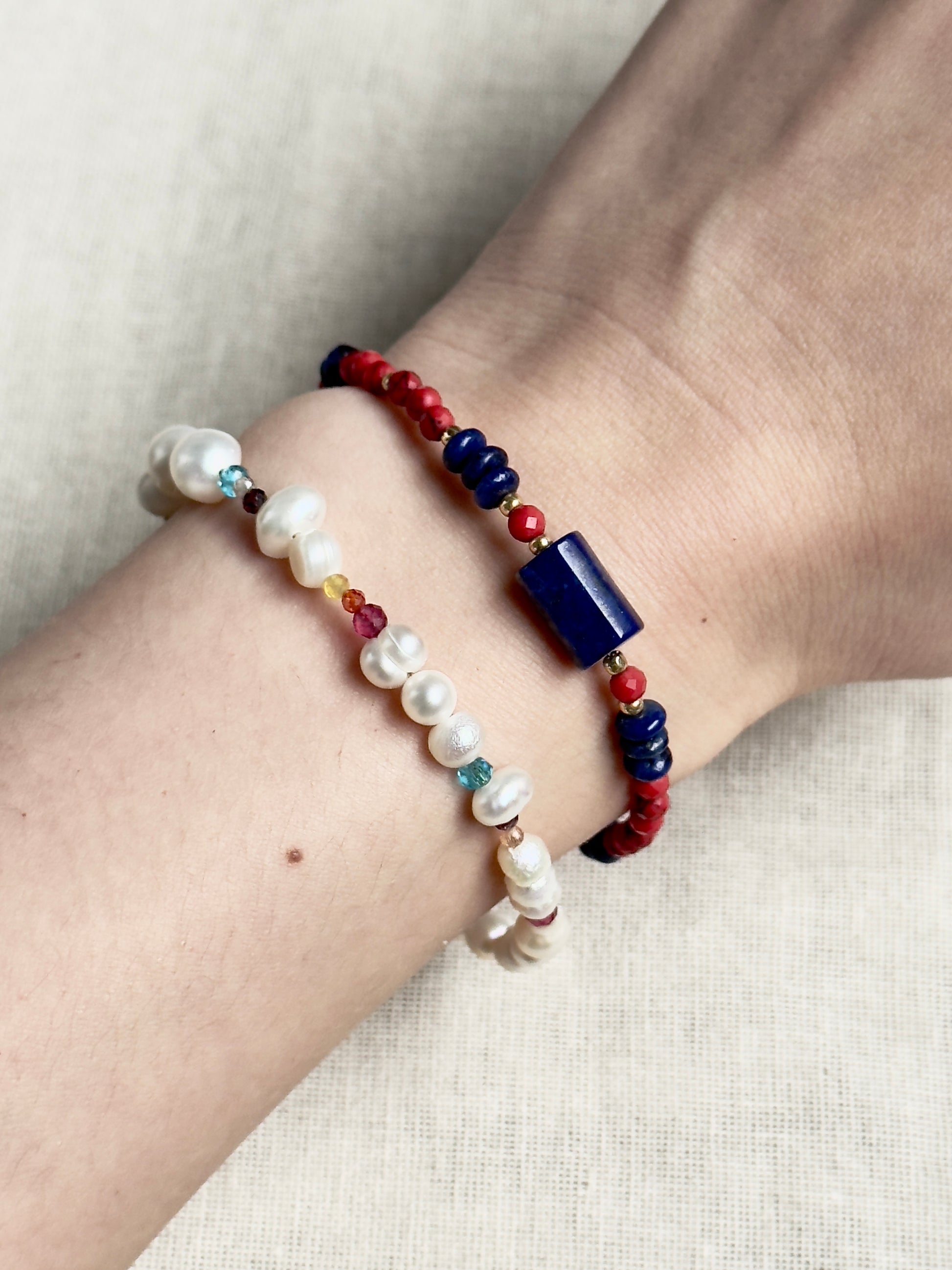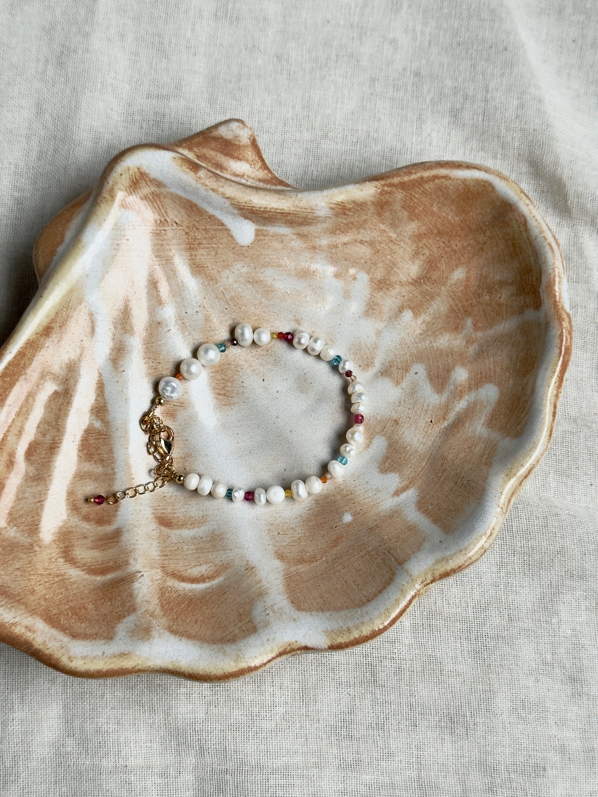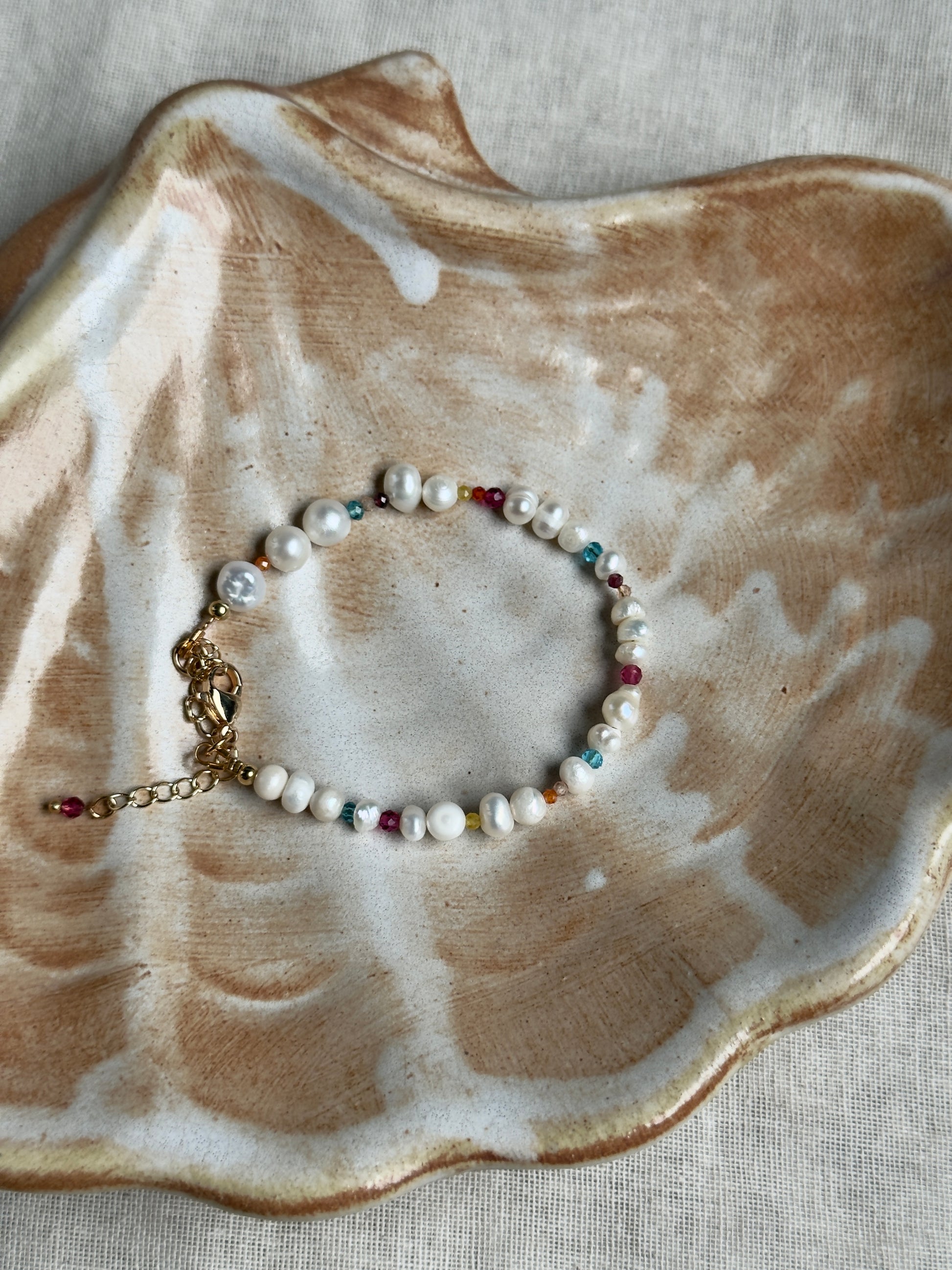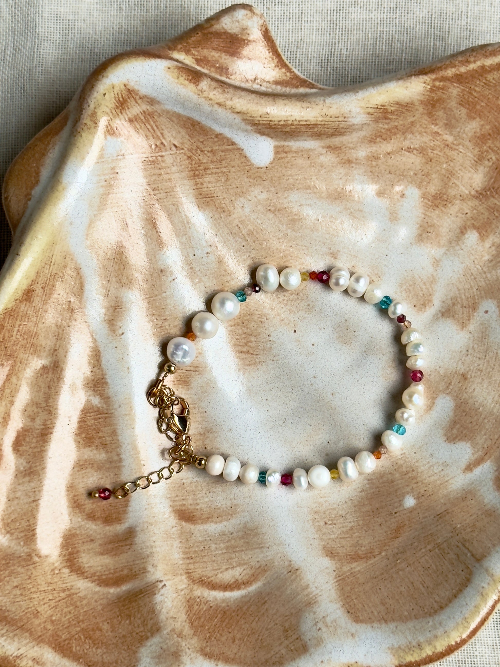 This delicate bracelet combines the timeless elegance of white freshwater pearls with the playful charm of colorful beads, creating a unique and vibrant piece. Perfect to brighten up your wrist on any occasion.