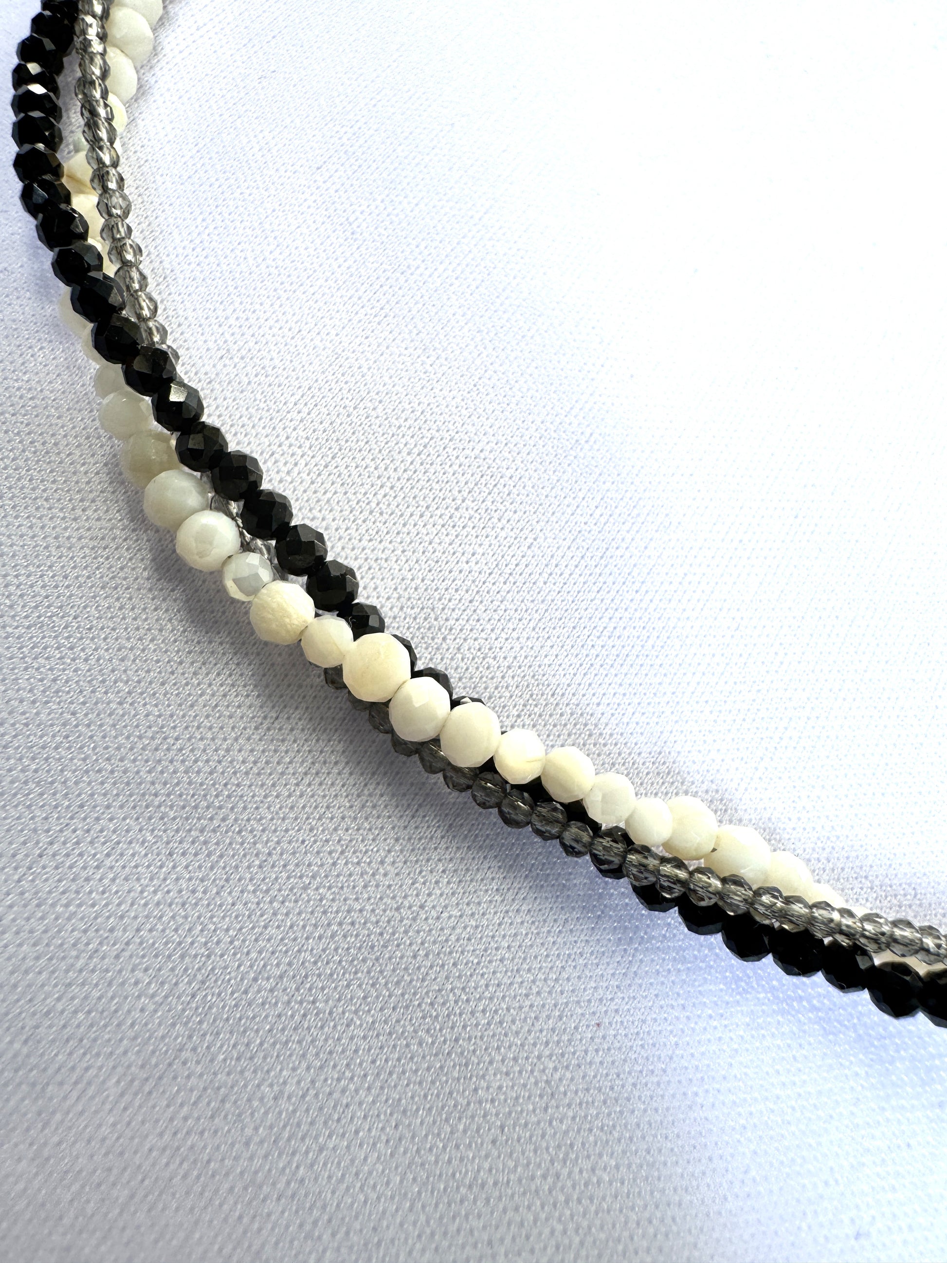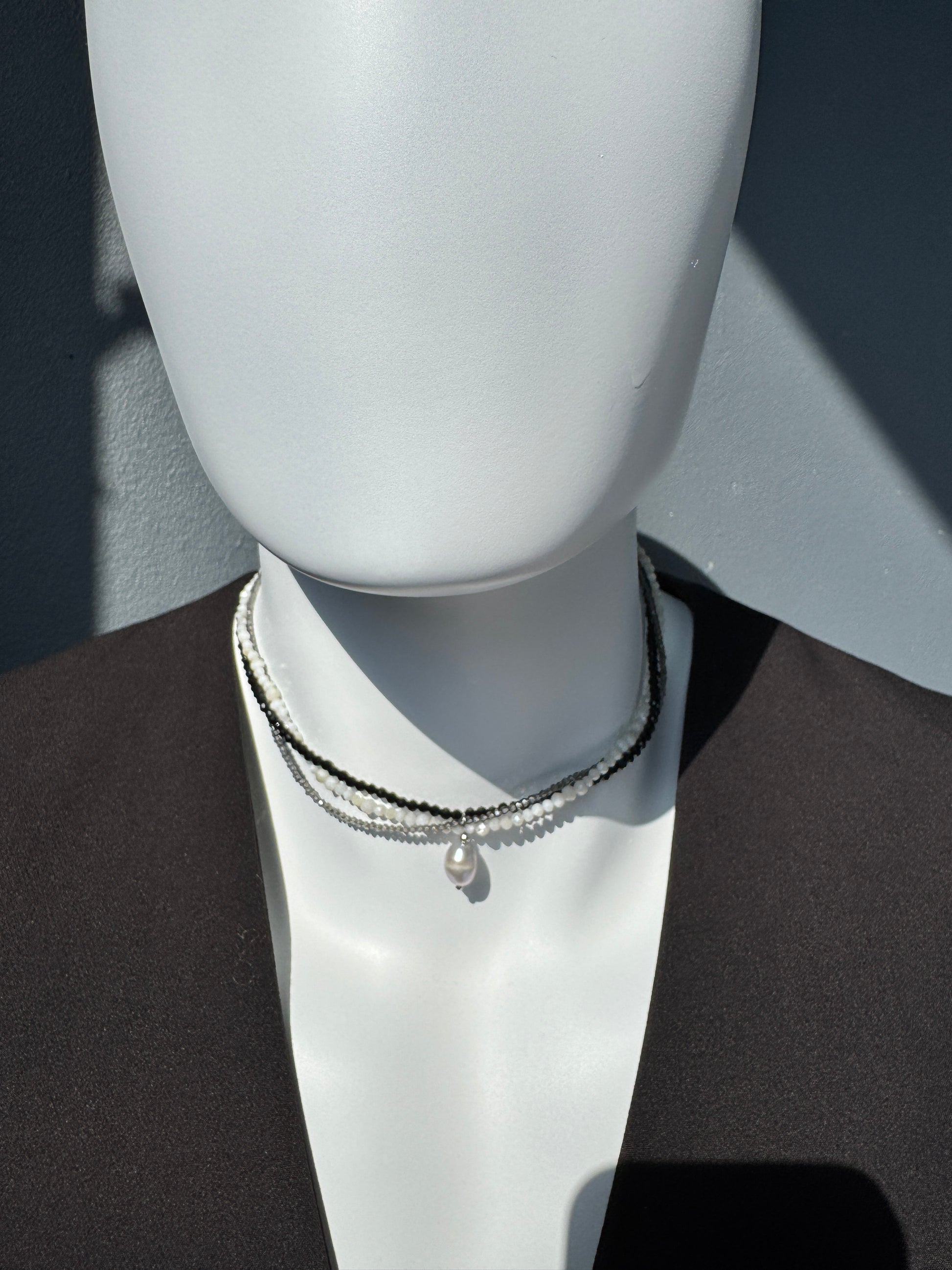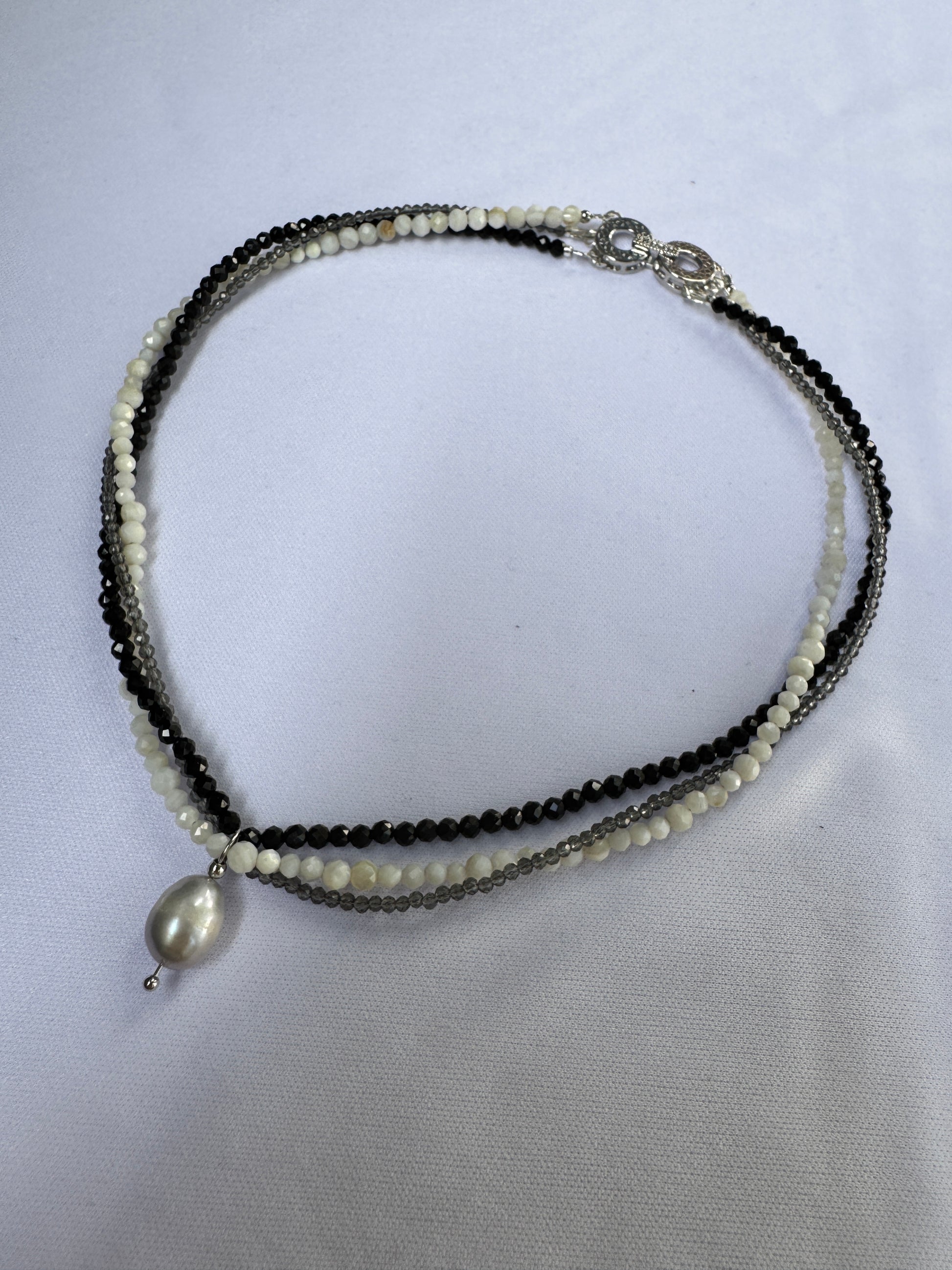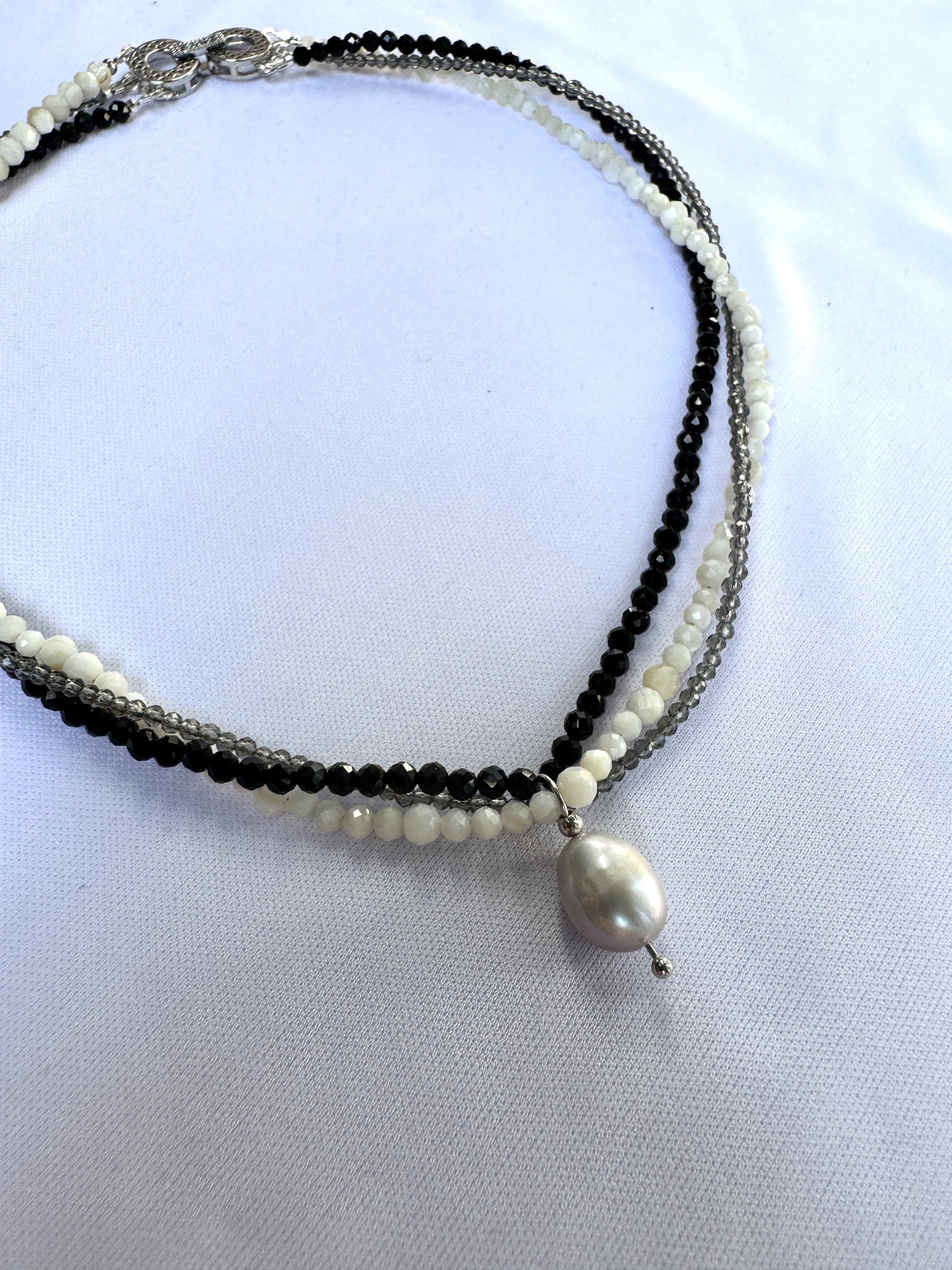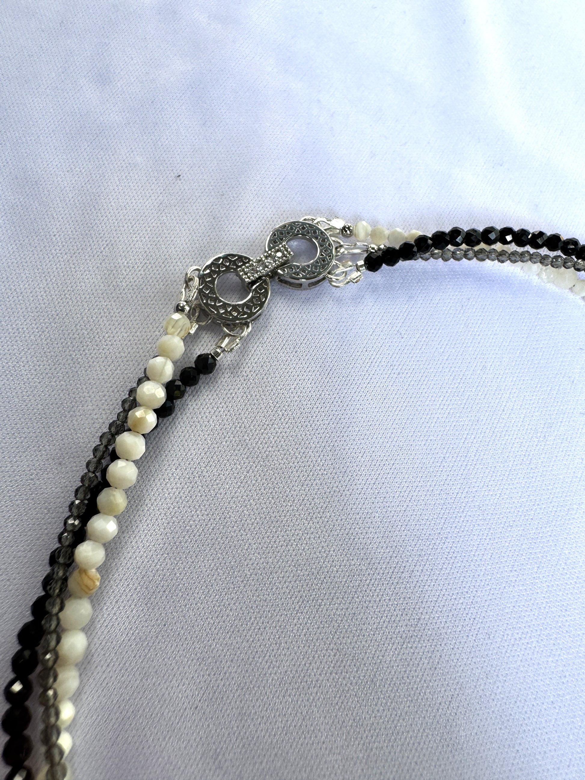Ce choker à trois rangs tisse un jeu de contrastes subtils entre la profondeur du spinelle noir, l’éclat fumé du spinelle gris et la douceur organique des perles de coquillage. Chaque fil raconte une nuance, chaque pierre révèle une texture. Ensemble, ils composent un bijou à la fois brut et raffiné.
