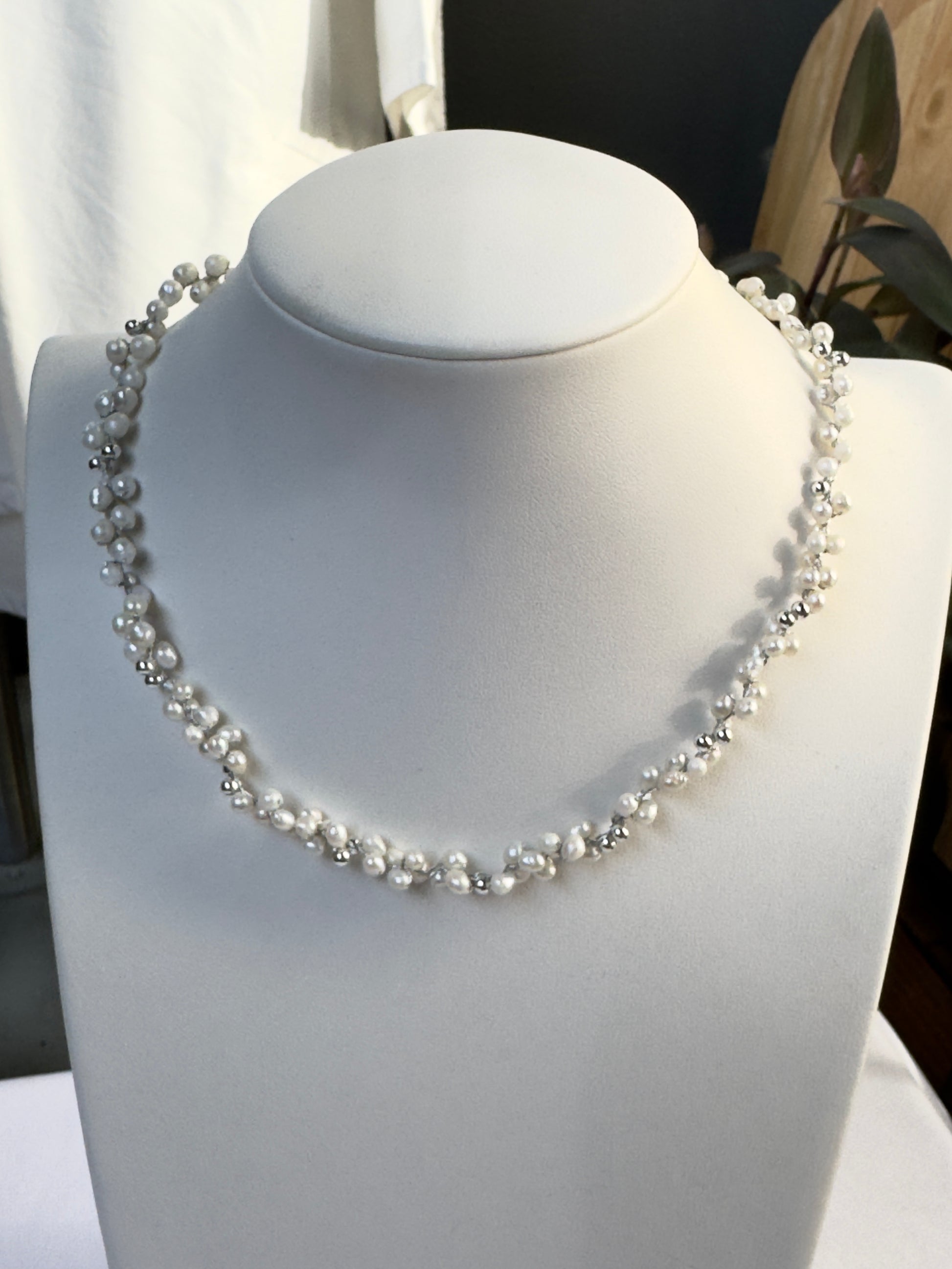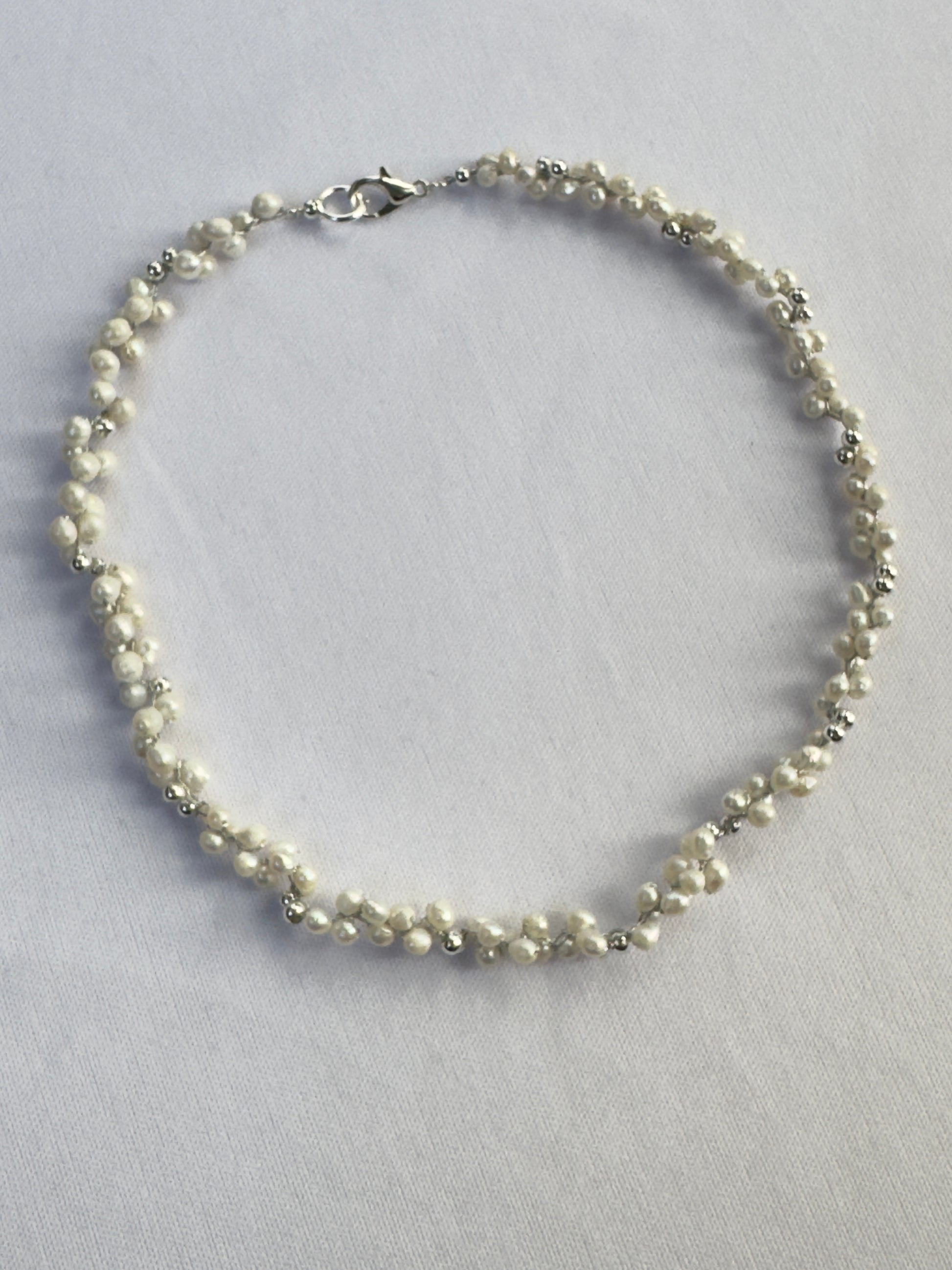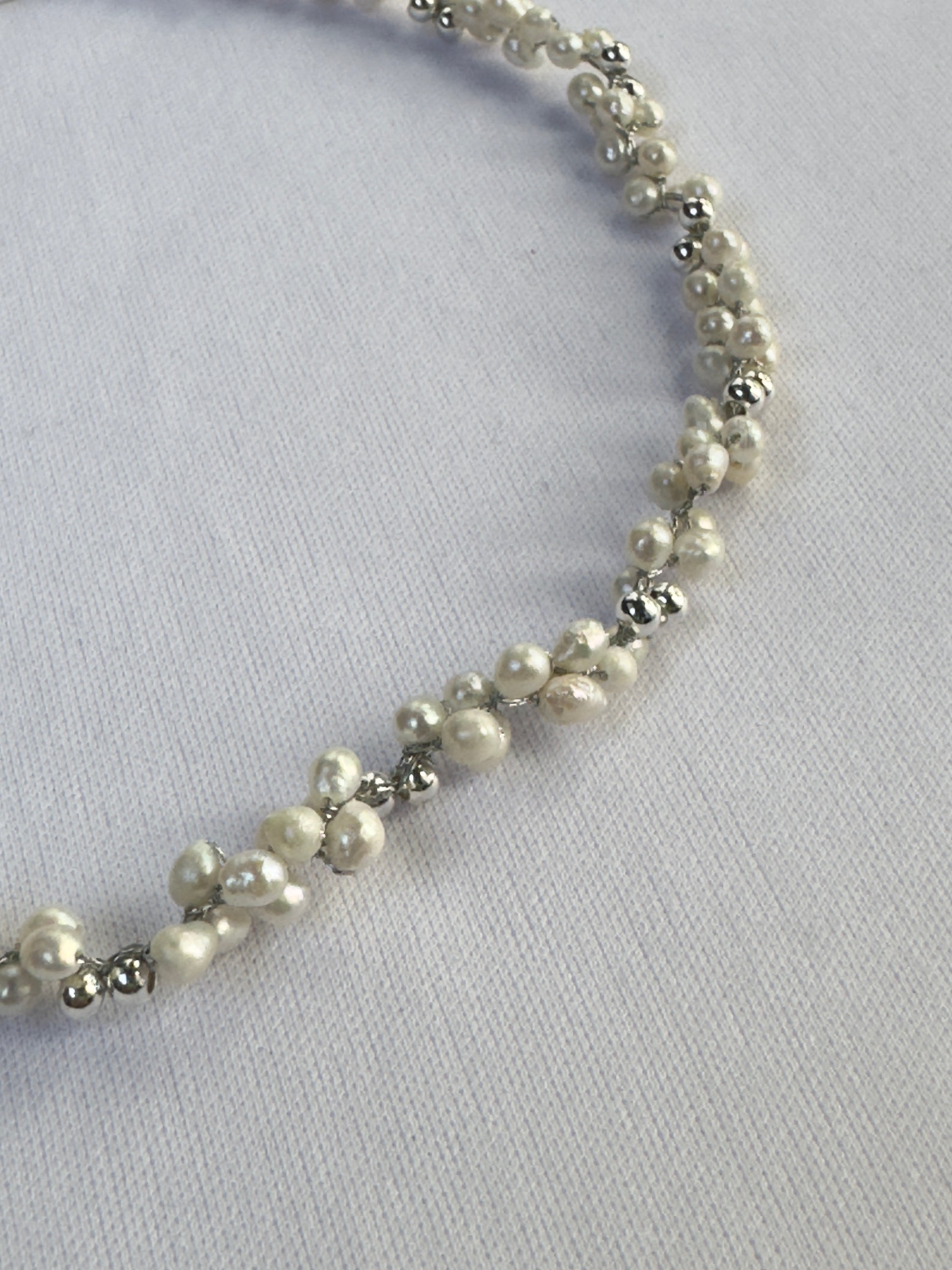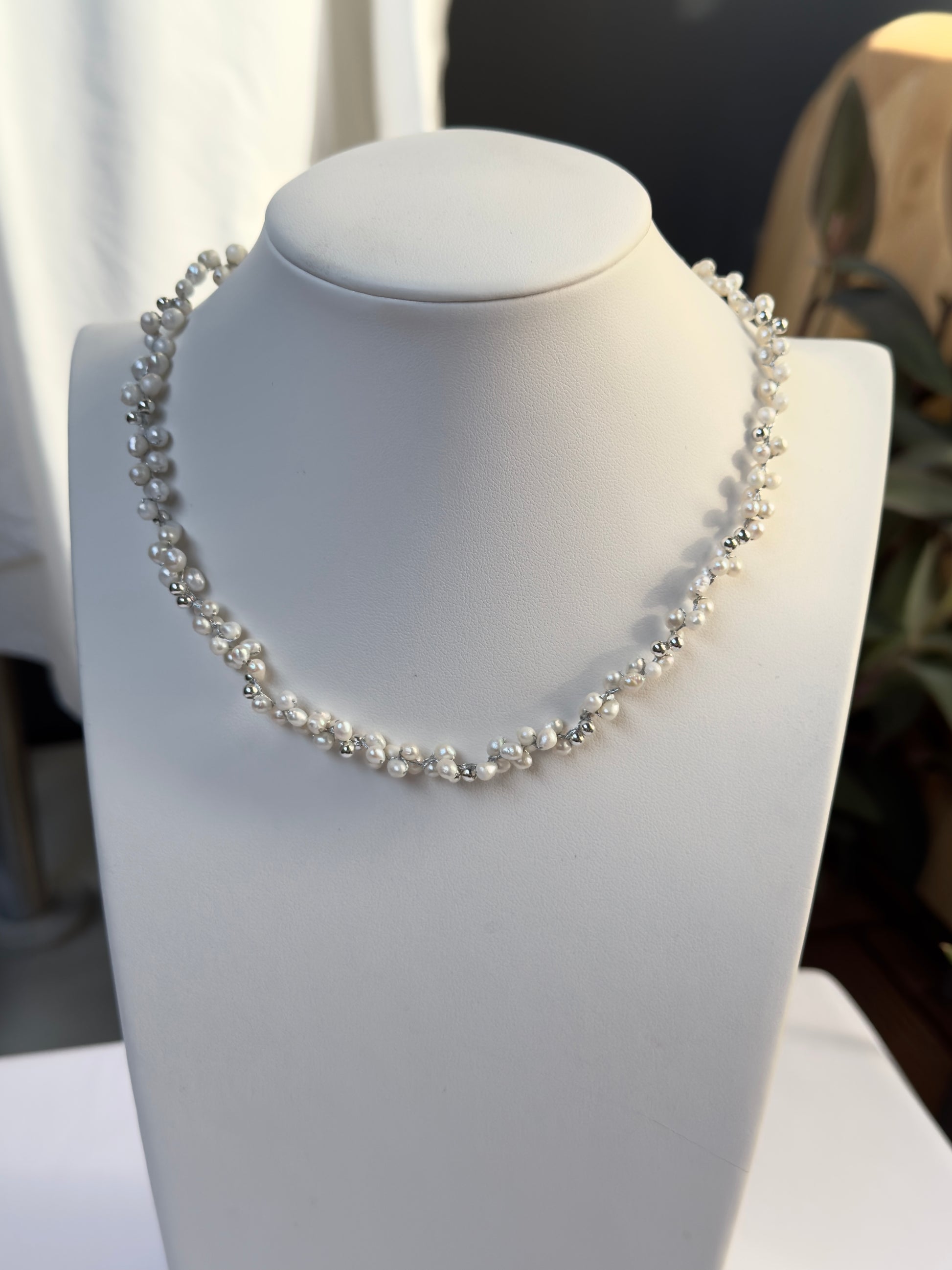 Un collier délicat où chaque perle de nacre blanche est subtilement reliée au crochet. Ce travail artisanal donne au bijou une allure légère, poétique et intemporelle.