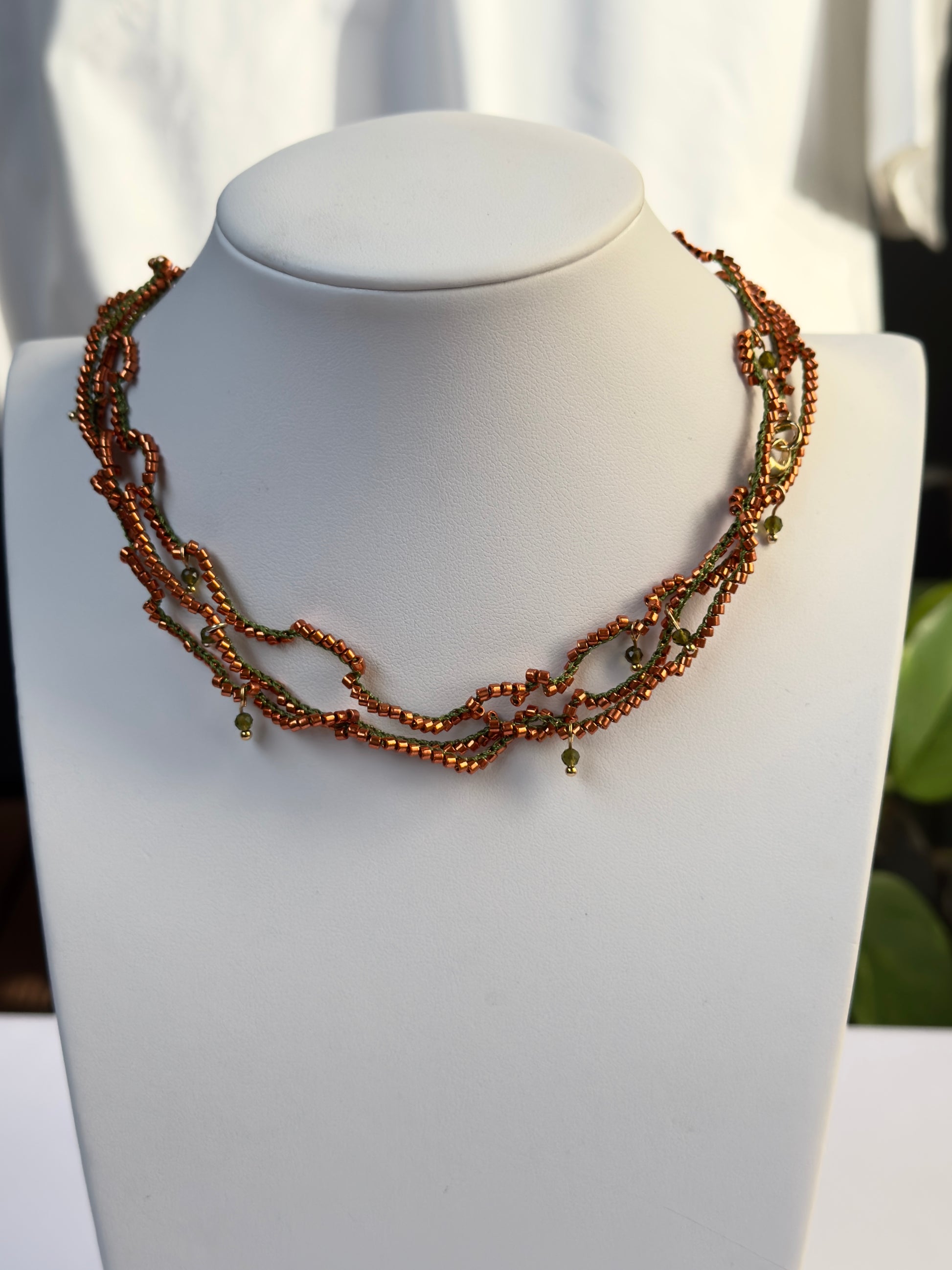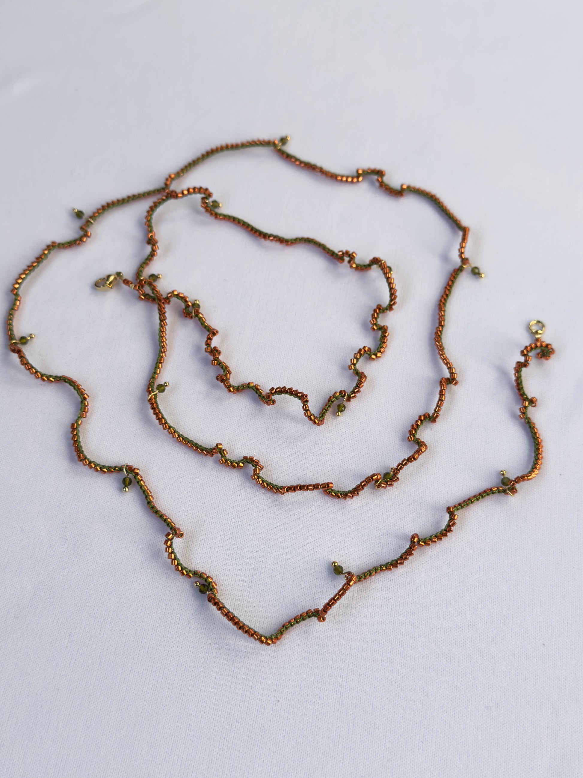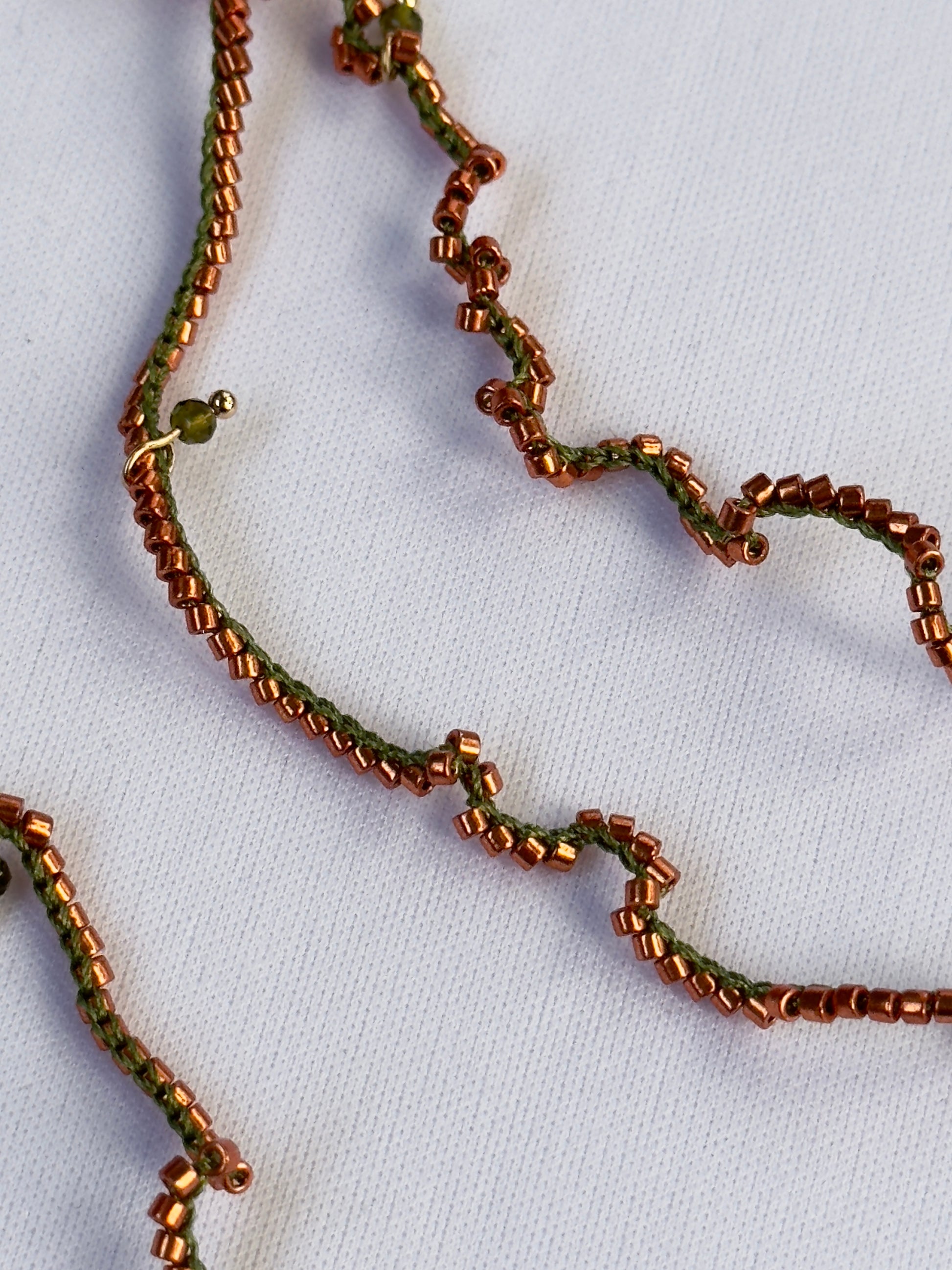 Ce collier long, crocheté à la main avec un fil de soie vert profond et des perles de verre orange vif, se distingue par sa finesse et sa légèreté. De délicates perles de spinelle parsèment l’ensemble pour une touche précieuse et lumineuse.