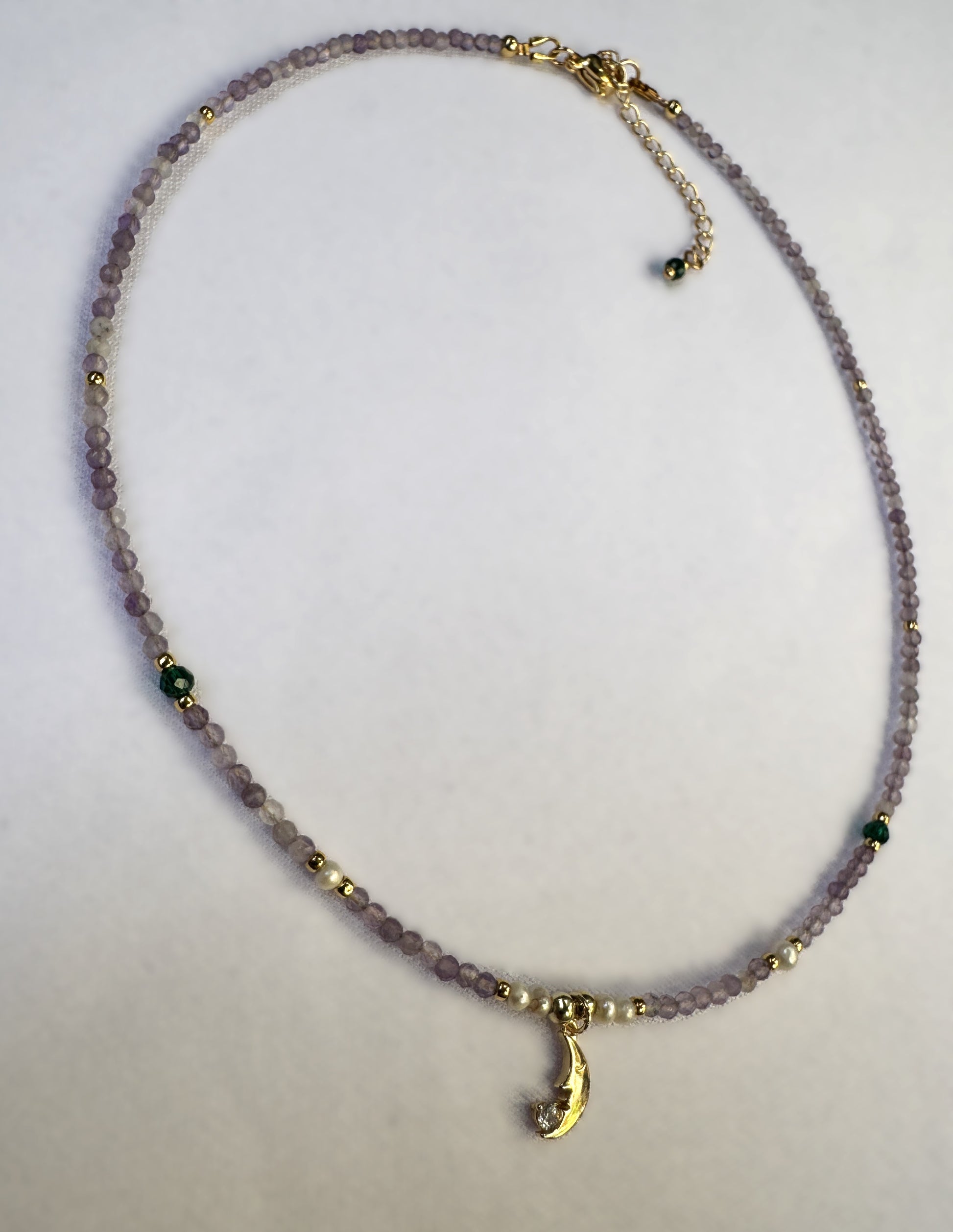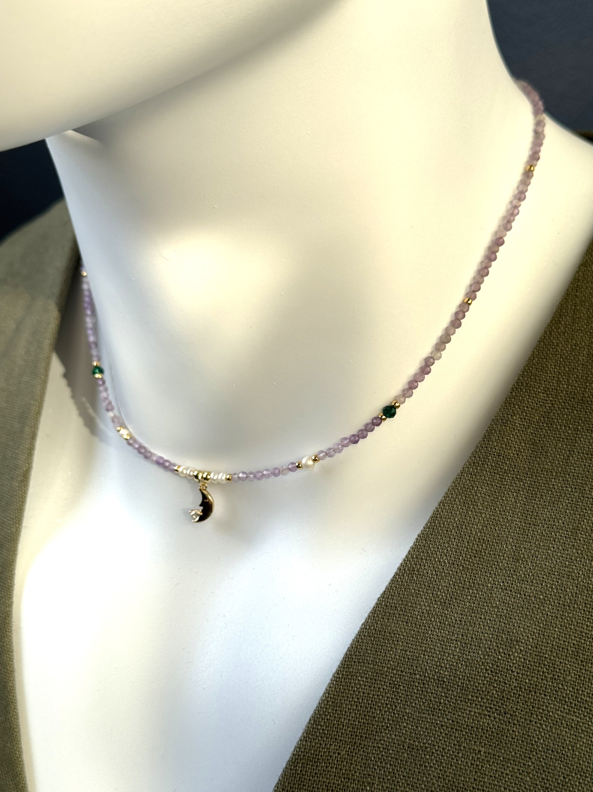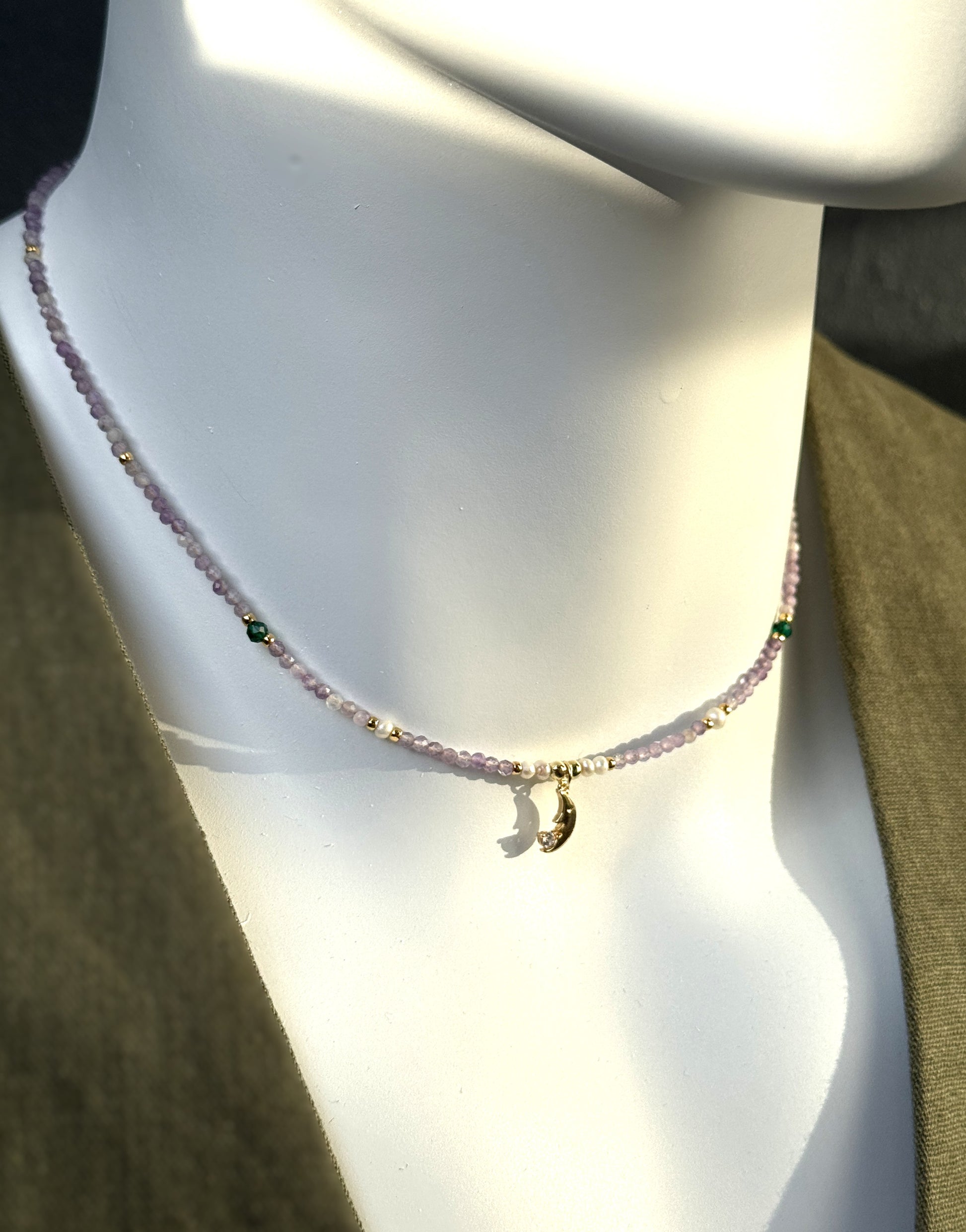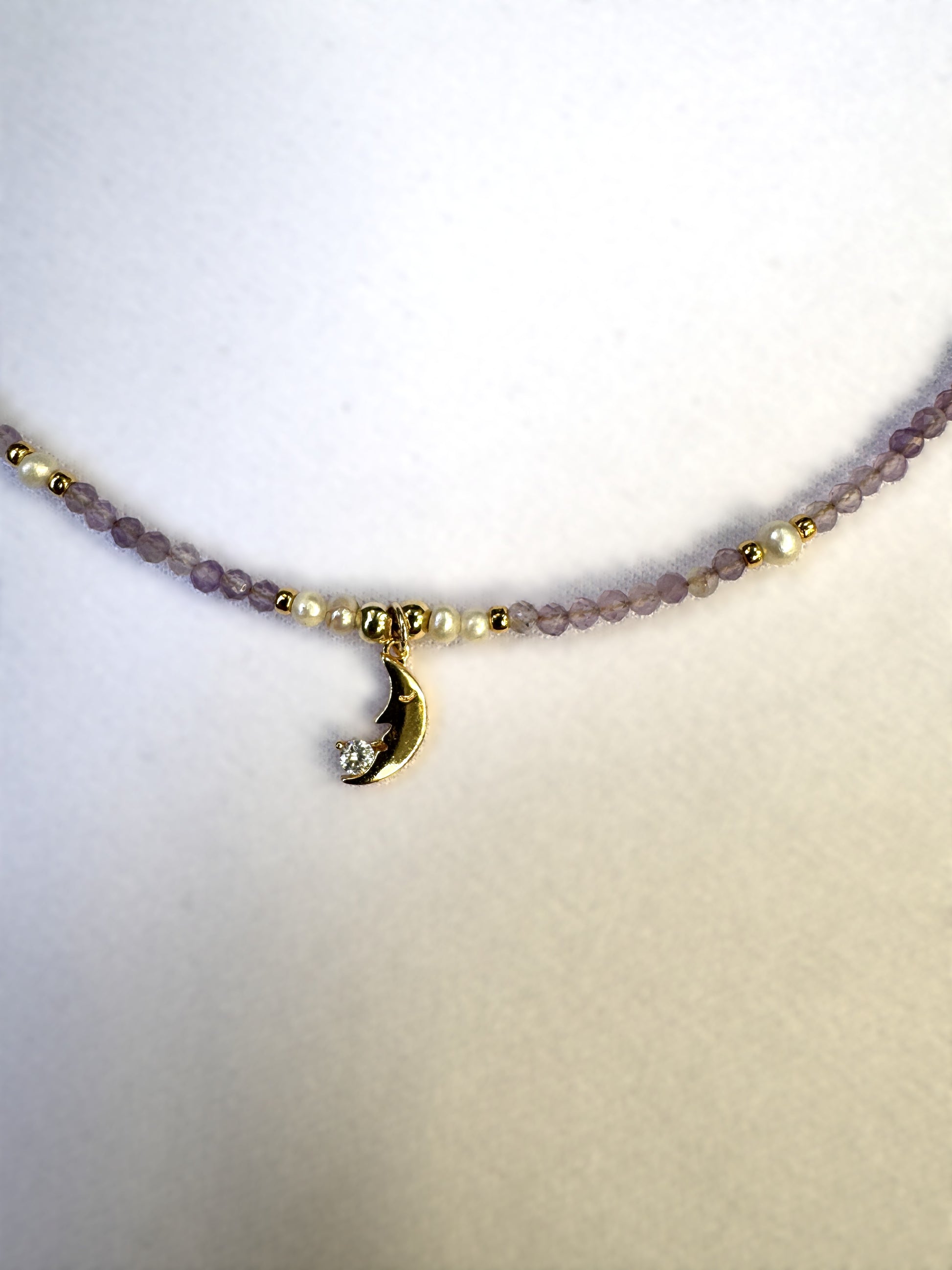 Ce collier fin et délicat est composé de perles d’améthyste de 2 mm, aux reflets violets profonds, symbole de calme et de spiritualité. Au centre, un pendentif en forme de lune ajoute une touche de mystère et de douceur céleste.