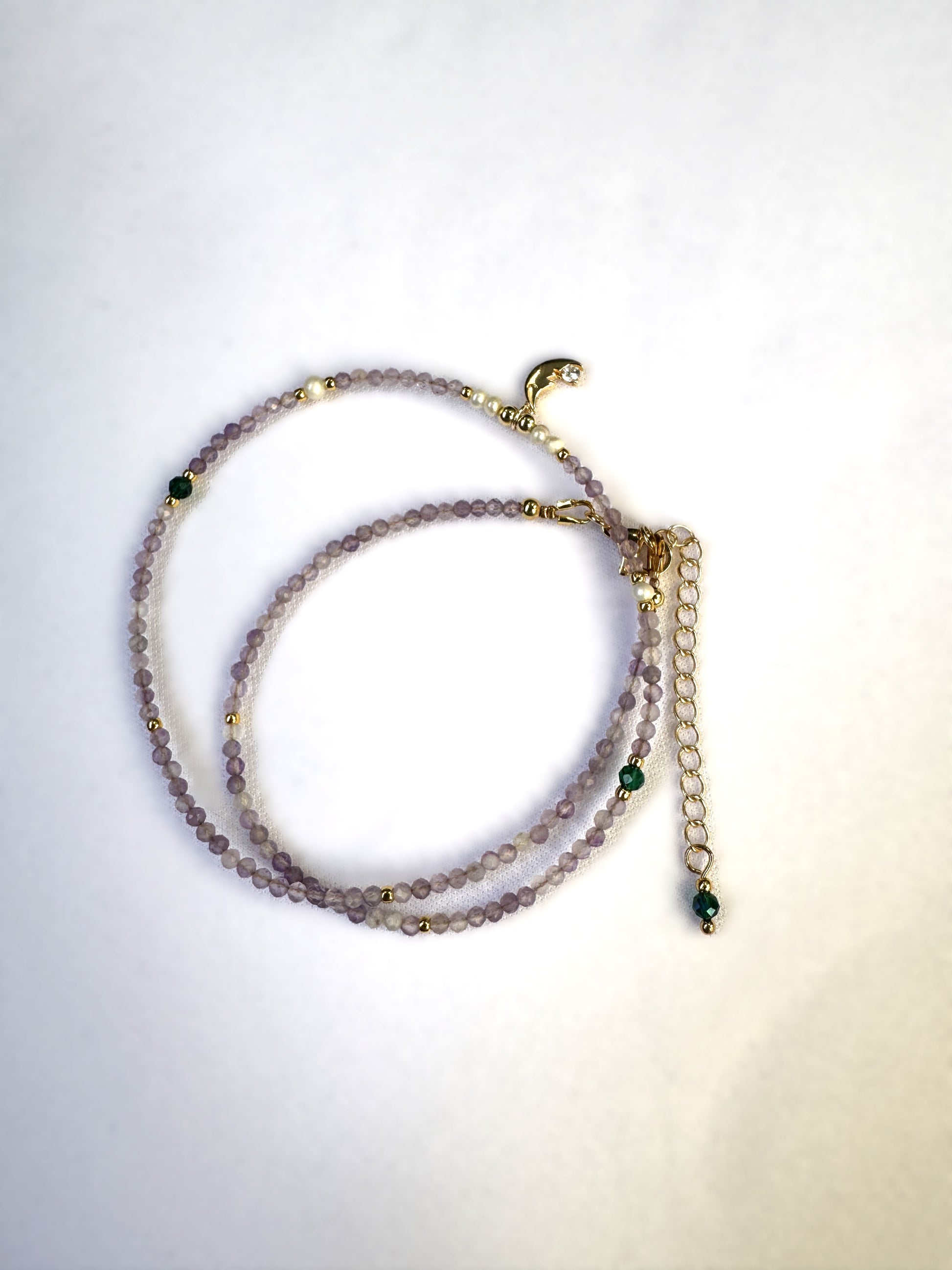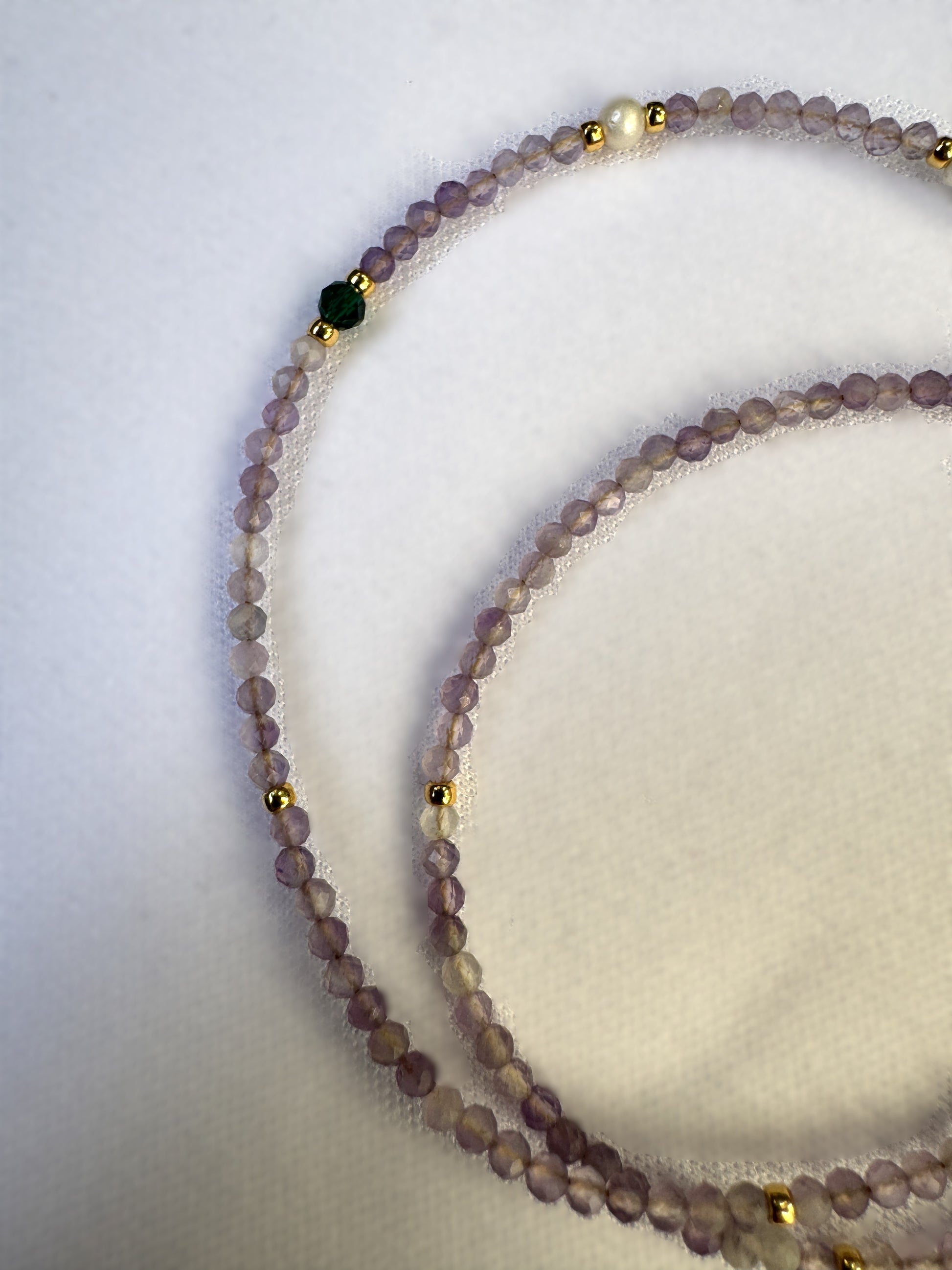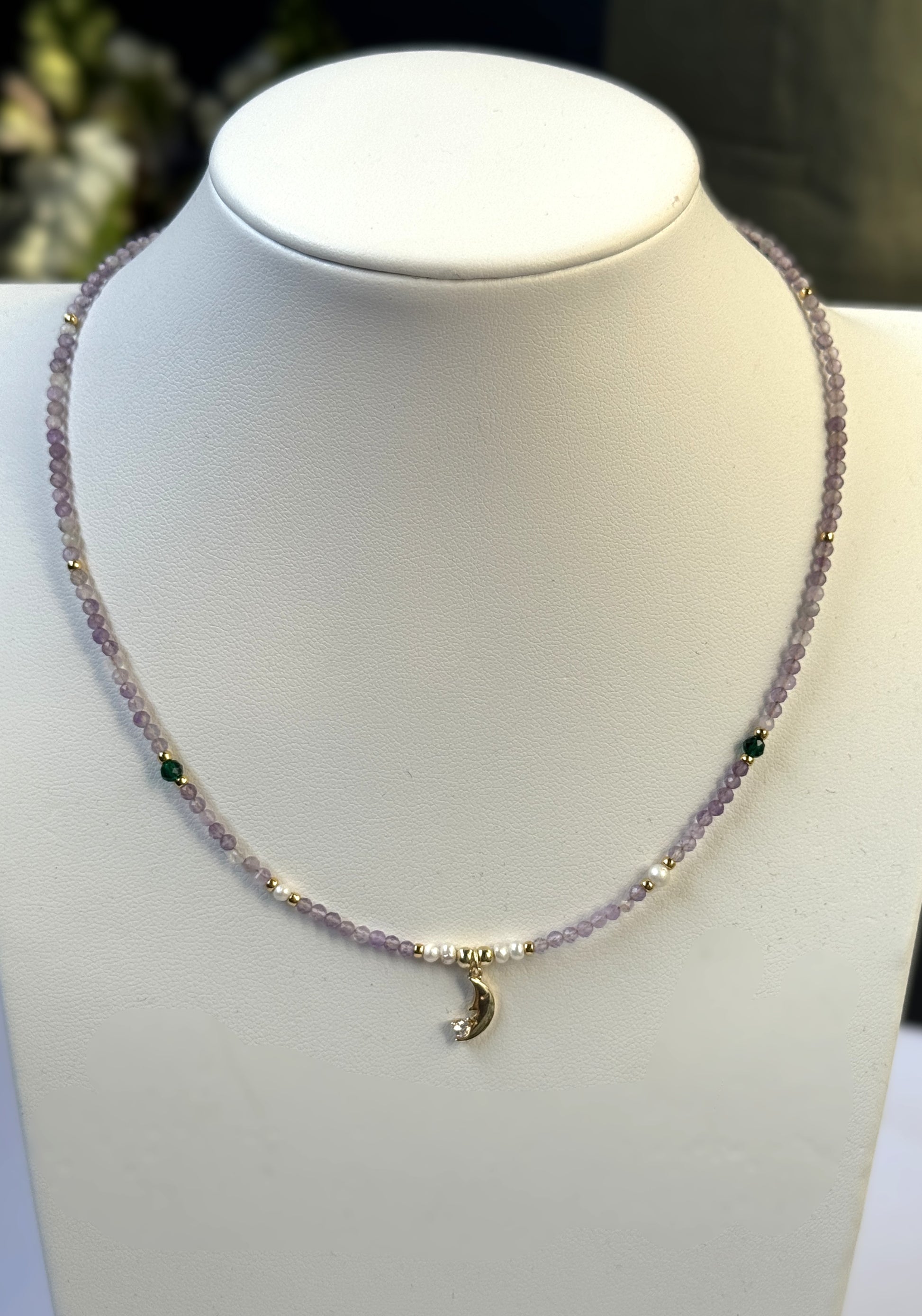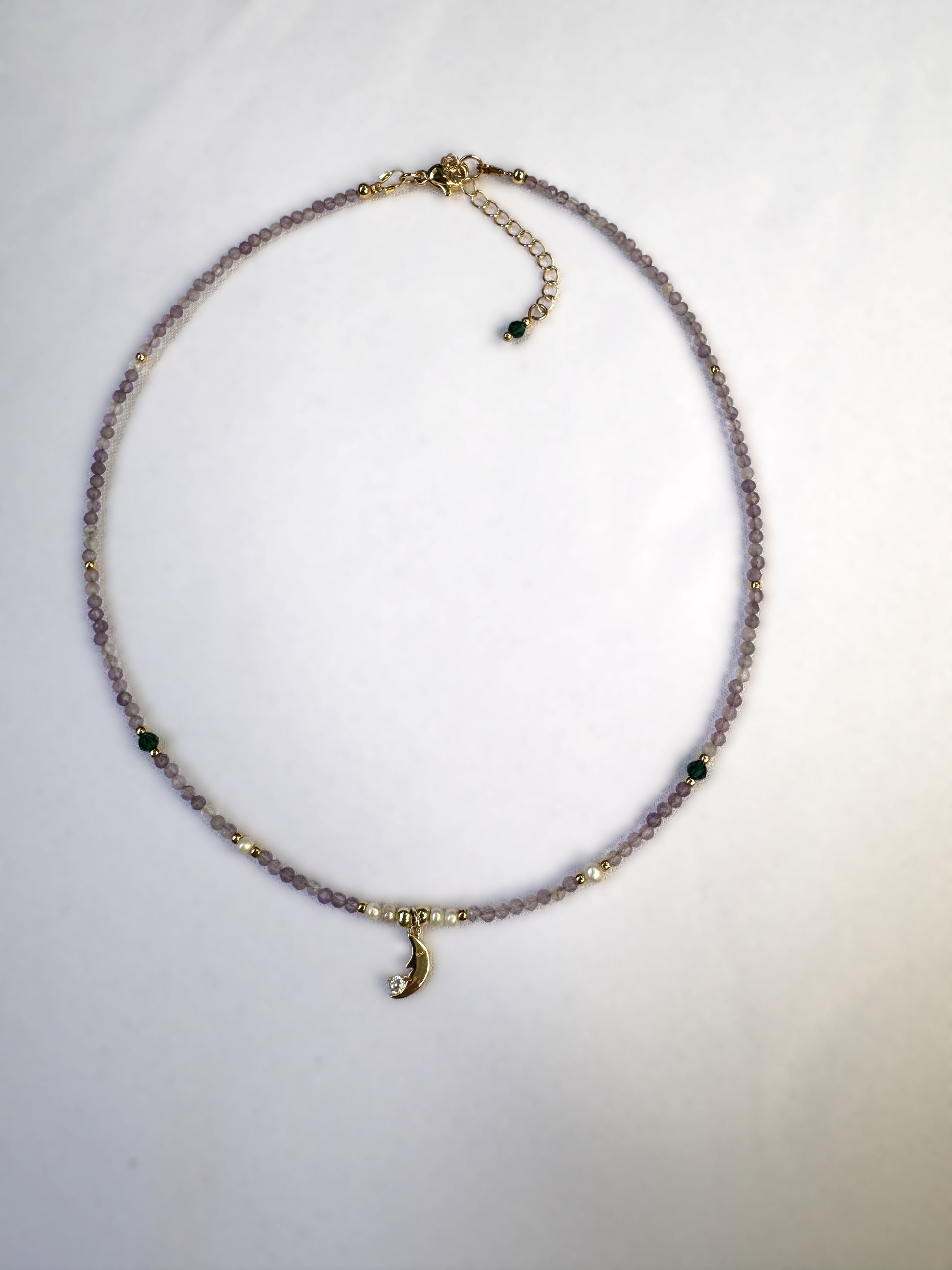 Ce collier fin et délicat est composé de perles d’améthyste de 2 mm, aux reflets violets profonds, symbole de calme et de spiritualité. Au centre, un pendentif en forme de lune ajoute une touche de mystère et de douceur céleste.