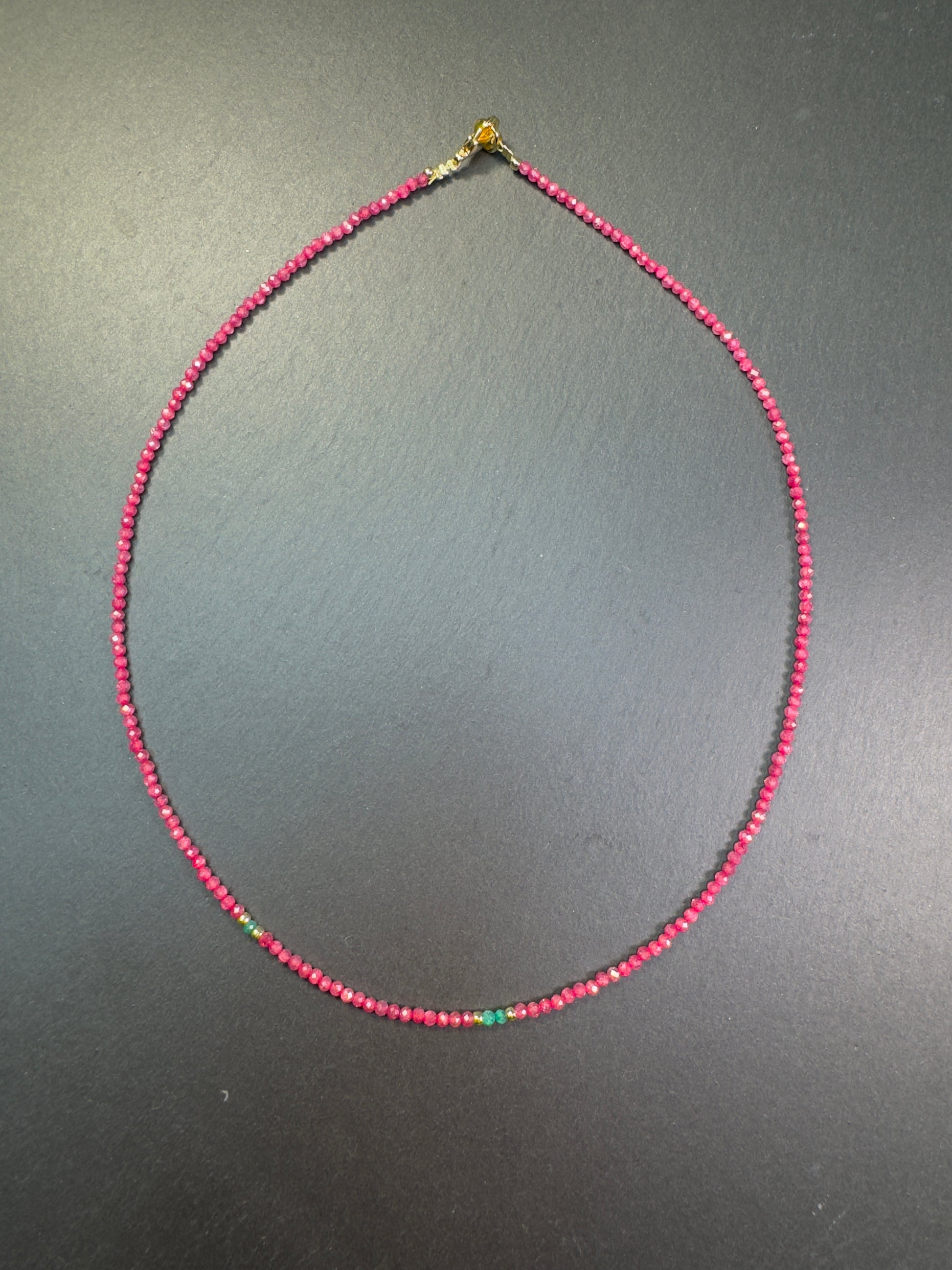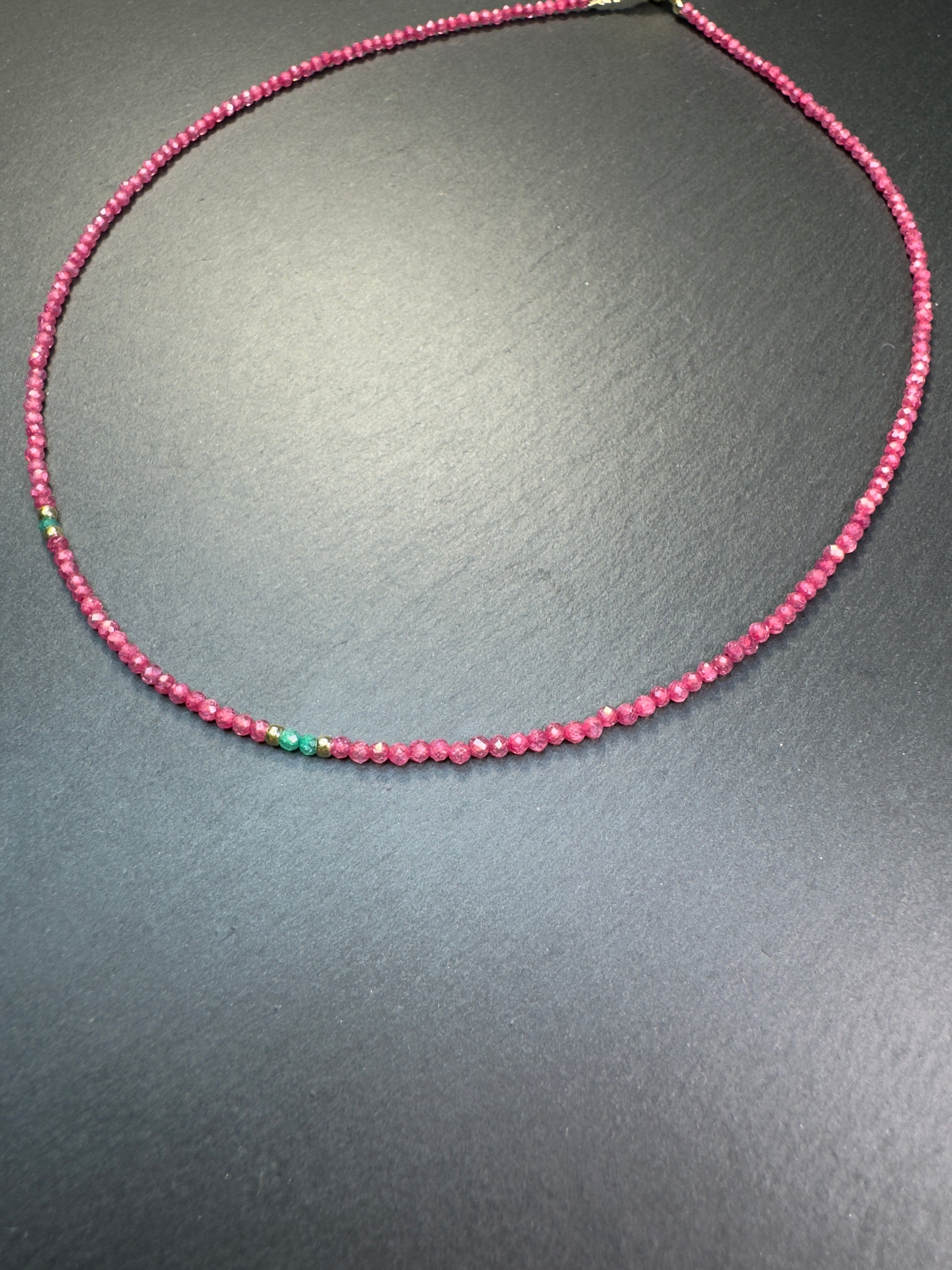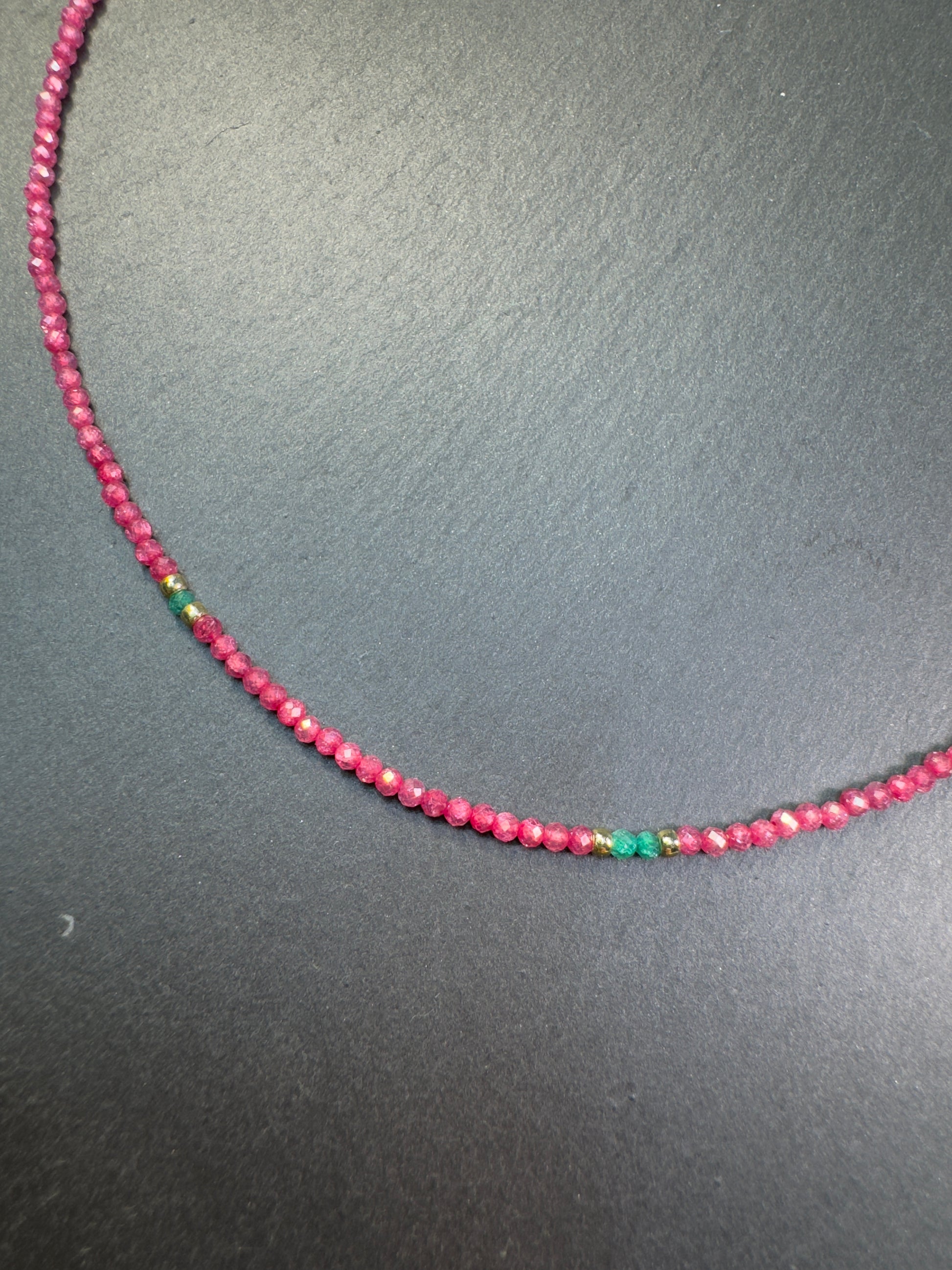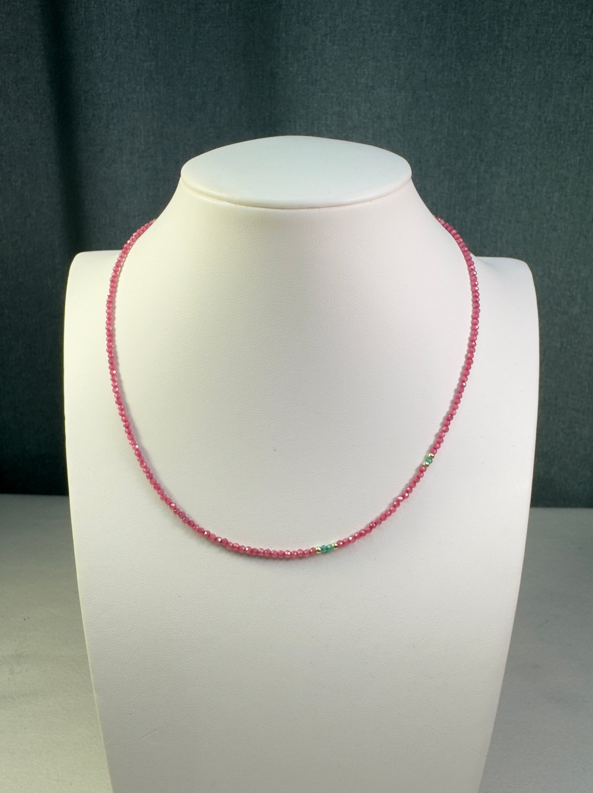 This refined necklace features dark pink zircon beads, delicately highlighted with a few green zircon beads for a subtle and elegant contrast. A unique piece, perfect for adding a touch of color and sophistication to any outfit.
