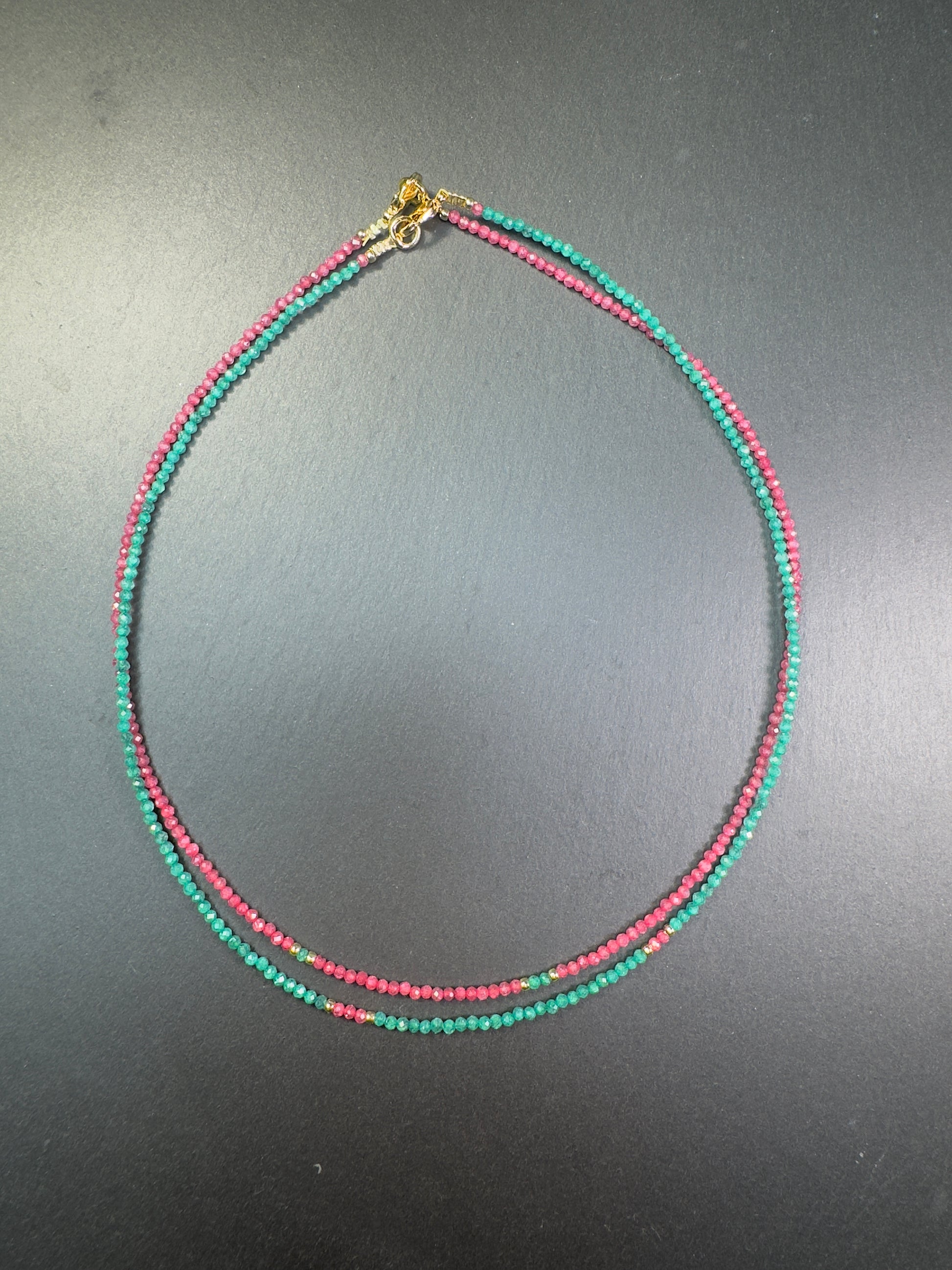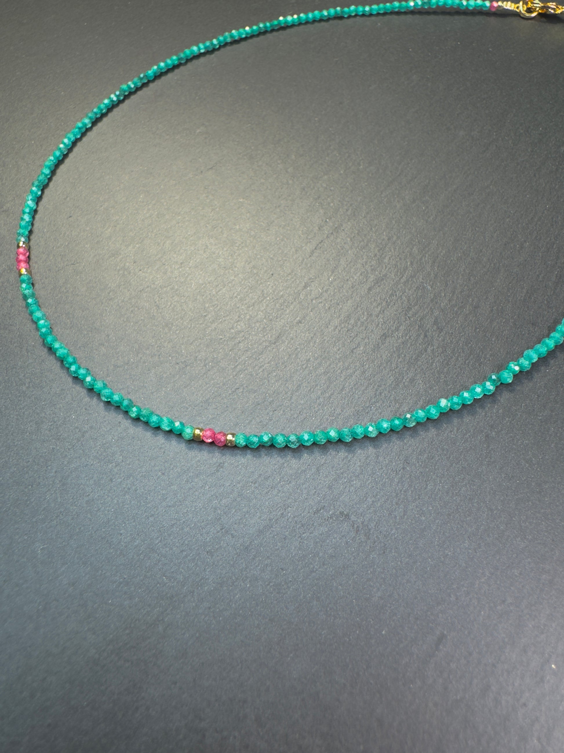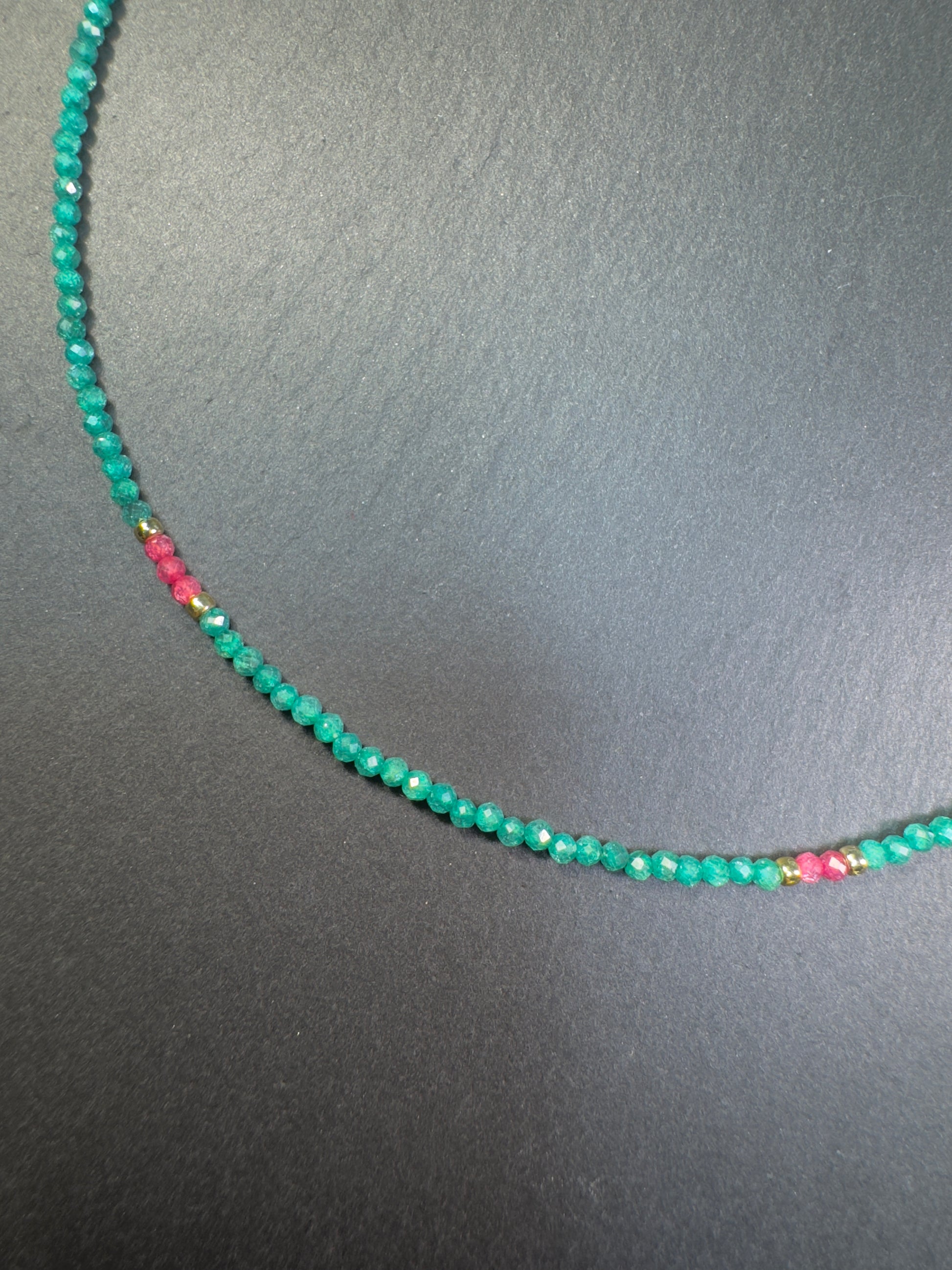 Élégant et délicat, ce collier est composé de perles de zircon vert éclatantes, rehaussées de quelques perles de zircon rose foncé qui apportent une subtile note de contraste. Un bijou raffiné, parfait pour illuminer vos tenues du quotidien comme vos occasions spéciales.