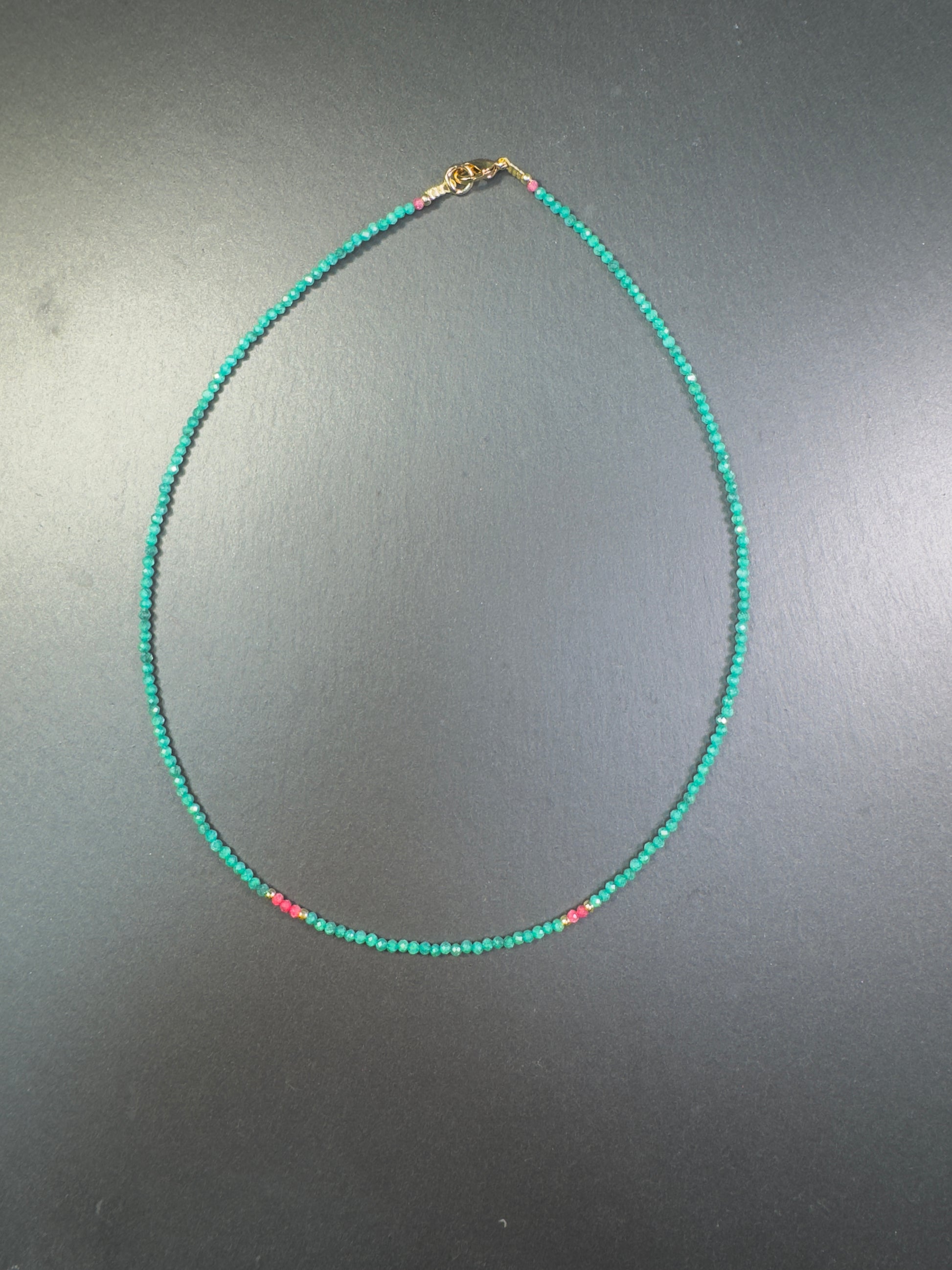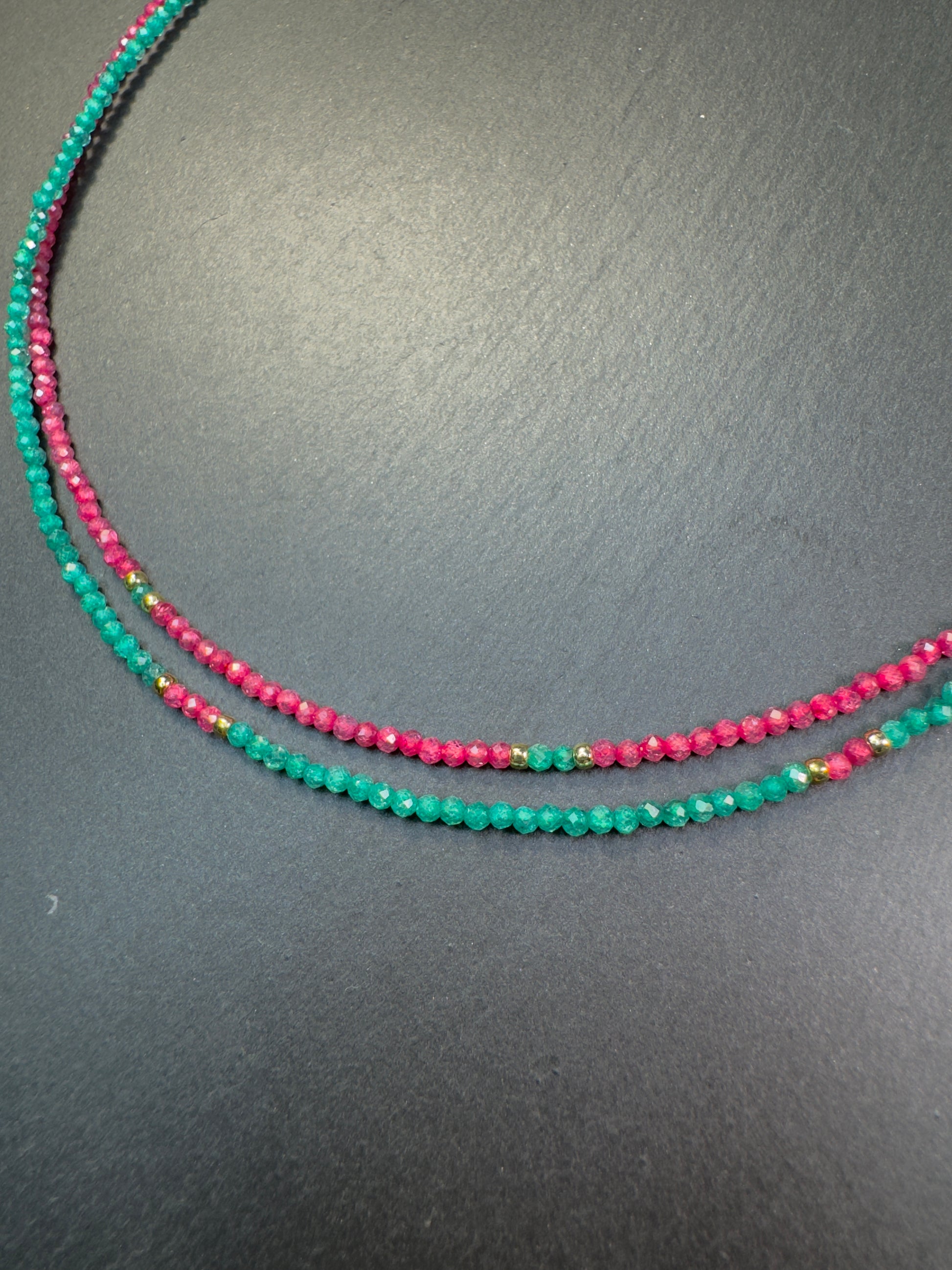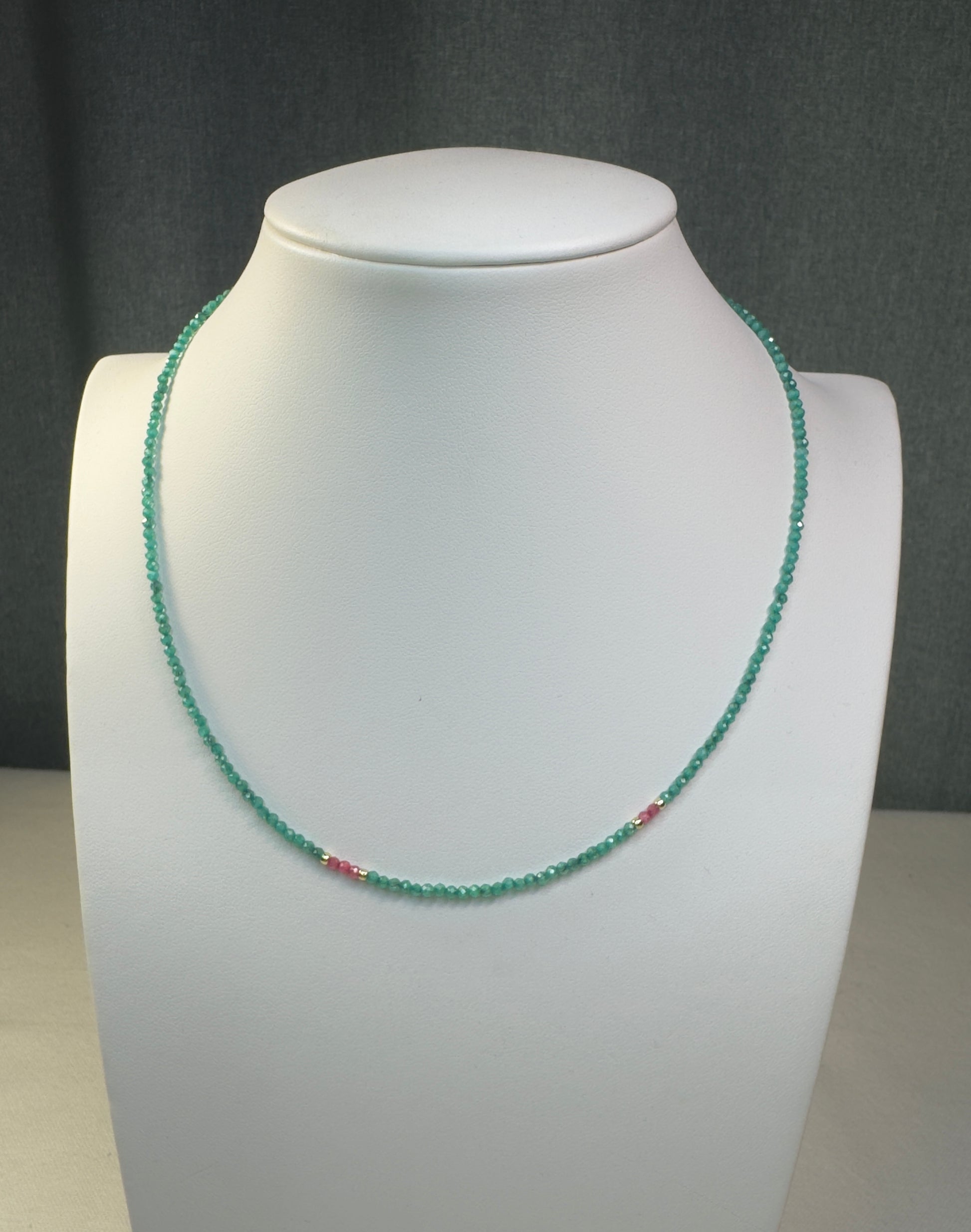 Élégant et délicat, ce collier est composé de perles de zircon vert éclatantes, rehaussées de quelques perles de zircon rose foncé qui apportent une subtile note de contraste. Un bijou raffiné, parfait pour illuminer vos tenues du quotidien comme vos occasions spéciales.