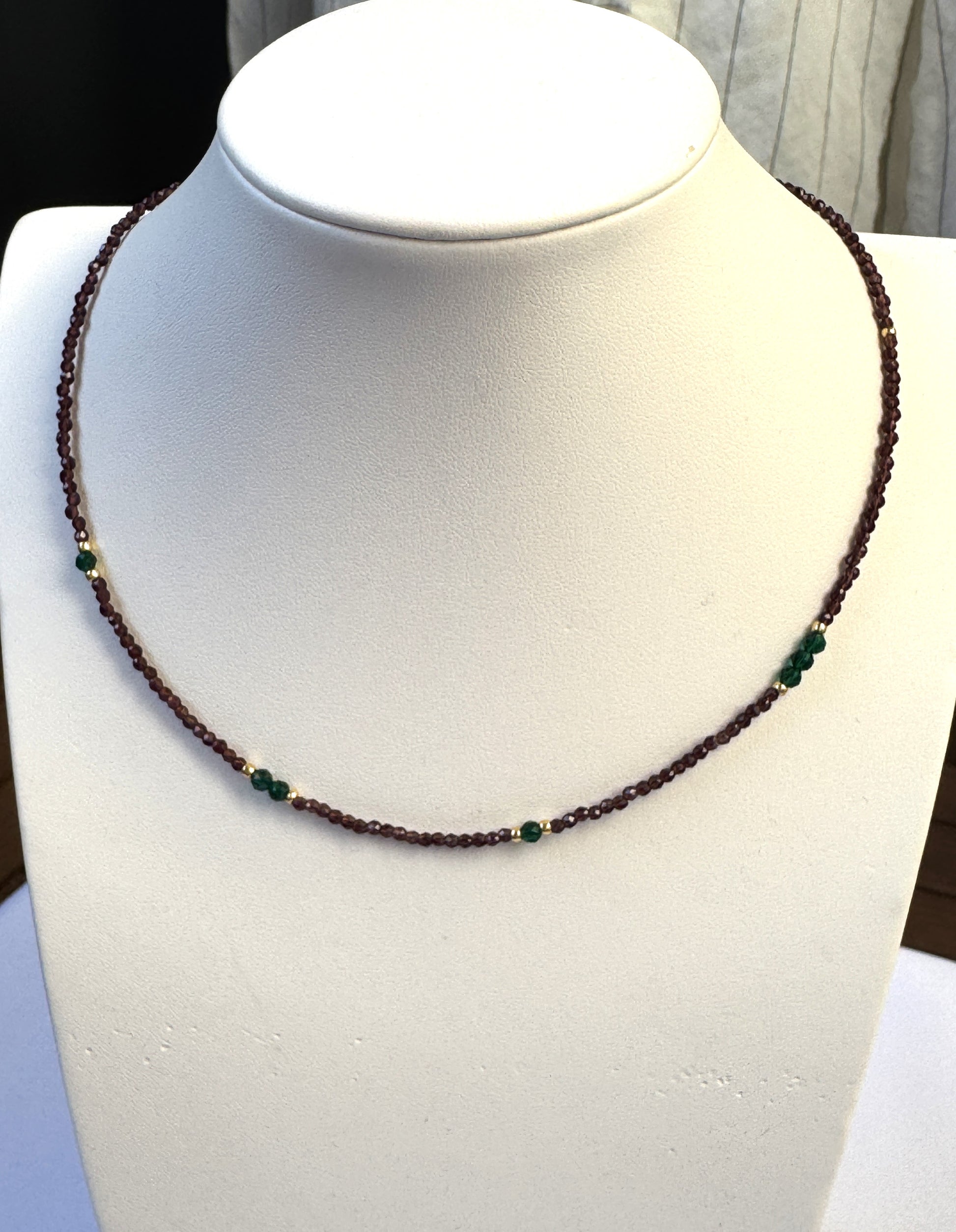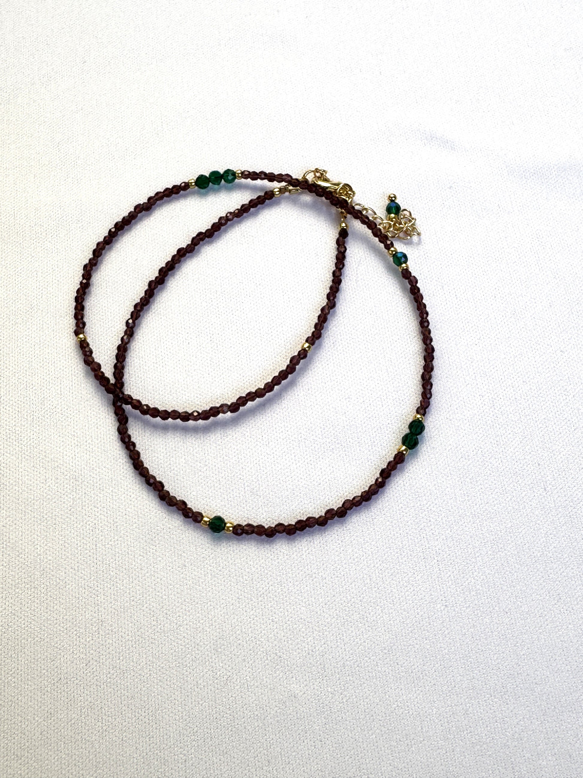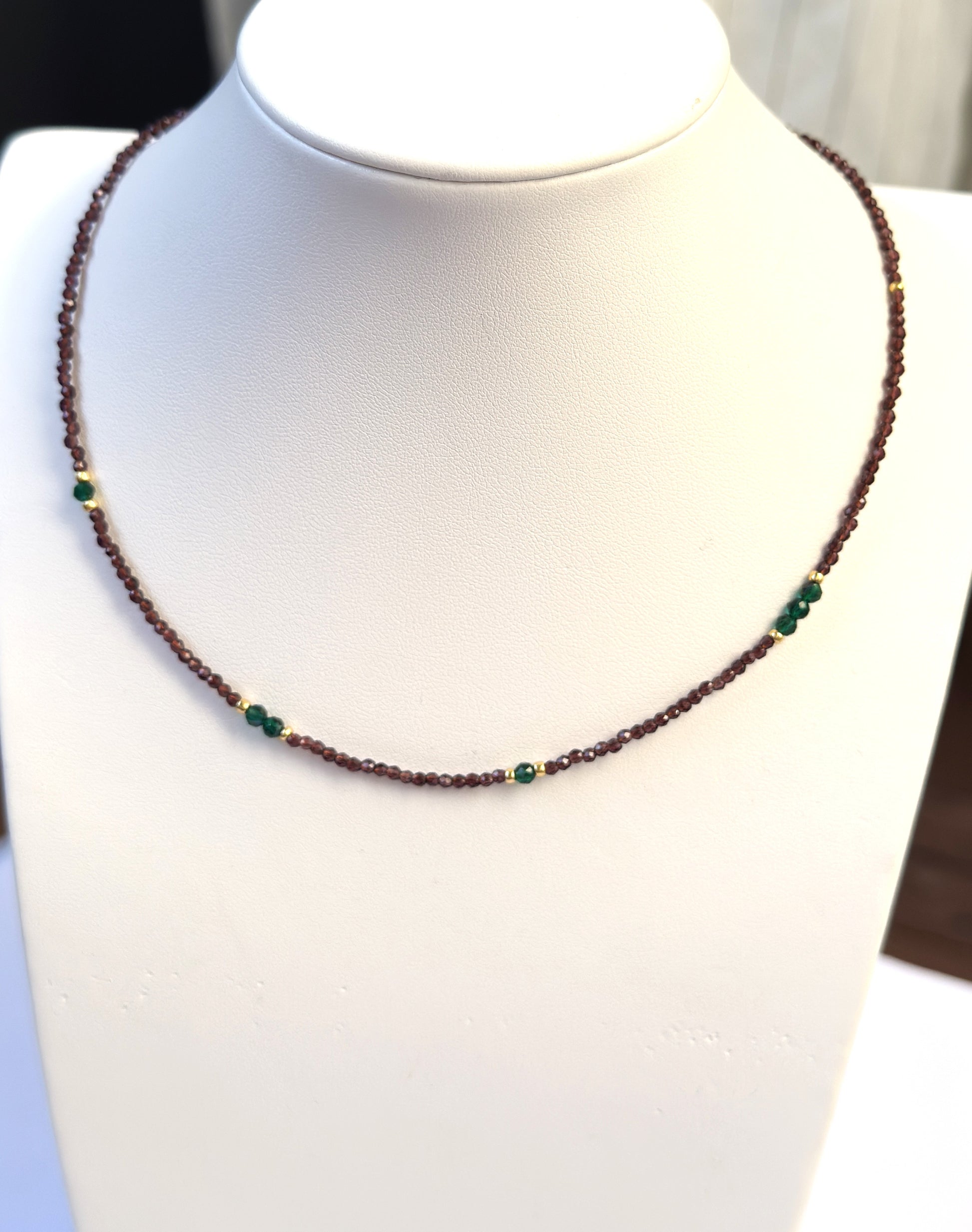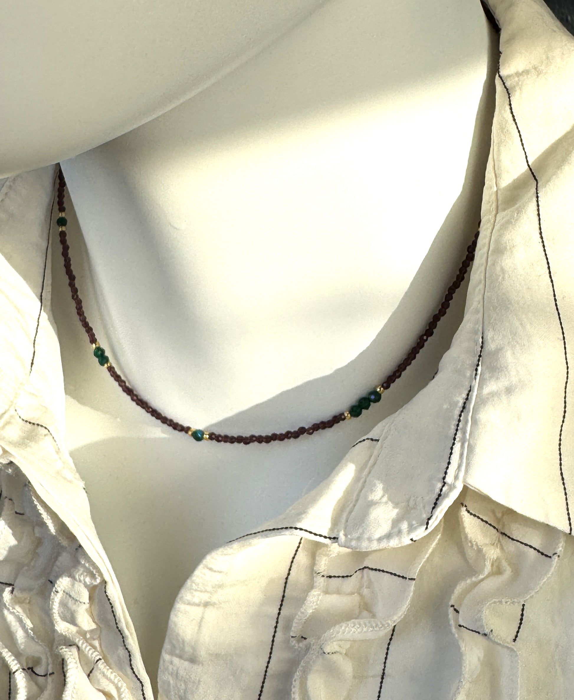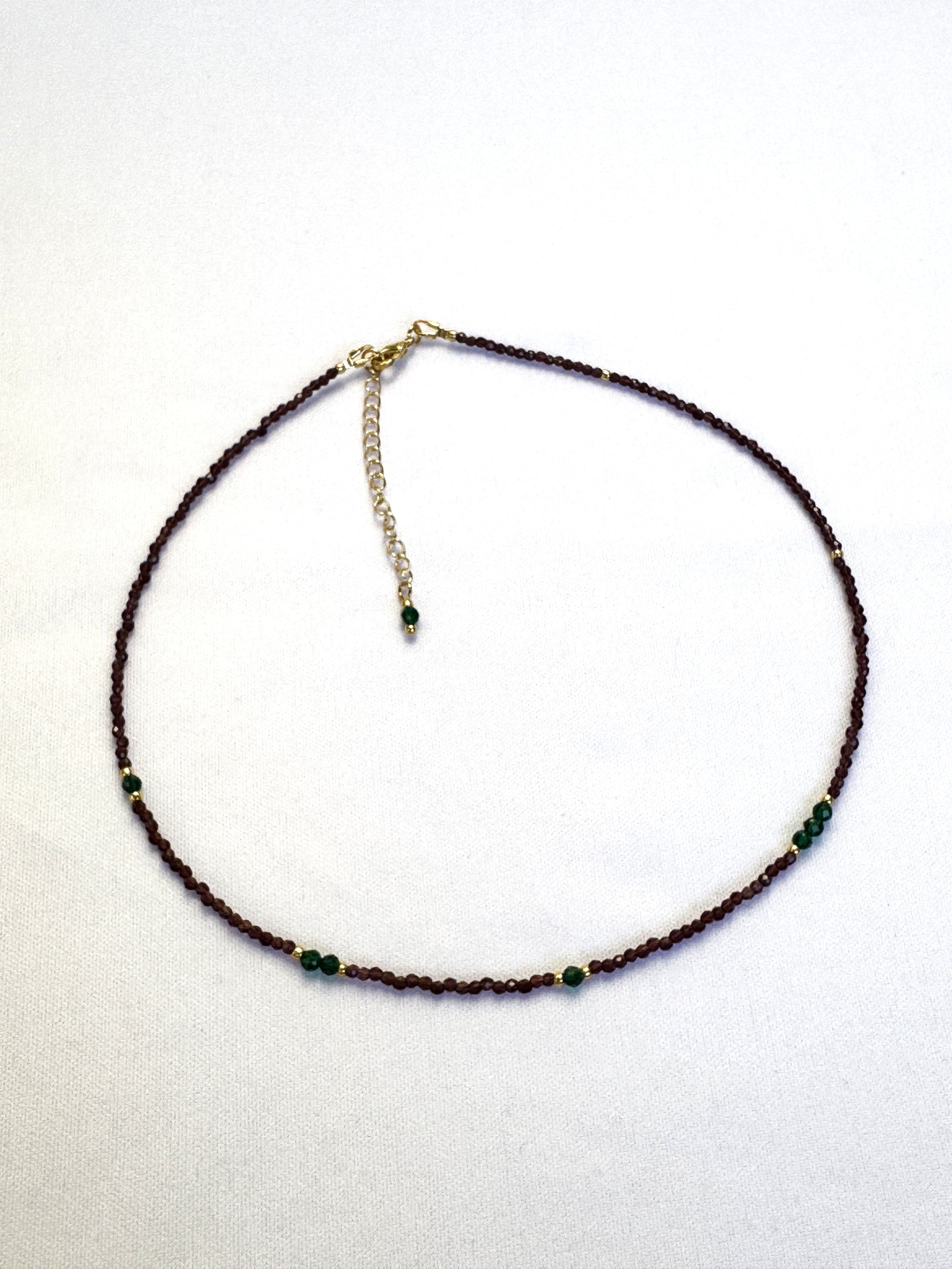 Ce collier fin et chaleureux est composé de perles de spinelle brun, relevées de subtiles touches de spinelle vert. Une harmonie de couleurs naturelles, entre terre et feuillage, qui évoque la douceur de l’automne et l’élégance organique.
