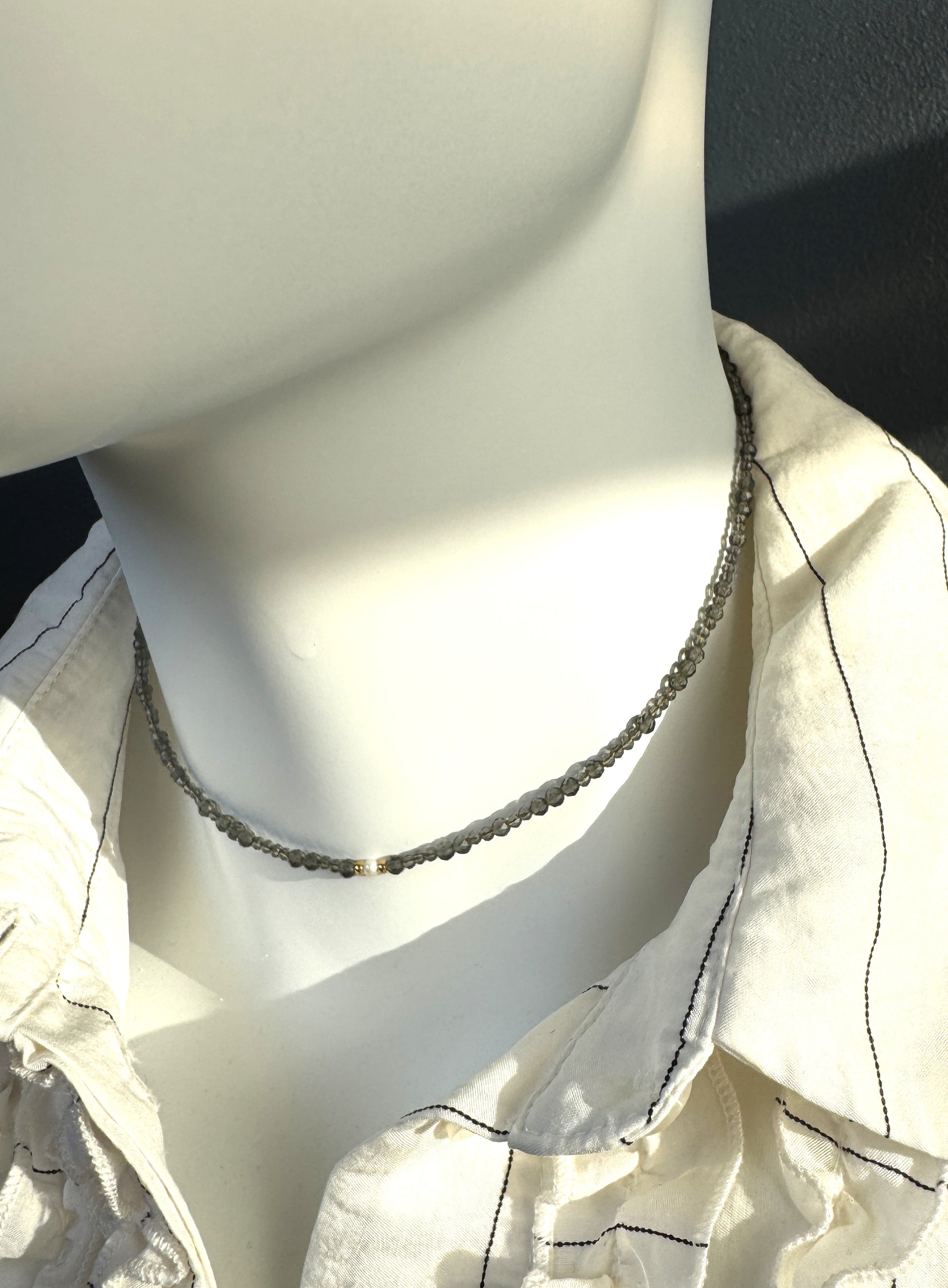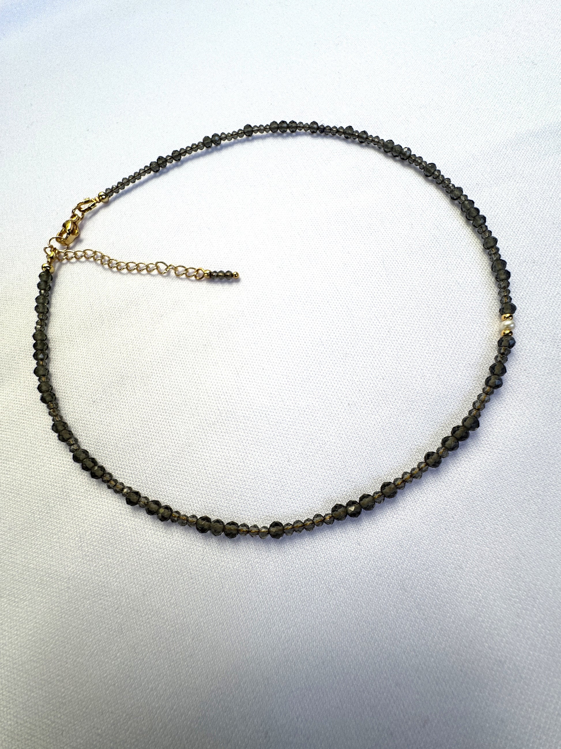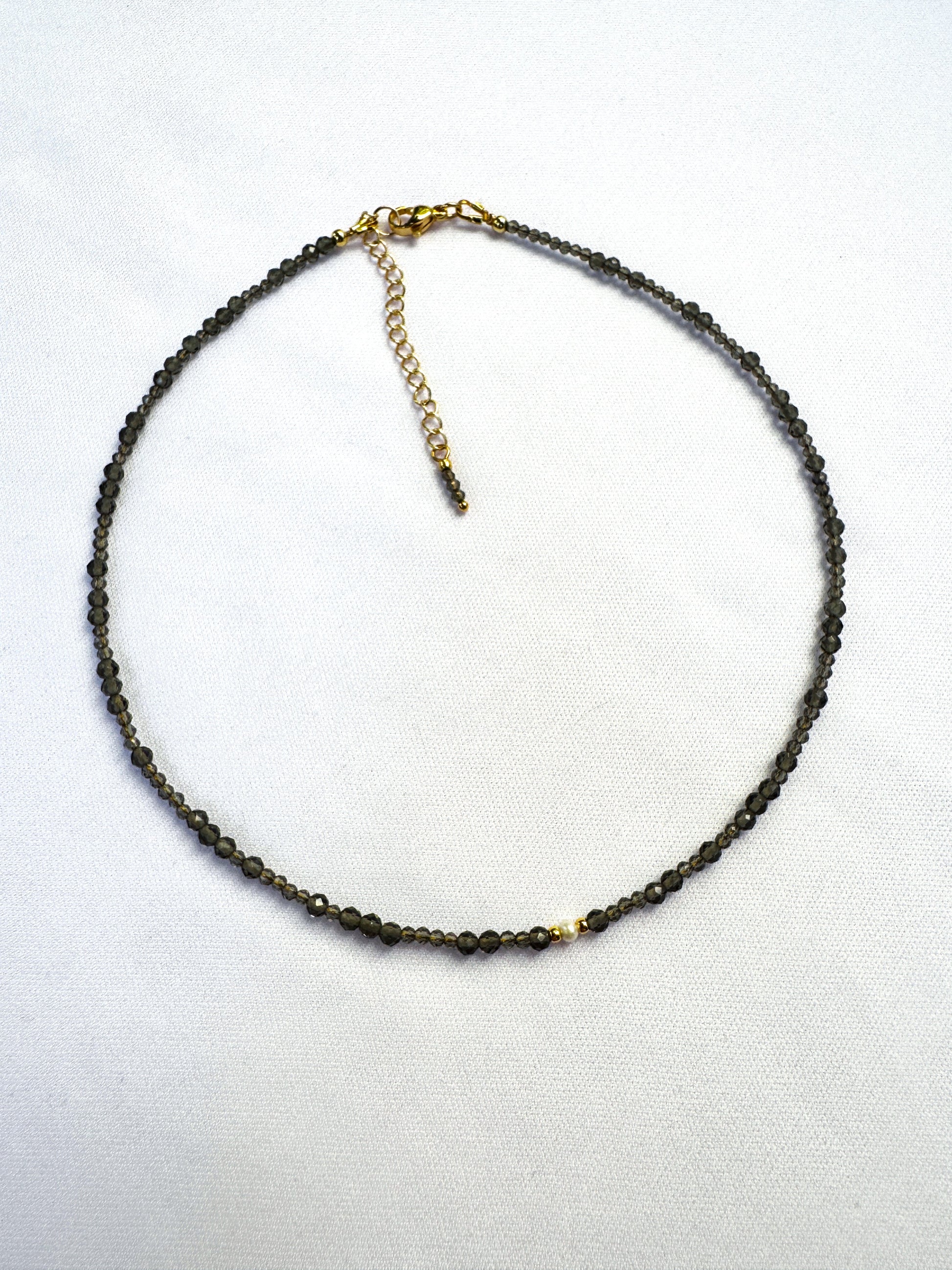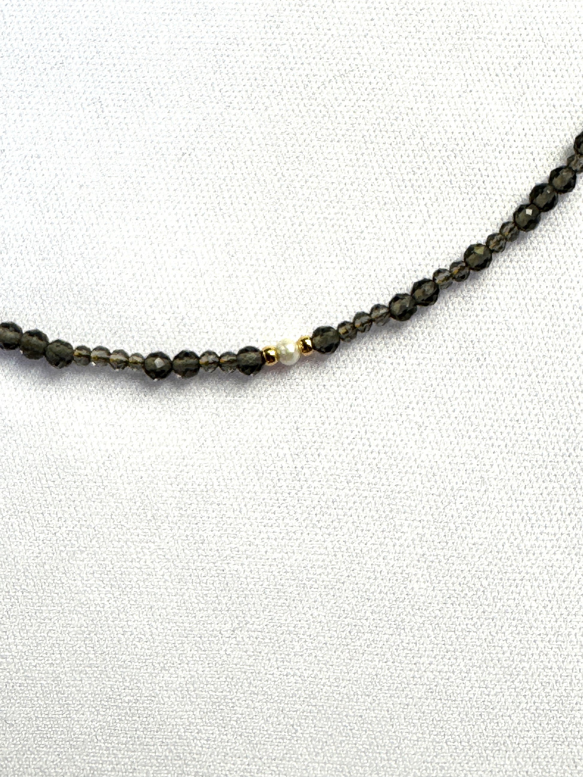 Ce collier délicat marie l’éclat subtil du spinelle gris (perles de 2 et 3 mm) à la douceur d’une perle d’eau douce placée au centre. Une composition épurée, où chaque détail est pensé pour refléter la lumière avec discrétion et élégance.
